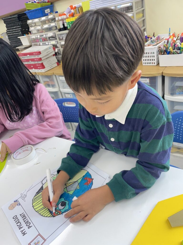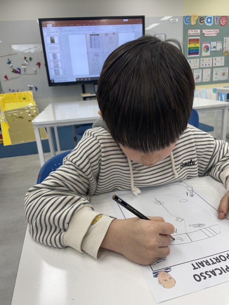 Next, the children drew their own portraits on paper, trying out the idea of breaking and rearranging facial features just like Picasso did.