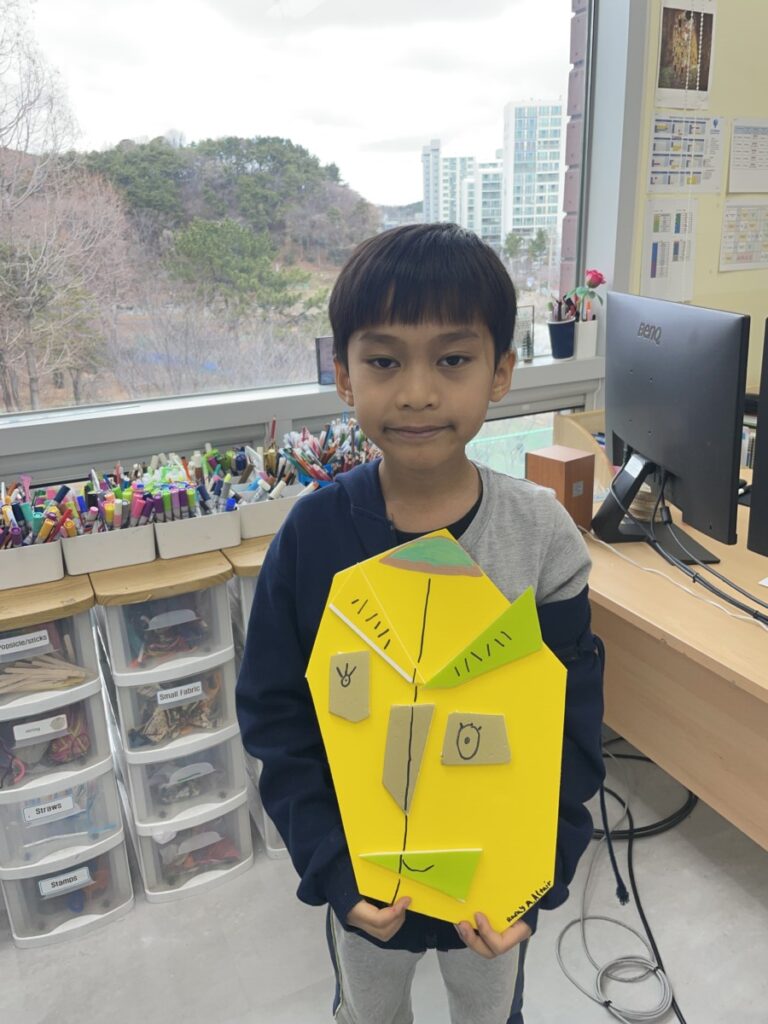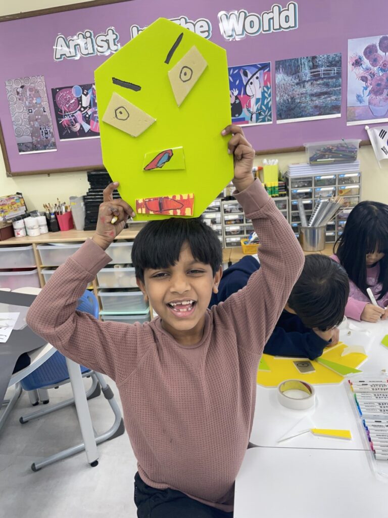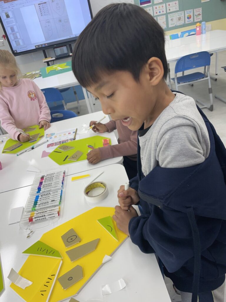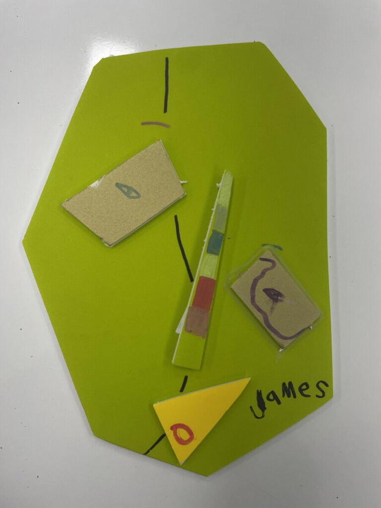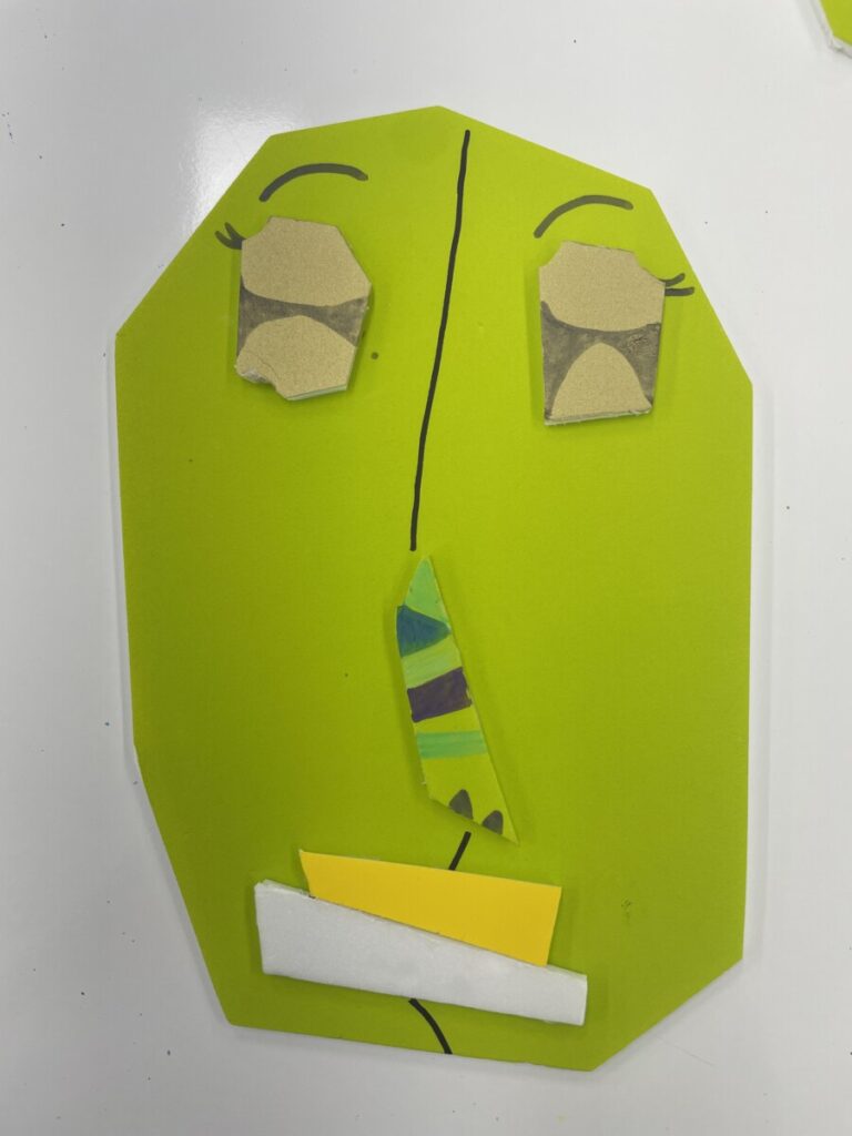 Students began by exploring how facial features such as the eyes, nose, and mouth can be placed in unusual positions. Using foam board shapes, they experimented with arranging these features in different ways, creating playful and imaginative Picasso-inspired faces.