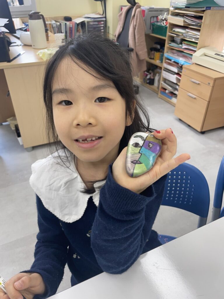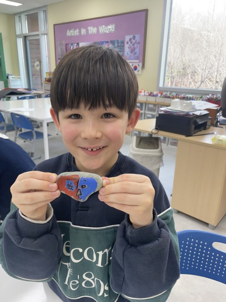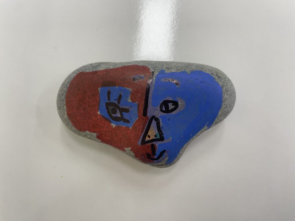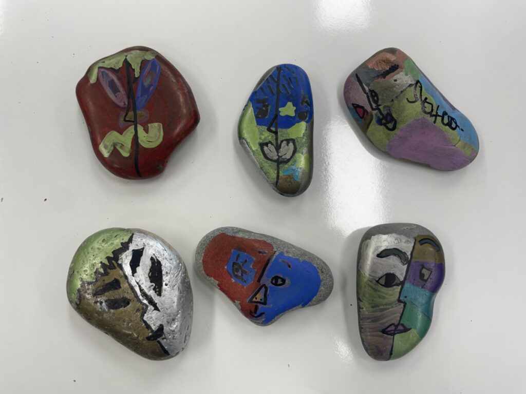 To extend the activity further, students also painted Cubist-style faces on small stones. This allowed them to explore shape, colour, and composition on a different surface while continuing to experiment with abstract facial designs.