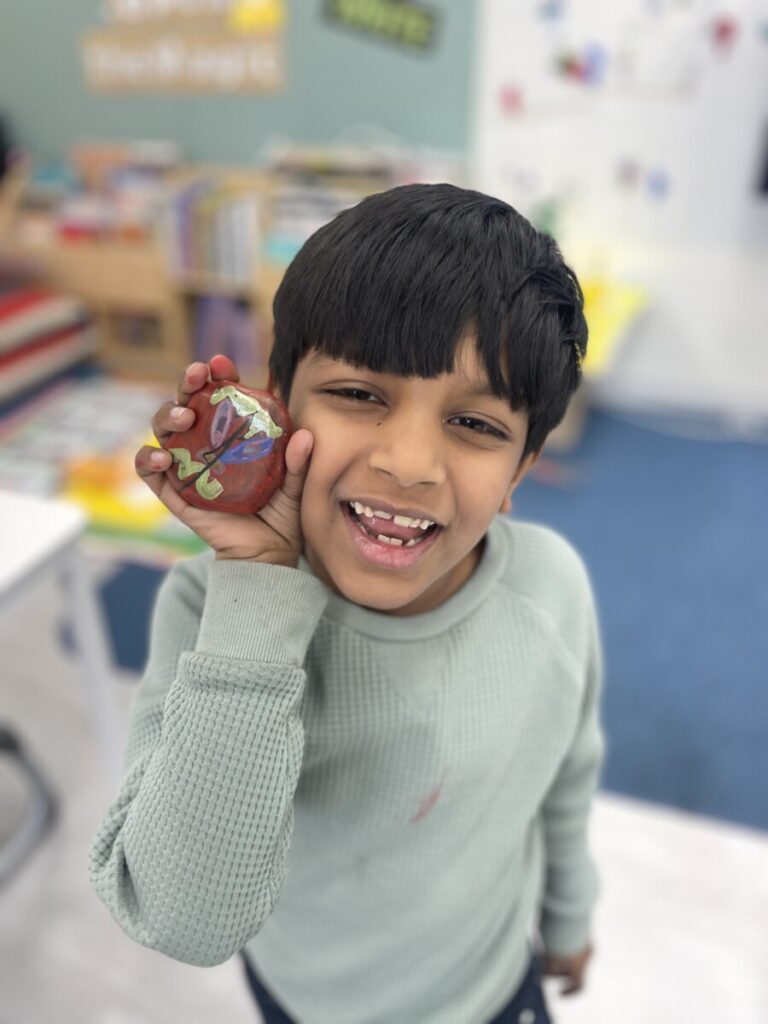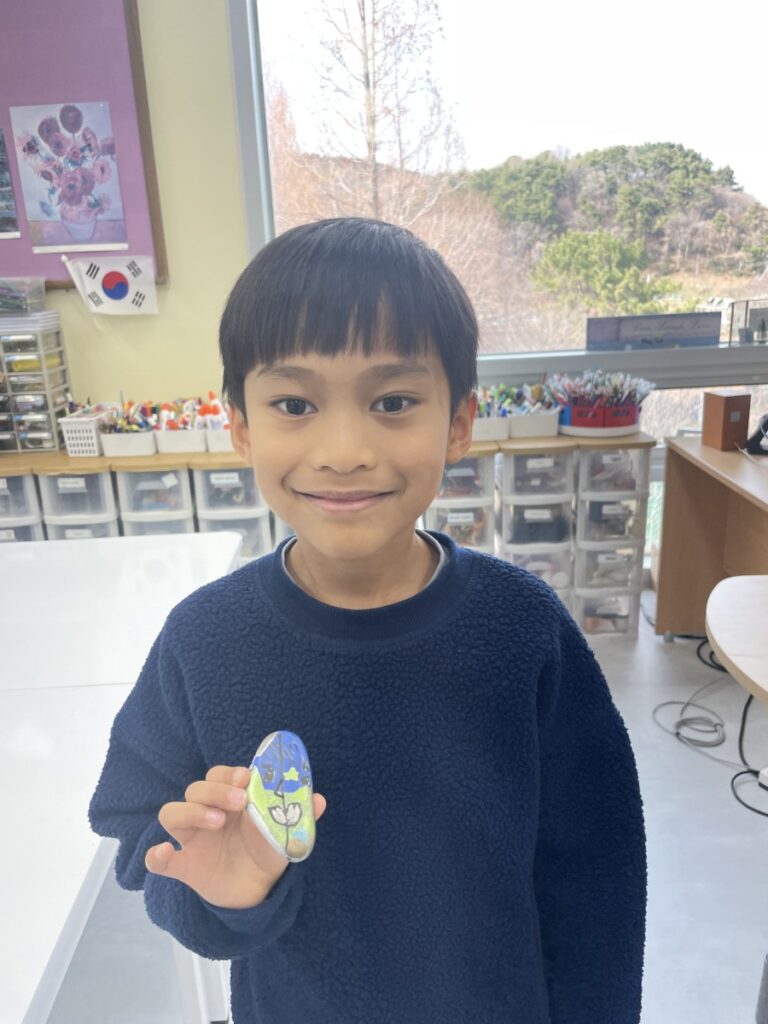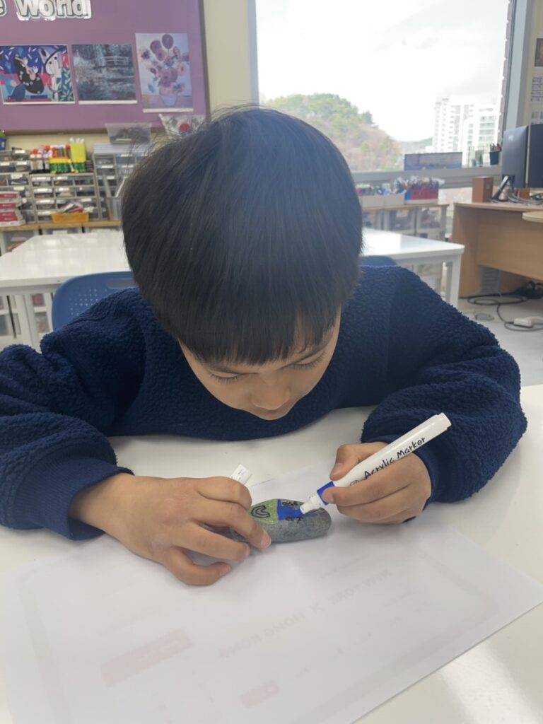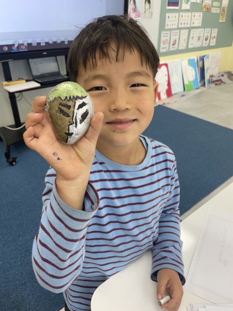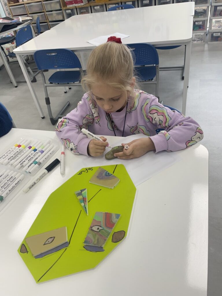 To extend the activity further, students also painted Cubist-style faces on small stones. This allowed them to explore shape, colour, and composition on a different surface while continuing to experiment with abstract facial designs.