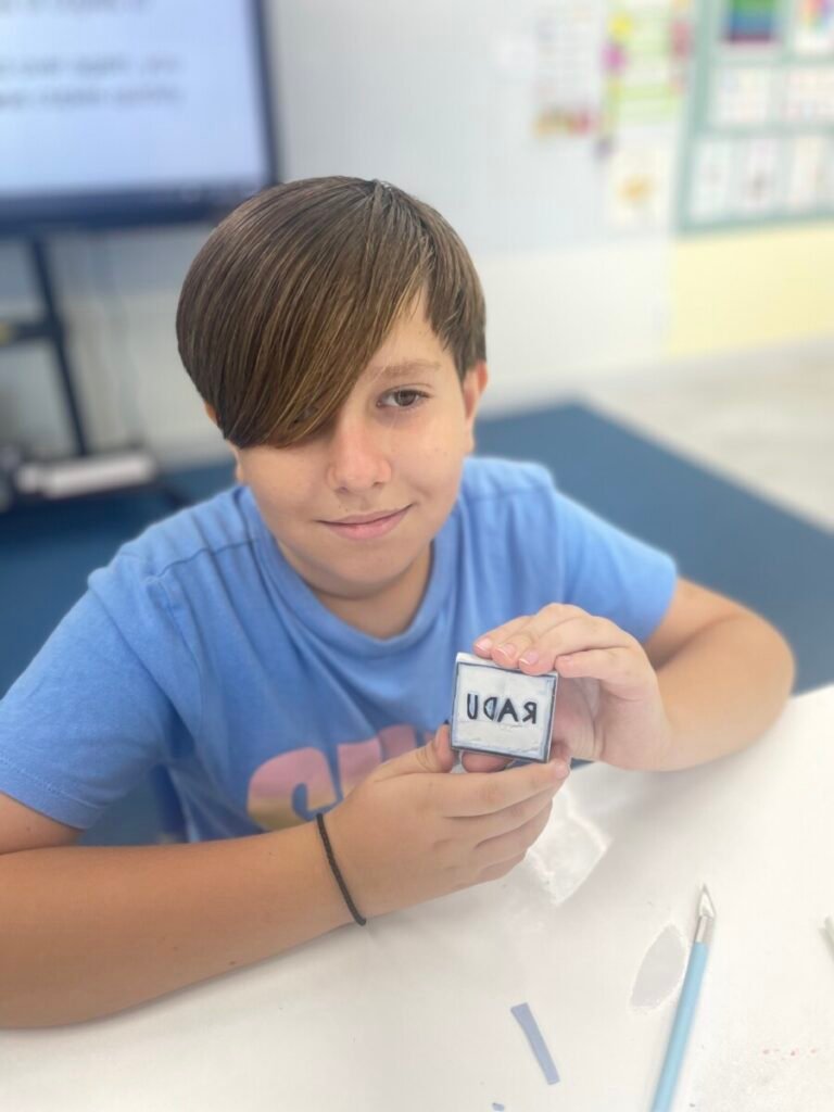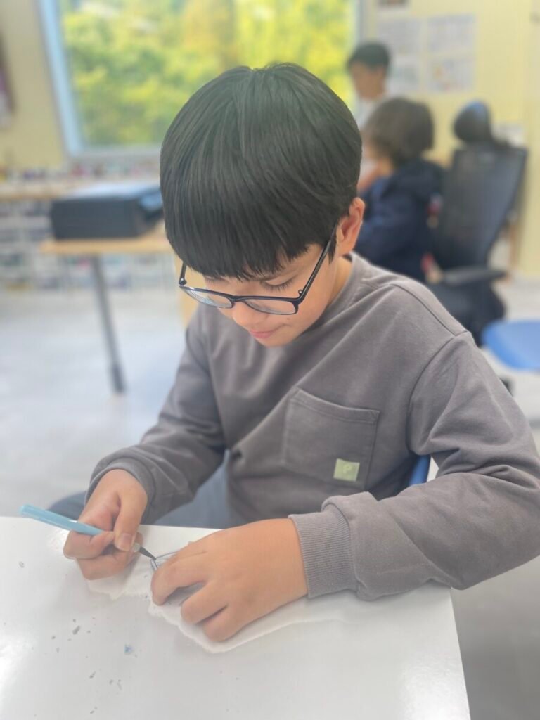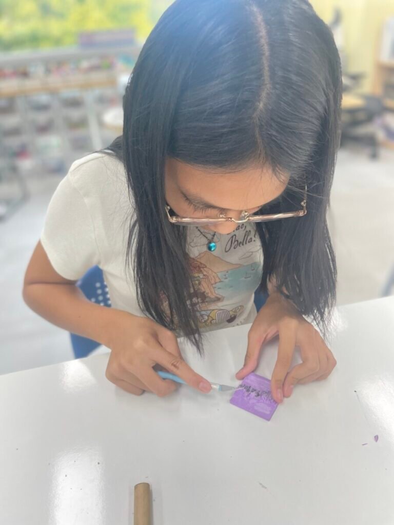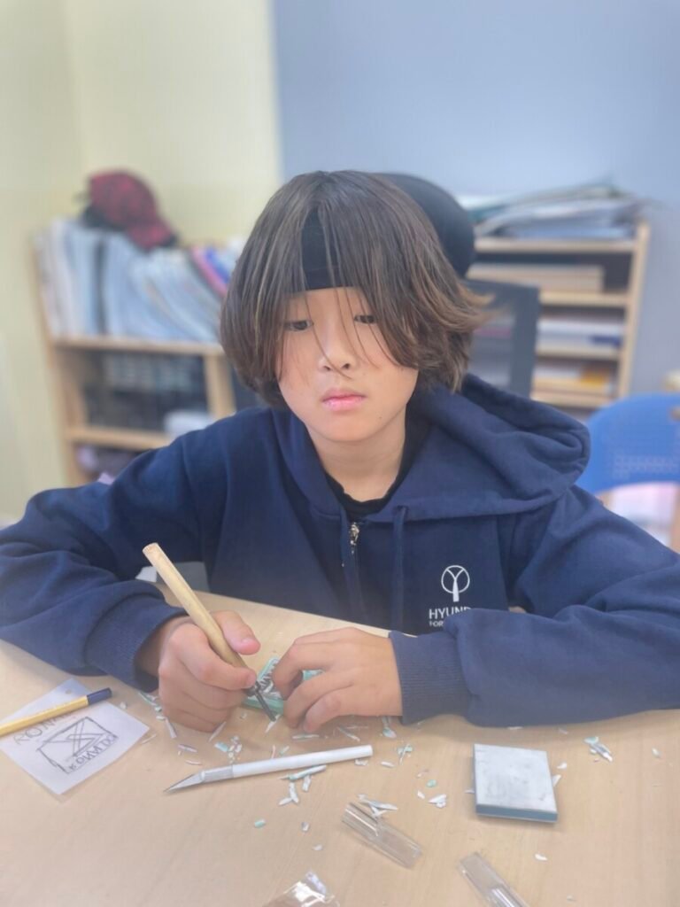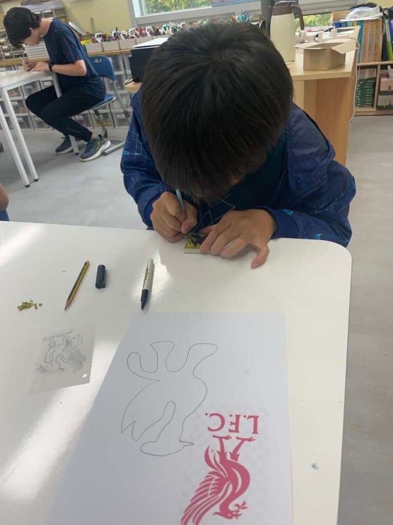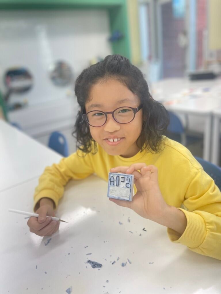 In our recent lessons, we explored fun carving techniques such as intaglio (carving in) and relief (leaving raised letters) while working on erasers. Some students successfully completed their name carvings and tested them out as stamps. After mastering the basics, we moved on to designing and carving simple characters. This process helped us improve our focus, practice using cutting tools carefully, and develop our motor skills in an engaging and hands-on way.