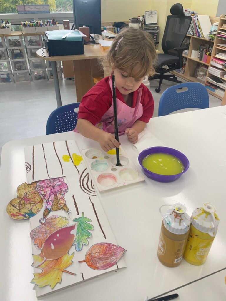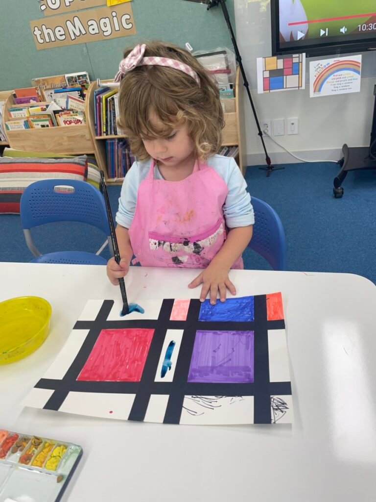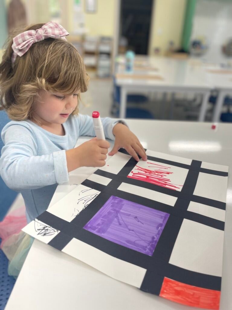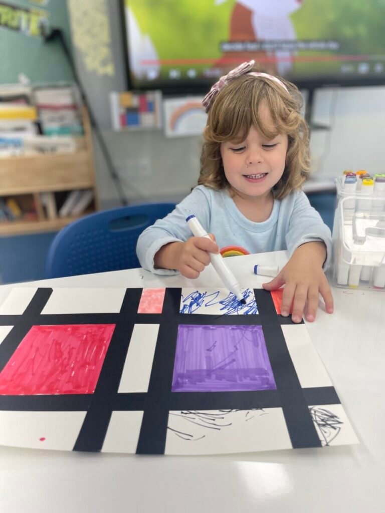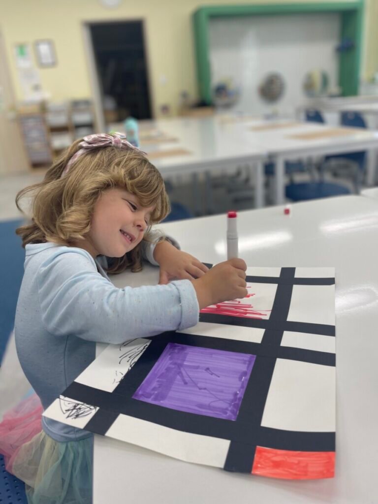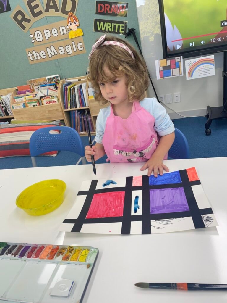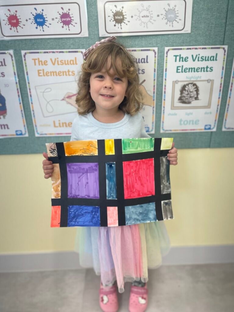 We started by creating a beautiful autumn tree with colourful leaves, capturing the essence of the season. After that, we dove into Mondrian’s style of art, using black tape to form horizontal and vertical lines on the paper. Maddison then had the freedom to paint whatever she liked within the spaces, and the results were vibrant and full of her own artistic touch!
