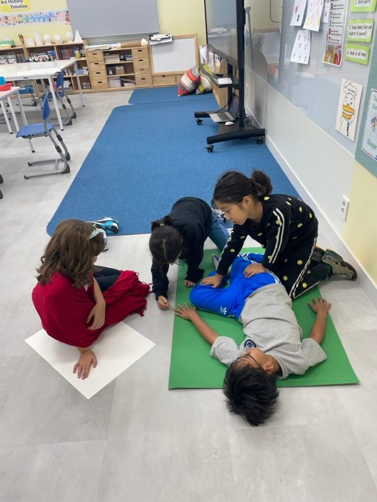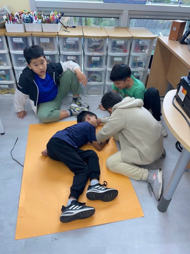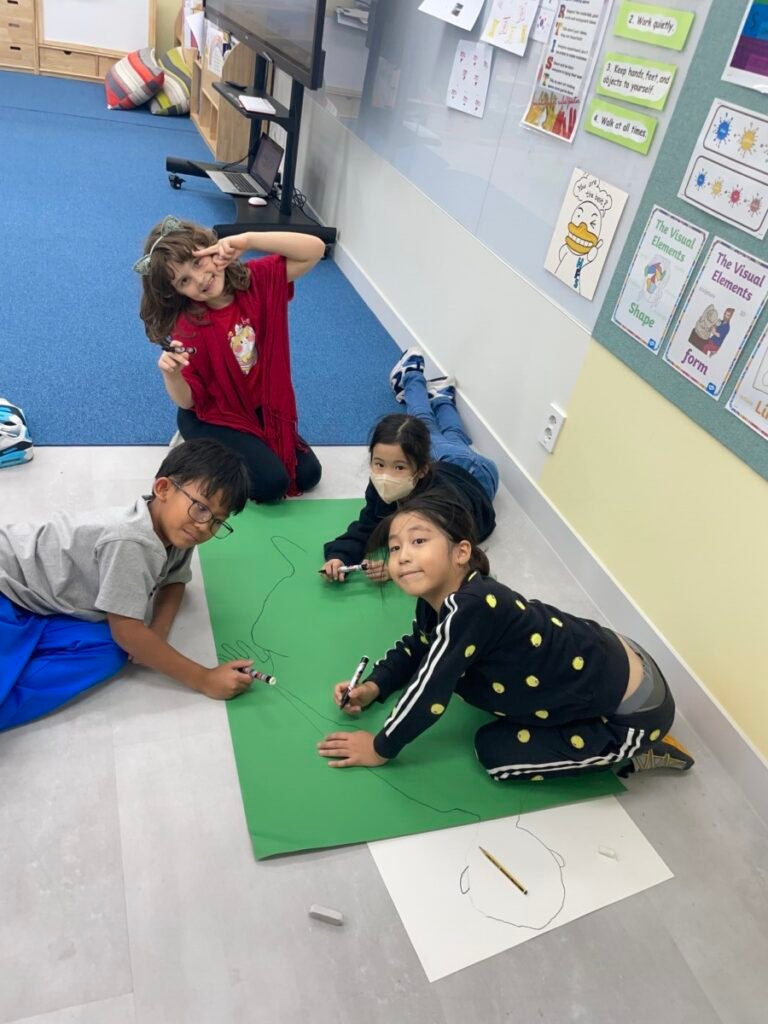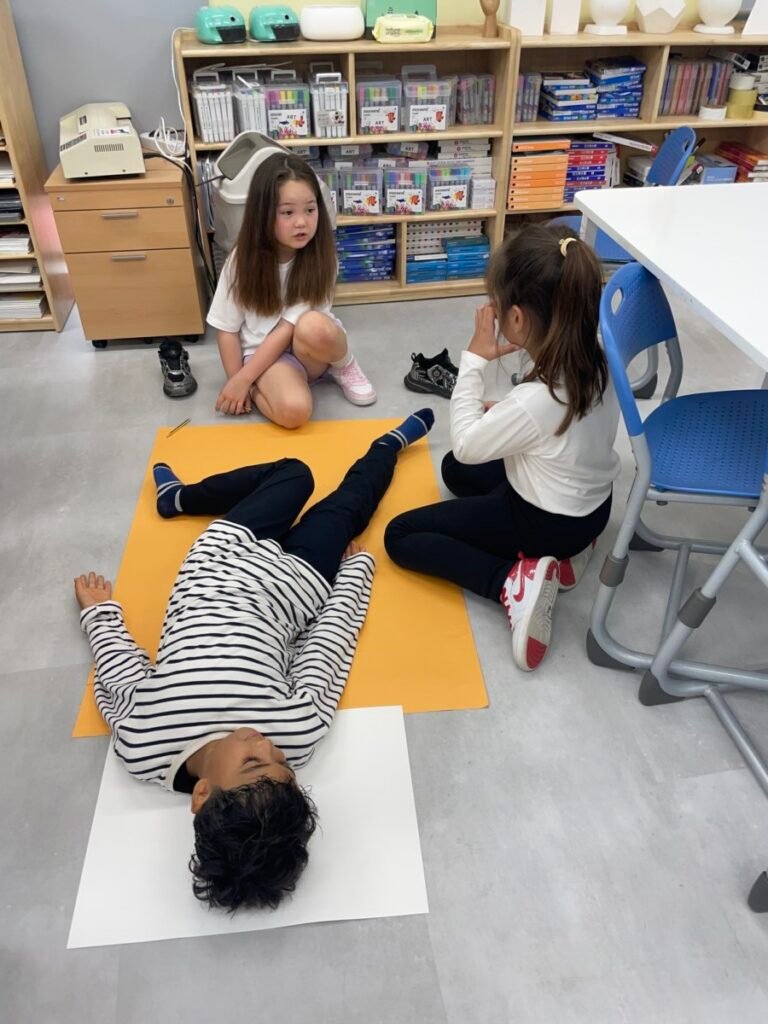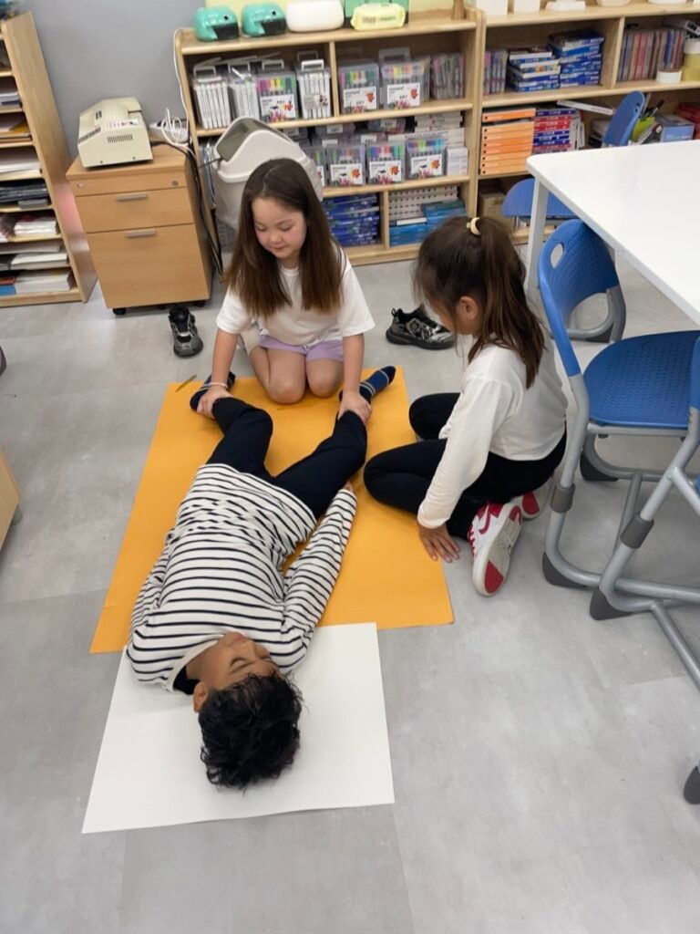 We’ve been learning about how the human body works. We divided into four groups, and each group used their creativity to make poses and trace body movements. The students were excited to design clothes based on the poses and added unique details to their outfits. It was a fun and creative activity that allowed everyone to express their ideas through art!