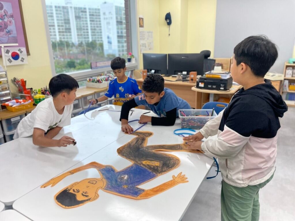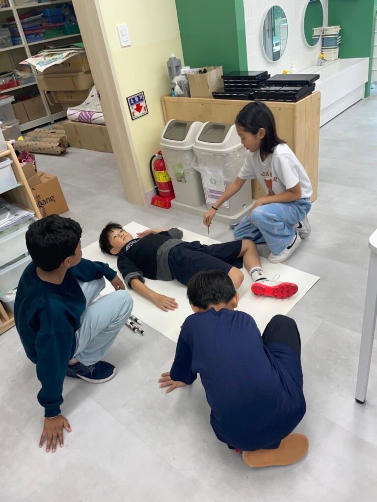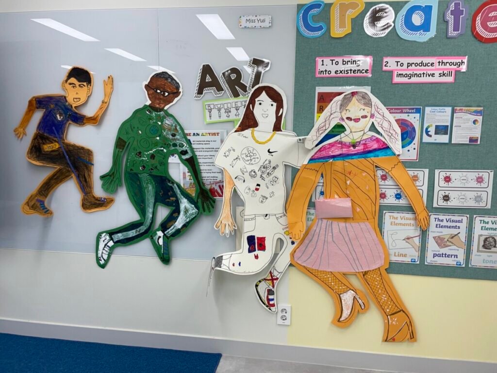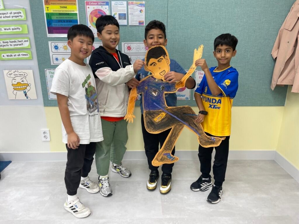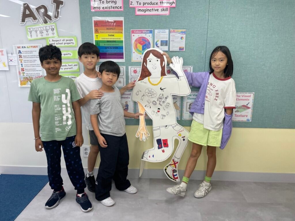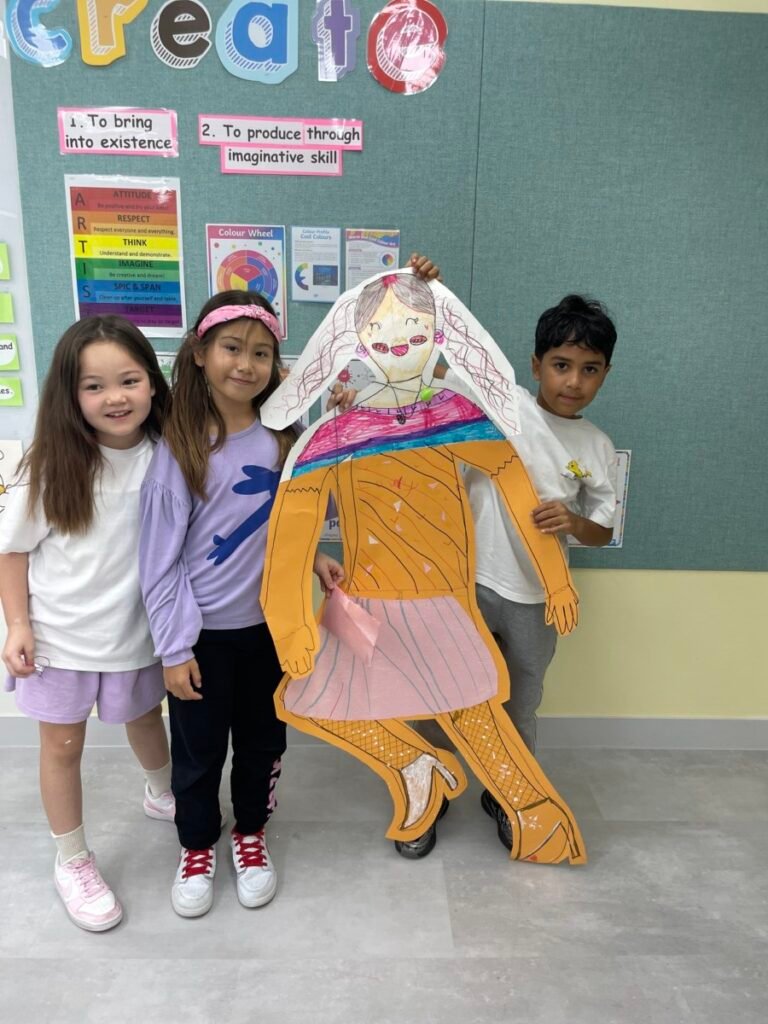 We’ve been learning about how the human body works. We divided into four groups, and each group used their creativity to make poses and trace body movements. The students were excited to design clothes based on the poses and added unique details to their outfits. It was a fun and creative activity that allowed everyone to express their ideas through art!