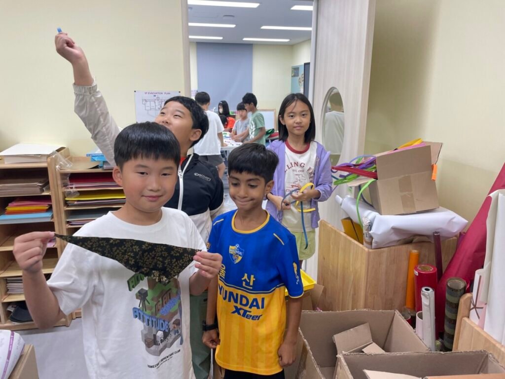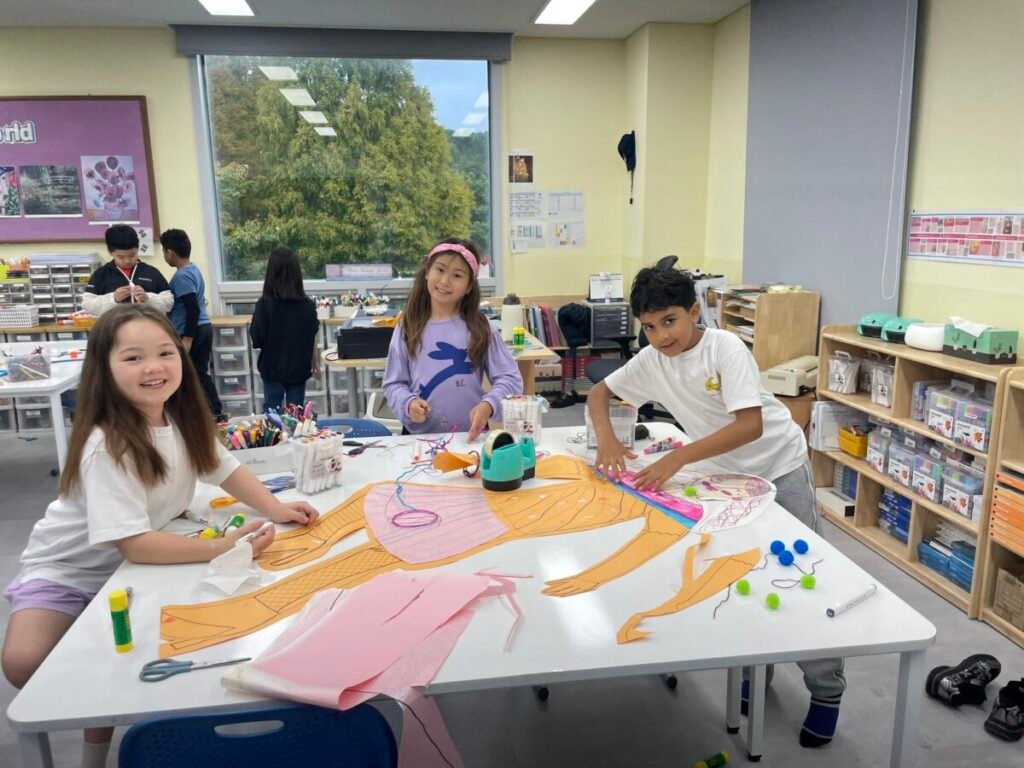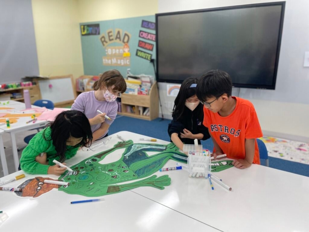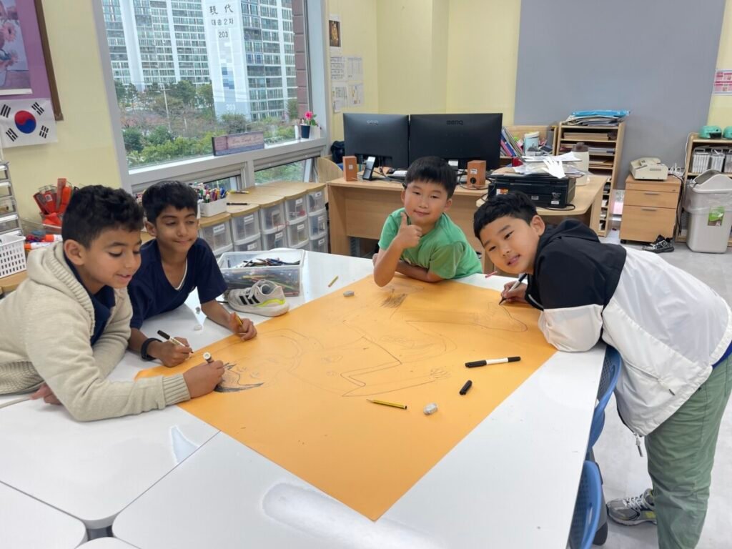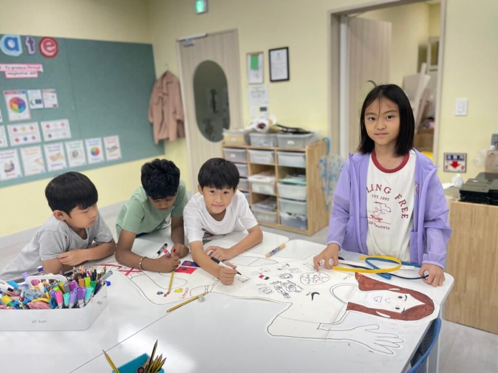 We’ve been learning about how the human body works. We divided into four groups, and each group used their creativity to make poses and trace body movements. The students were excited to design clothes based on the poses and added unique details to their outfits. It was a fun and creative activity that allowed everyone to express their ideas through art!