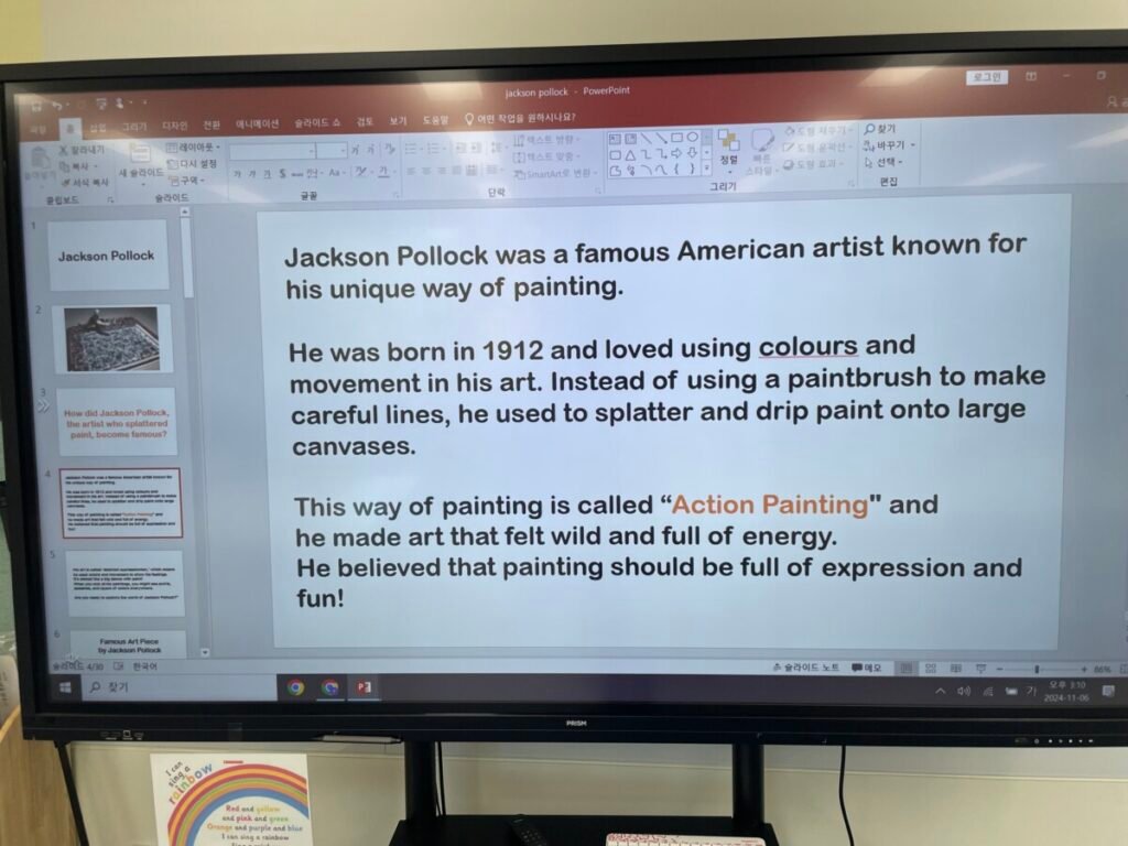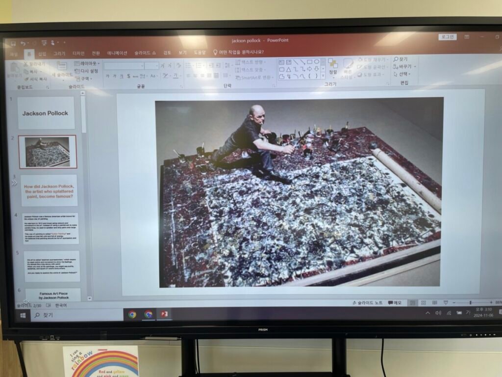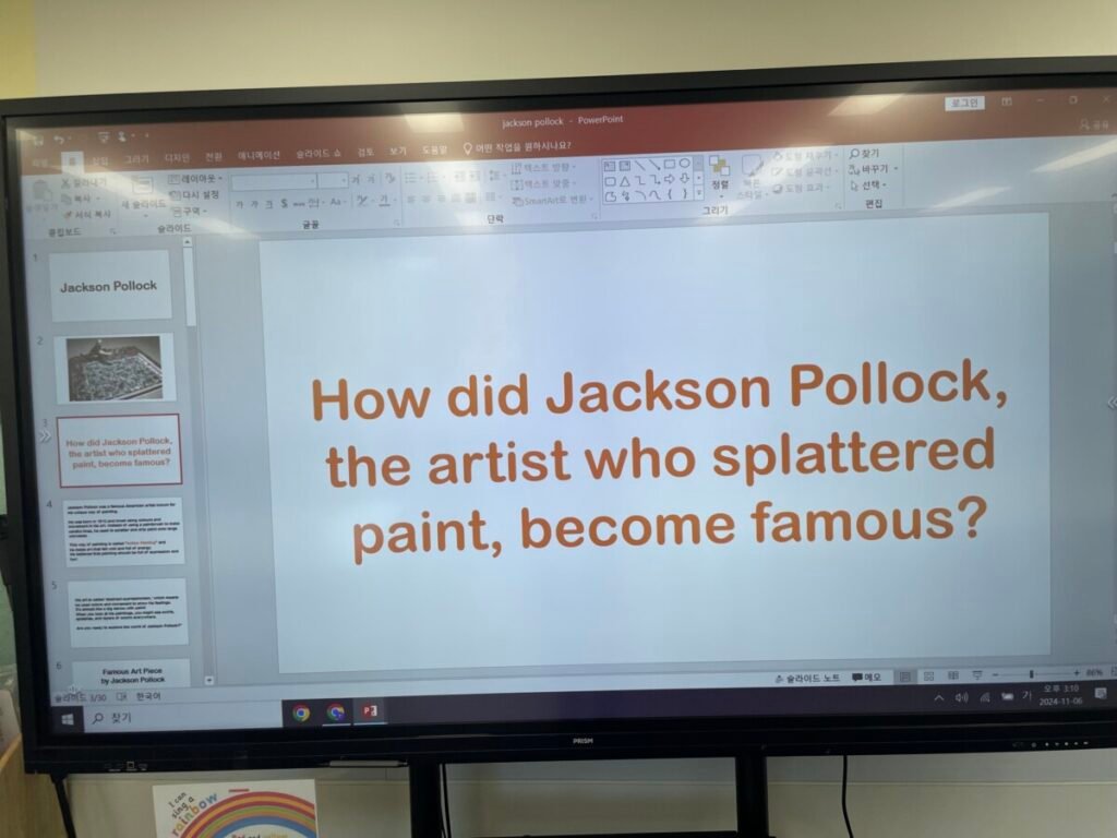 The students researched a list of ten questions I provided and documented their findings on Google Slides. Next week, a few students will present their slides, and we’ll engage in a hands-on activity to try action painting ourselves, just like Jackson Pollock!