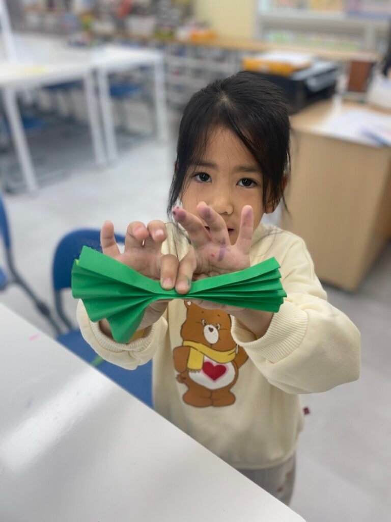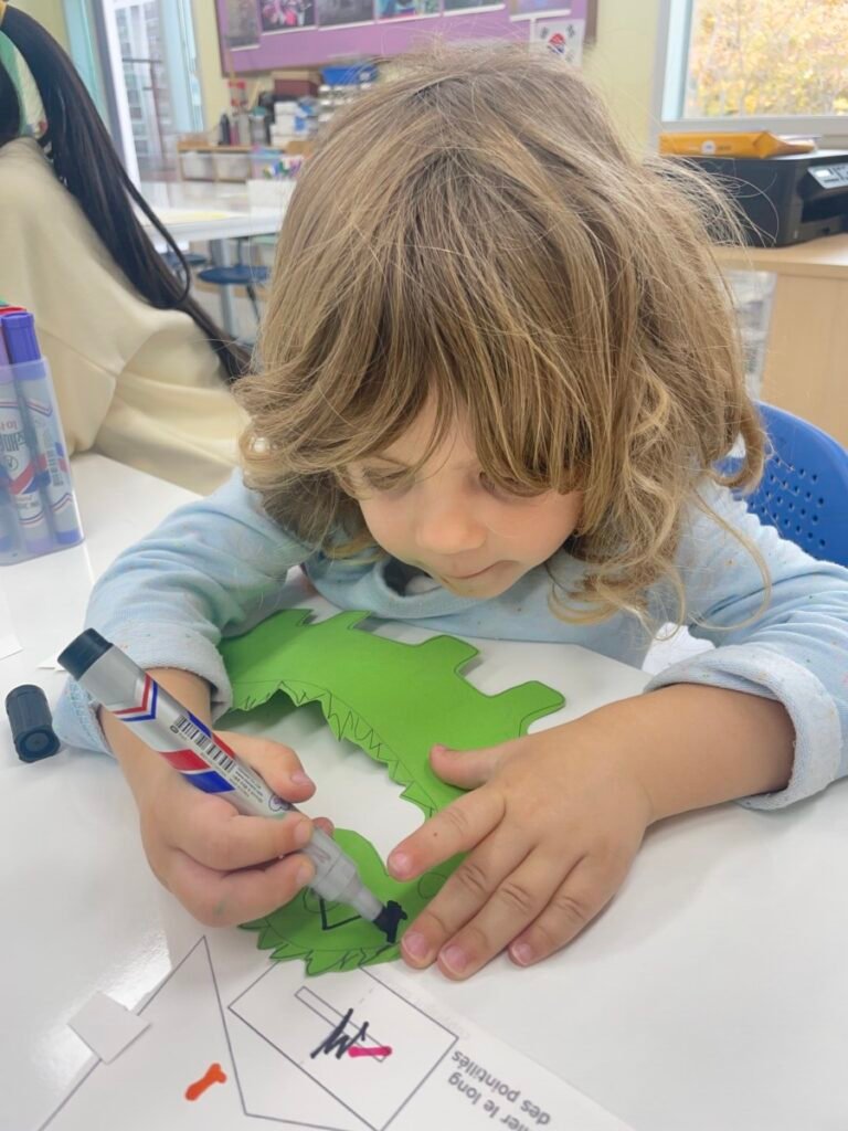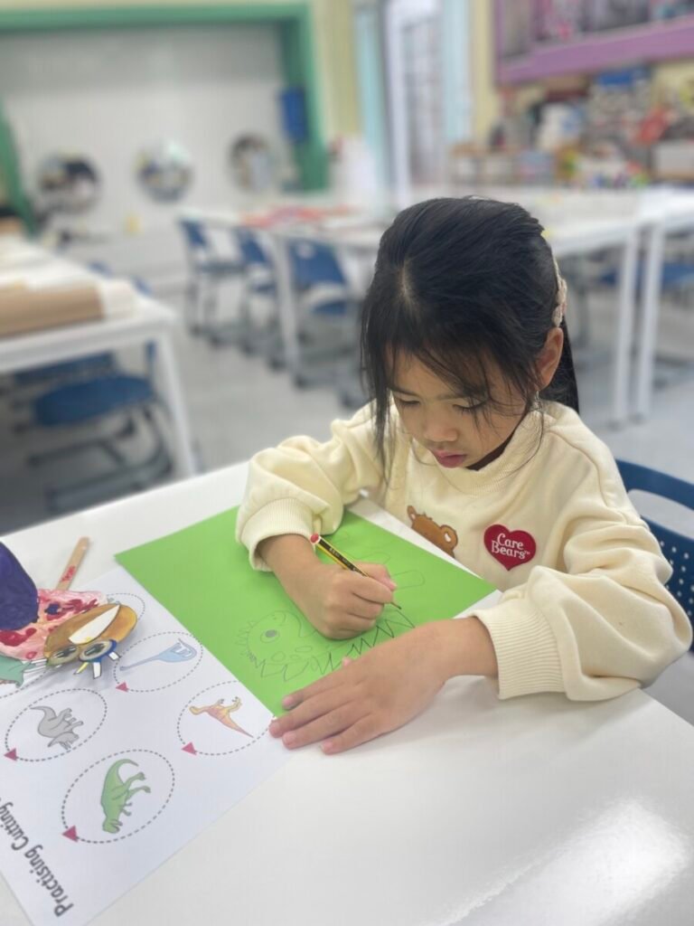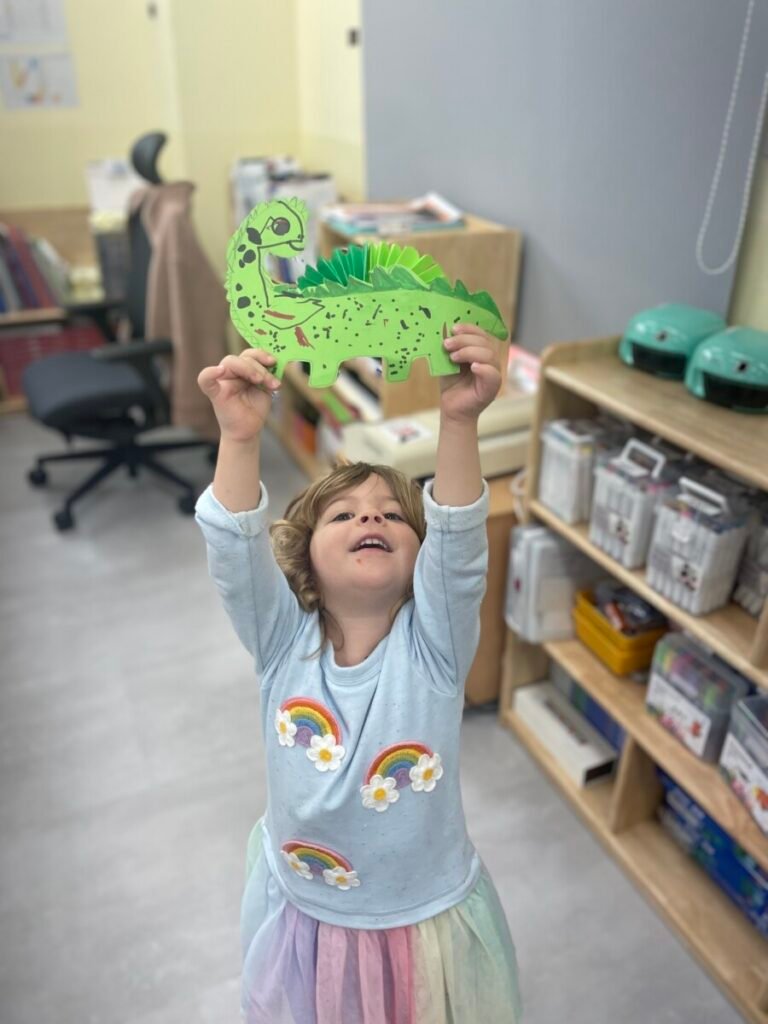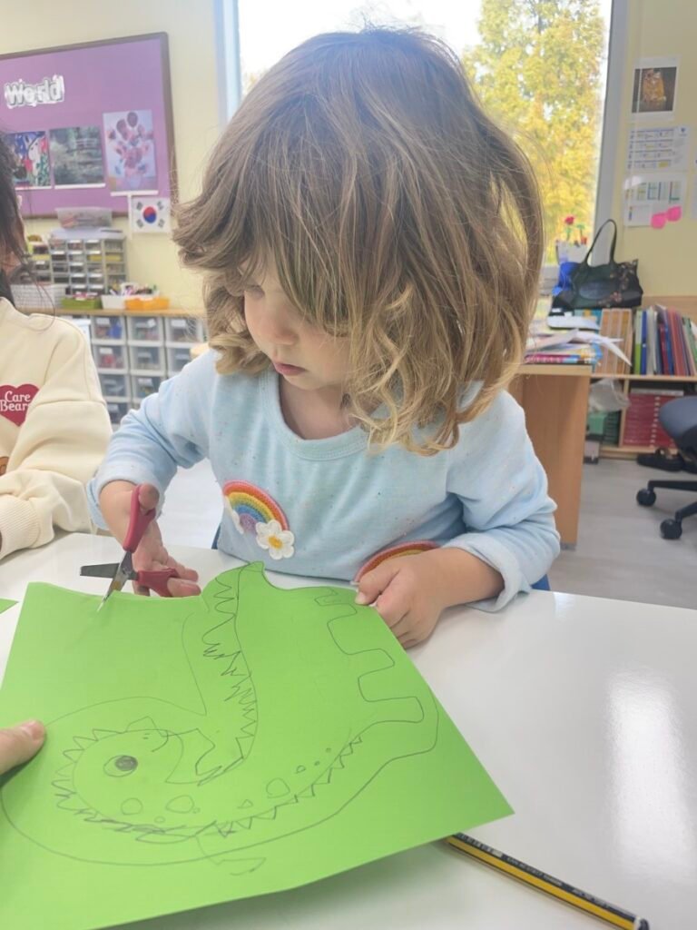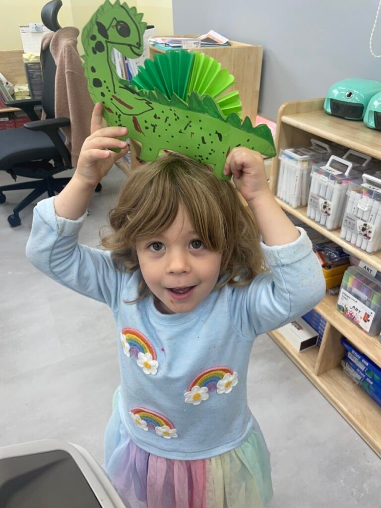 FS1-2 kids completed their bird project. We assembled all the painted parts of the bird’s body together. Additionally, we made a dinosaur! The kids added spikes to a dinosaur drawing that I created, and they coloured it and added patterns. We also practiced folding paper for some parts of the dinosaur’s body, which wasn’t easy, but we gave it our best. We continue practicing our cutting skills, as well as how to hold pencils and brushes properly.