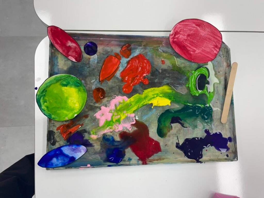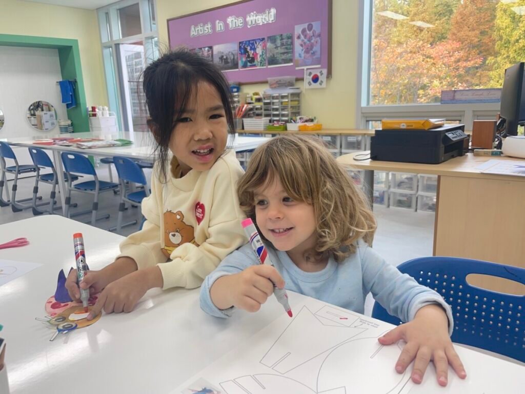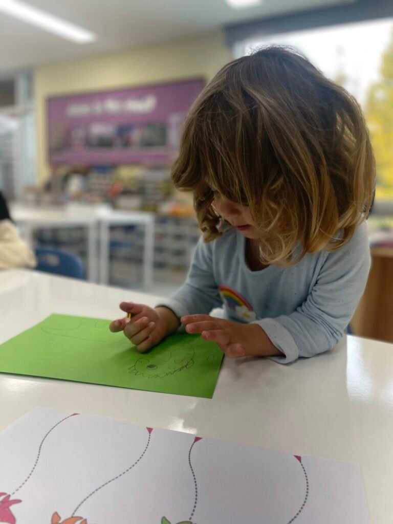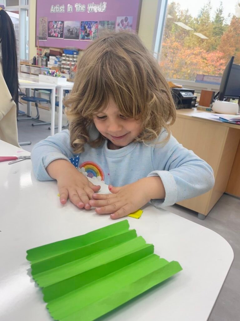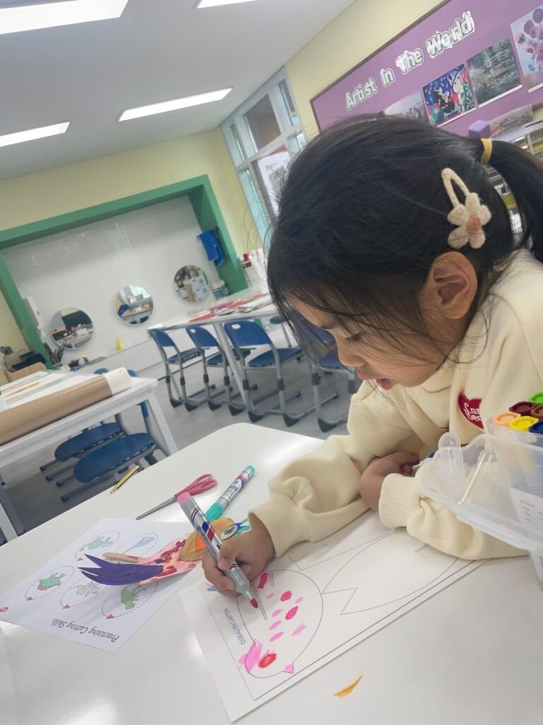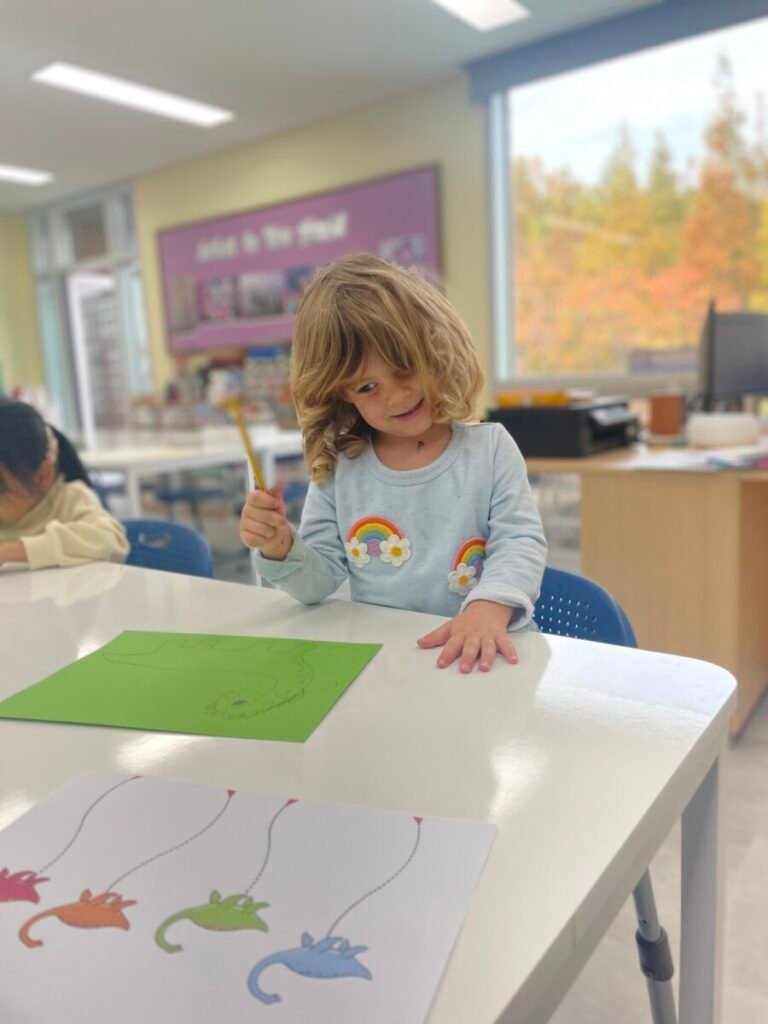 FS1-2 kids completed their bird project. We assembled all the painted parts of the bird’s body together. Additionally, we made a dinosaur! The kids added spikes to a dinosaur drawing that I created, and they coloured it and added patterns. We also practiced folding paper for some parts of the dinosaur’s body, which wasn’t easy, but we gave it our best. We continue practicing our cutting skills, as well as how to hold pencils and brushes properly.