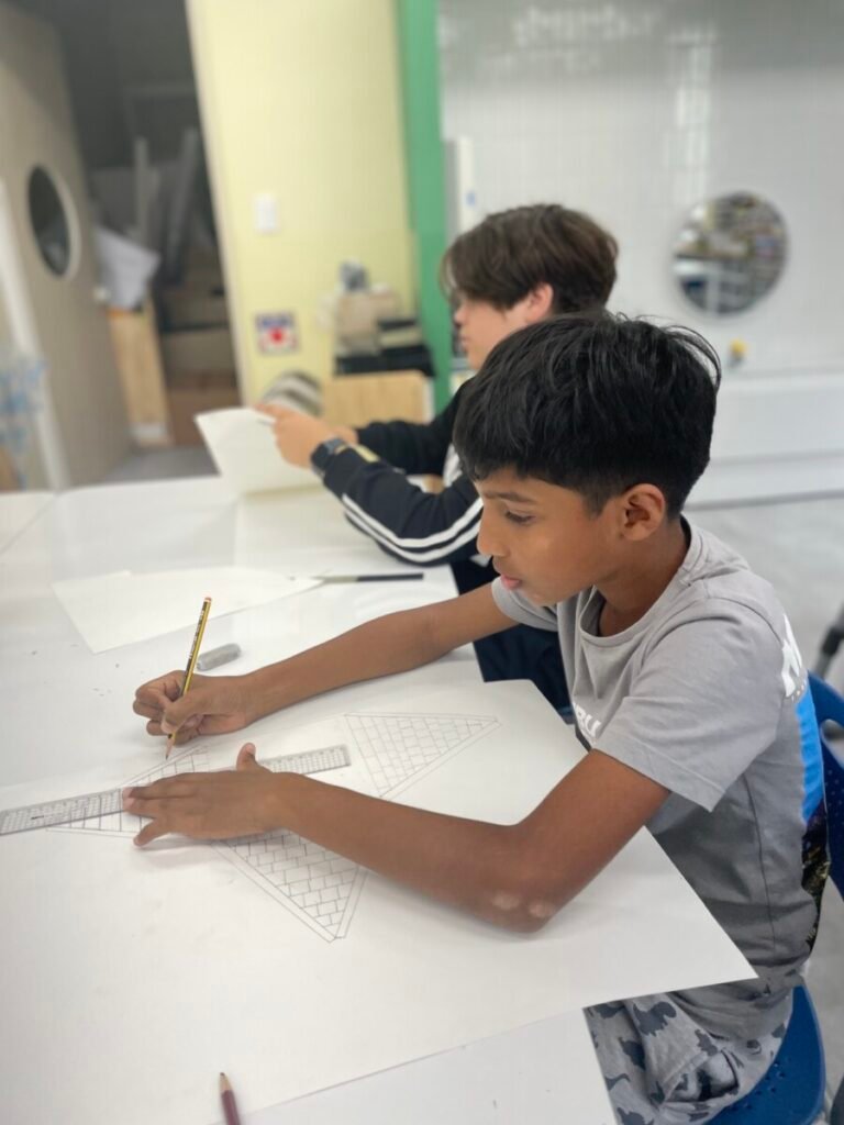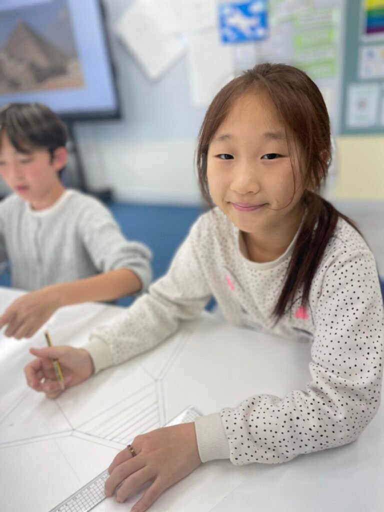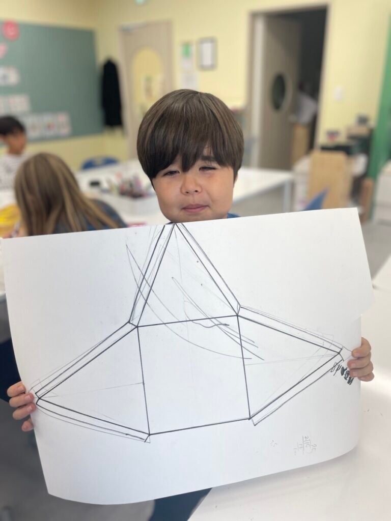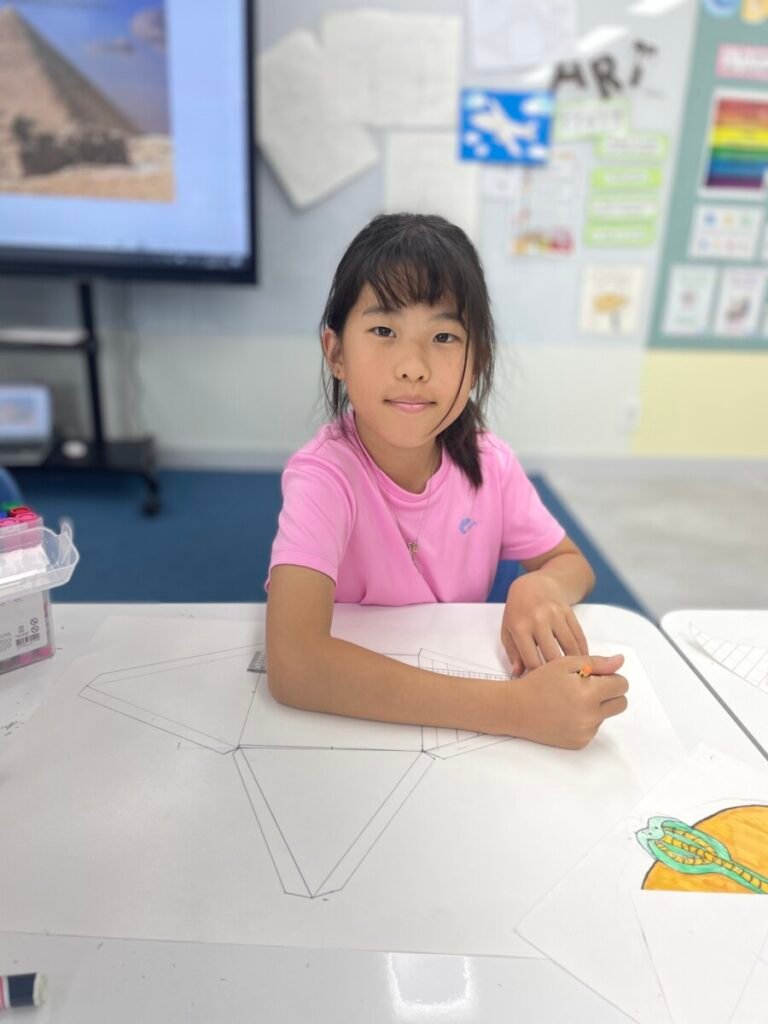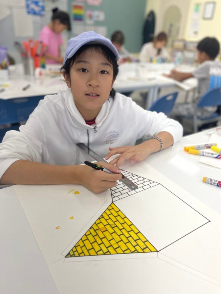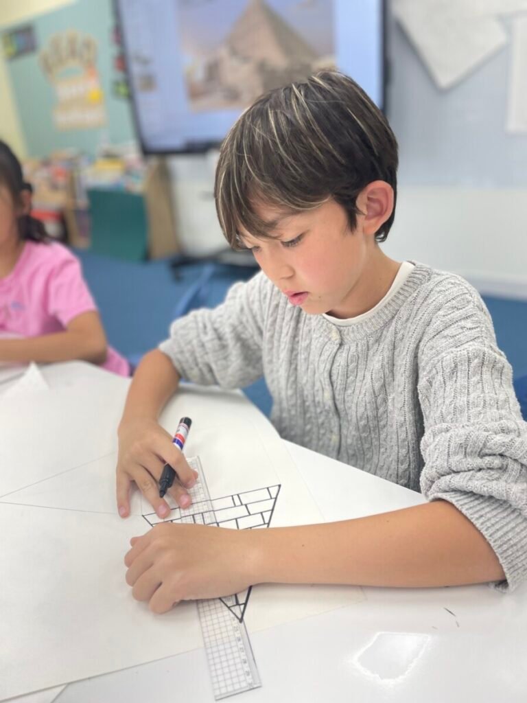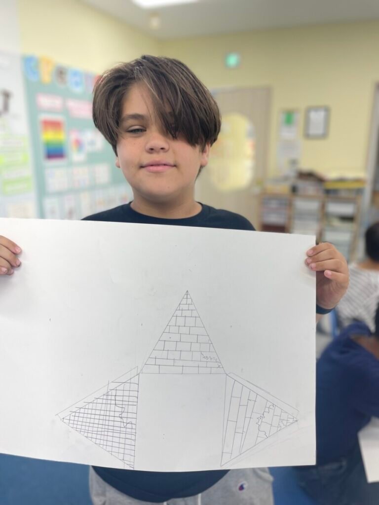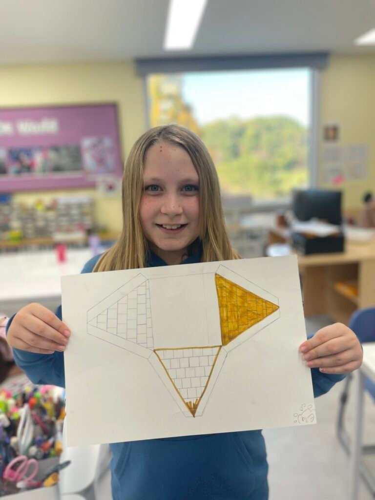 The Year 5-6 students are continuing their exploration of Ancient Egyptian and Greek art. This week, we delved deeper into the theme of pyramids. We discussed the number of pyramids, what is inside them, and the sculptures that stand in front of them. Each student designed their own pyramid, using a ruler to help with accuracy. Drawing the right side was challenging, even with the ruler, as we had to think carefully about the pyramid’s size and proportions.