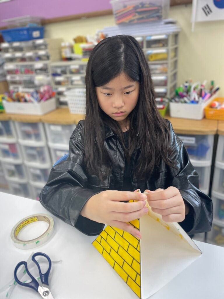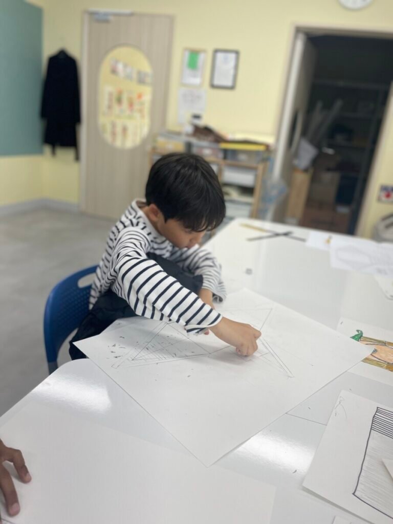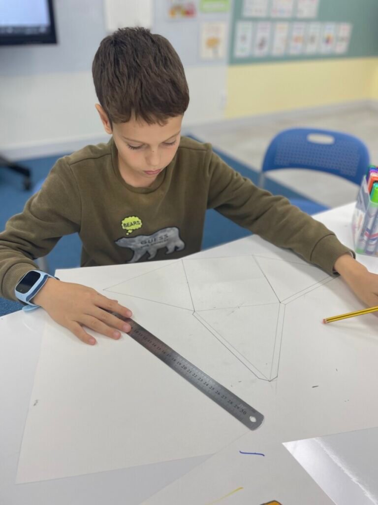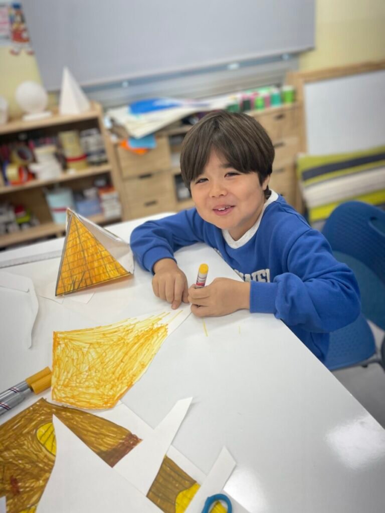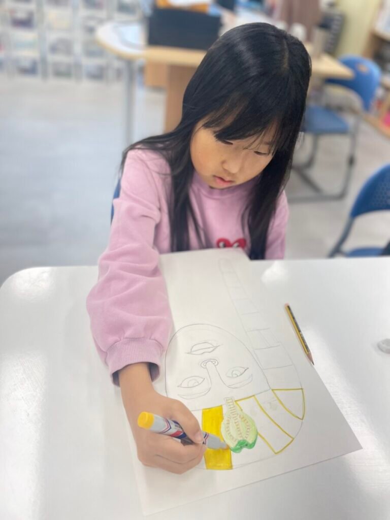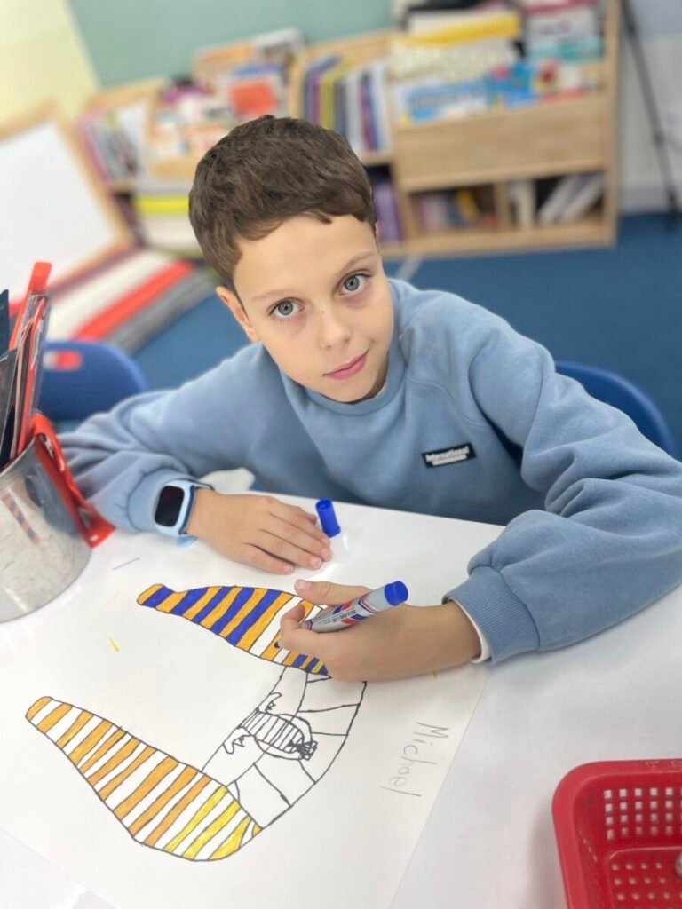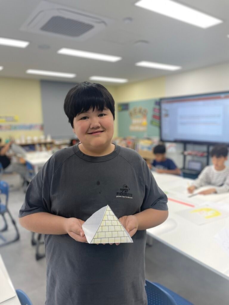 The Year 5-6 students are continuing their exploration of Ancient Egyptian and Greek art. This week, we delved deeper into the theme of pyramids. We discussed the number of pyramids, what is inside them, and the sculptures that stand in front of them. Each student designed their own pyramid, using a ruler to help with accuracy. Drawing the right side was challenging, even with the ruler, as we had to think carefully about the pyramid’s size and proportions.