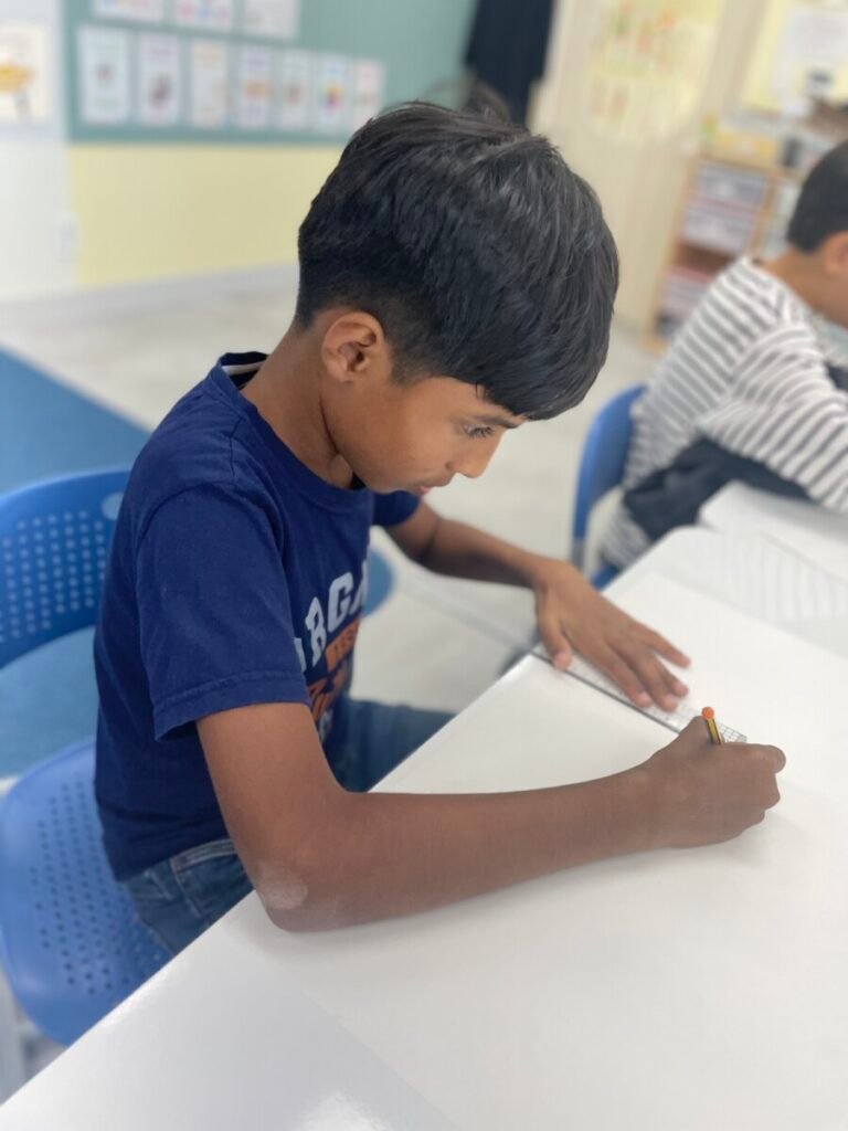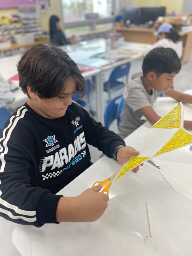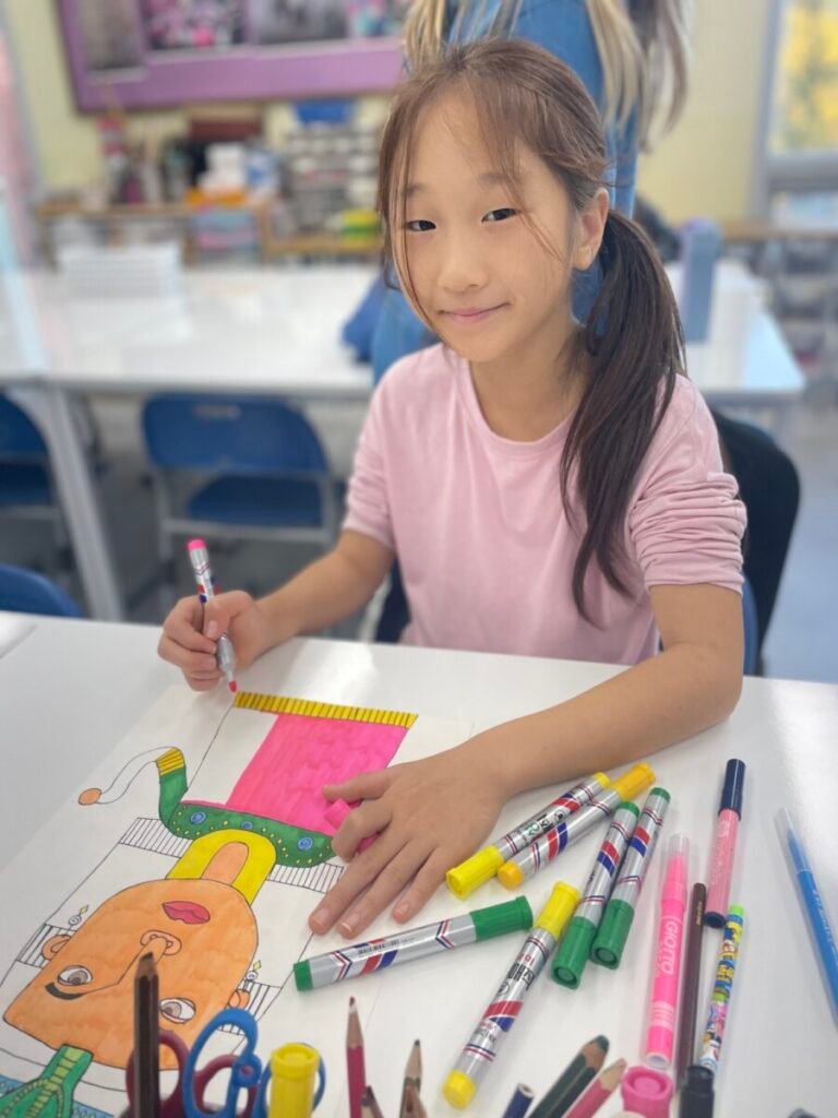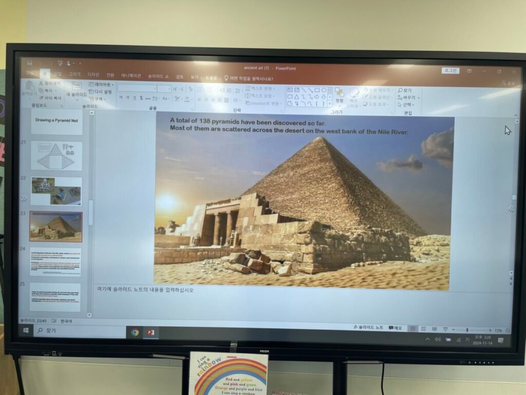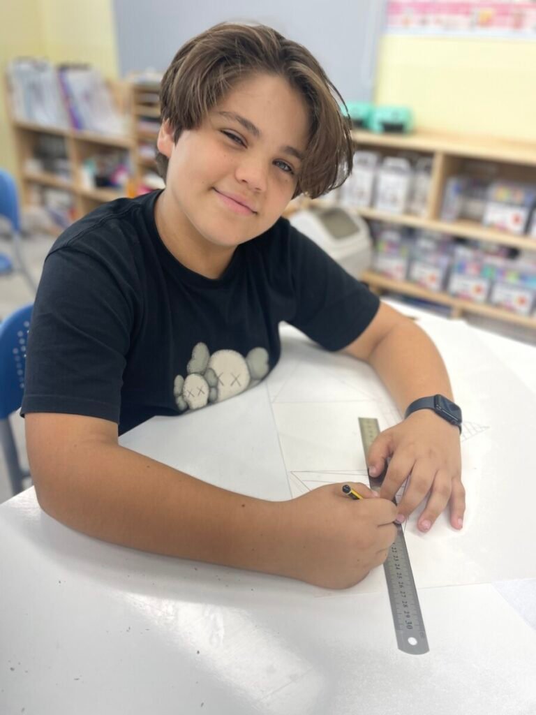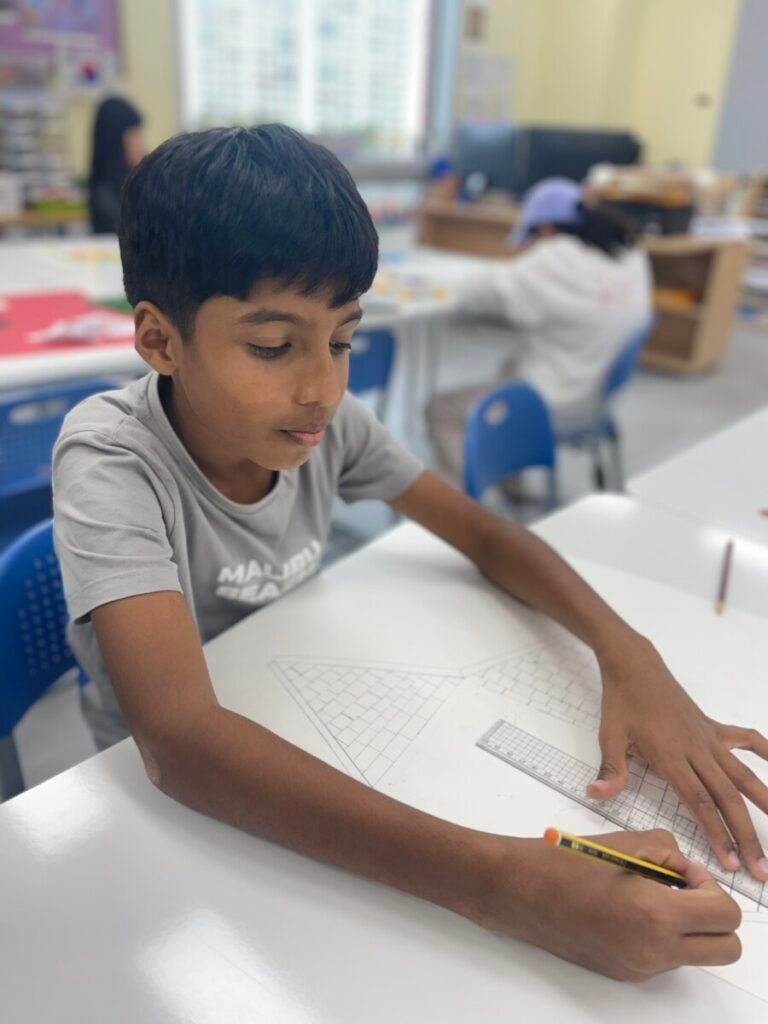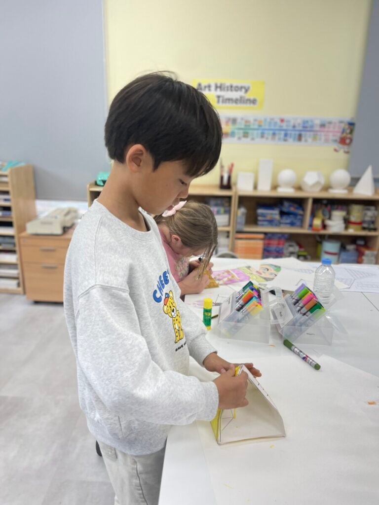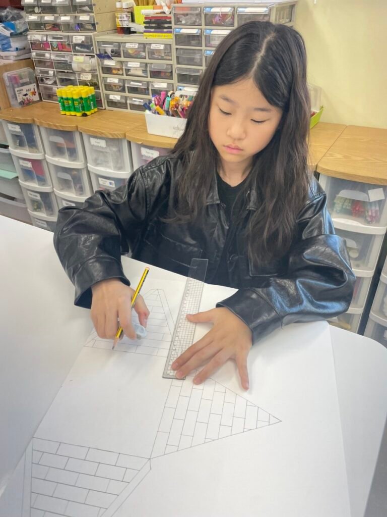 The Year 5-6 students are continuing their exploration of Ancient Egyptian and Greek art. This week, we delved deeper into the theme of pyramids. We discussed the number of pyramids, what is inside them, and the sculptures that stand in front of them. Each student designed their own pyramid, using a ruler to help with accuracy. Drawing the right side was challenging, even with the ruler, as we had to think carefully about the pyramid’s size and proportions.