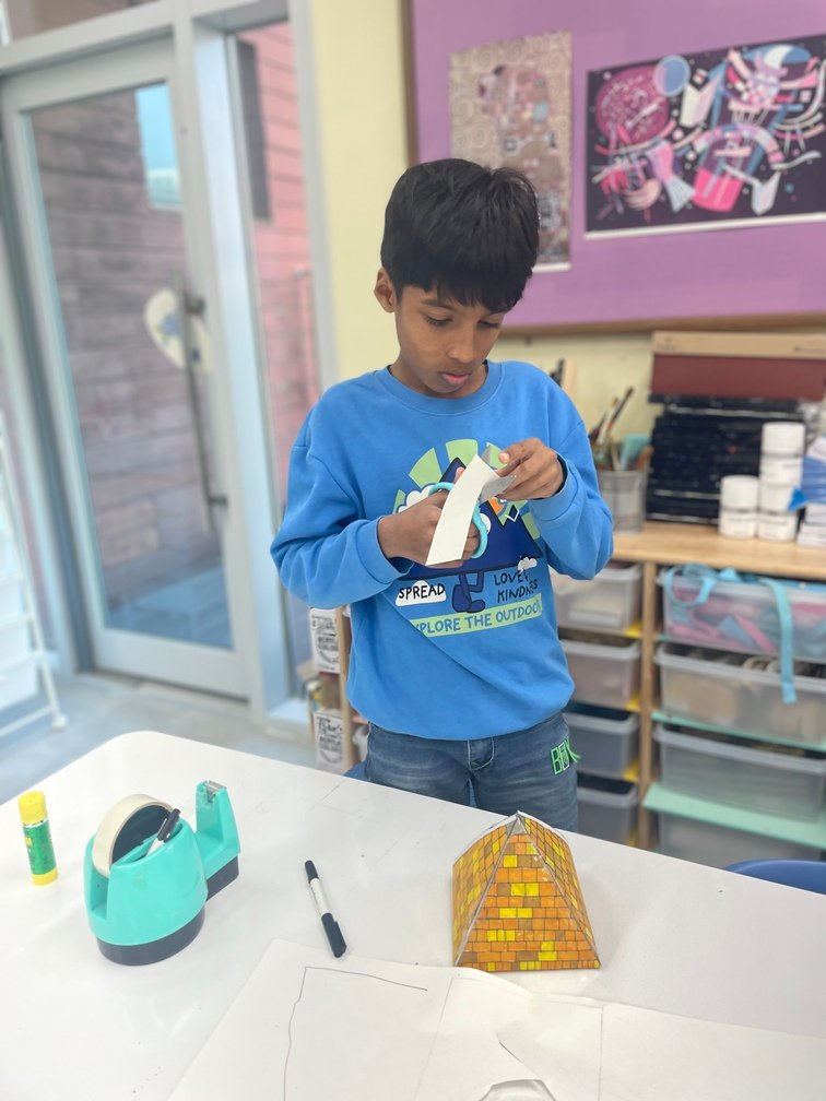 This week, we continued working on our pyramid project. We added an entrance gate and explored photos of real mummy cases, learning about their placement inside the pyramid.