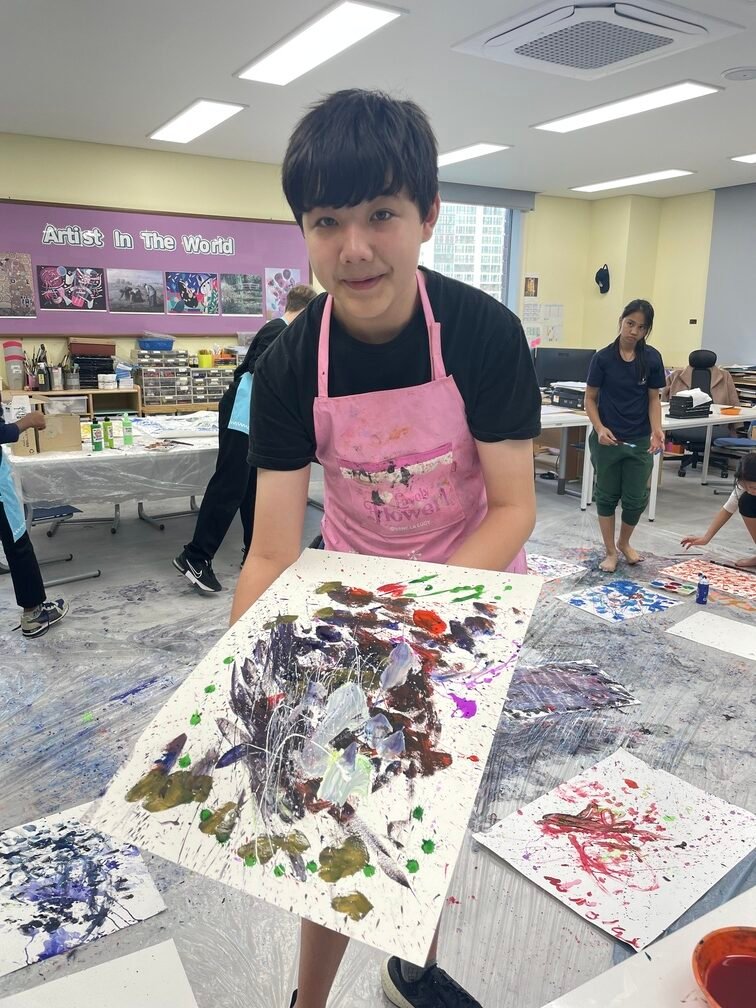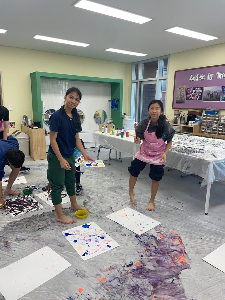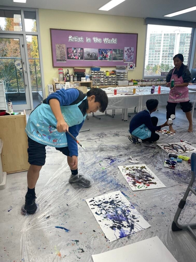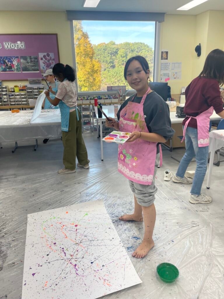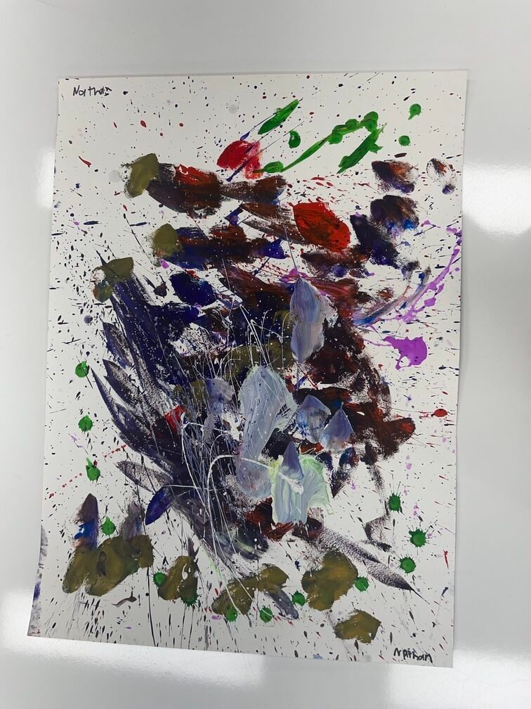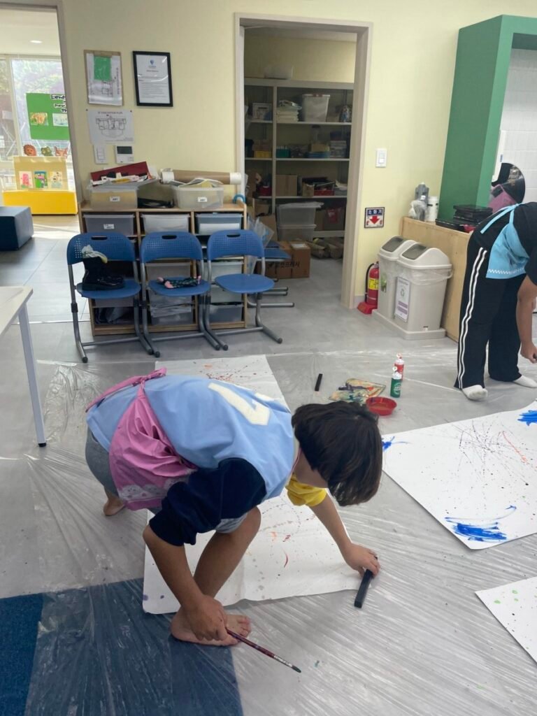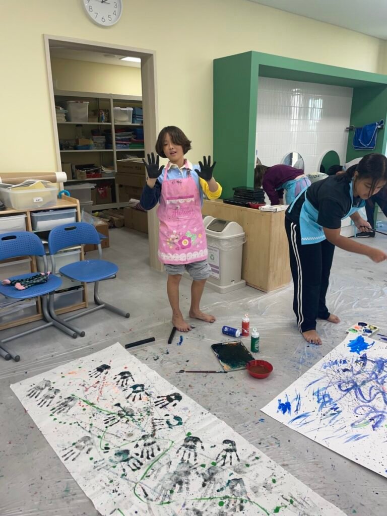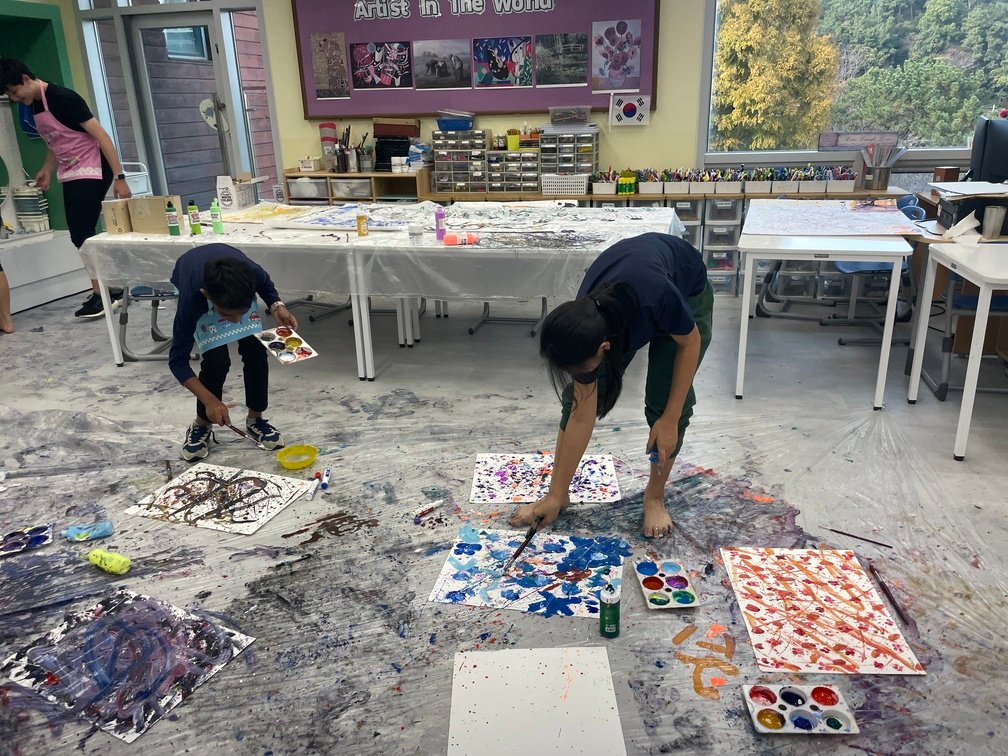 This week, we had our exciting ‘Action Painting’ activity! I set up coverings on the floor and desks to allow the children to paint freely, and a big thank you to Mr. Choi for helping me with the setup!