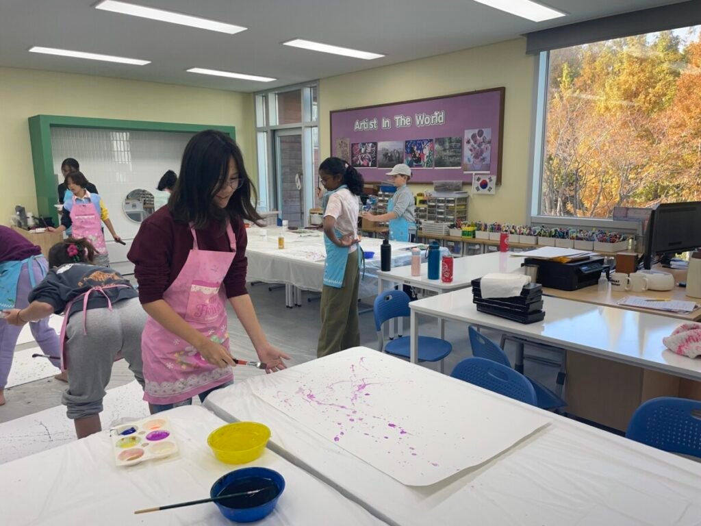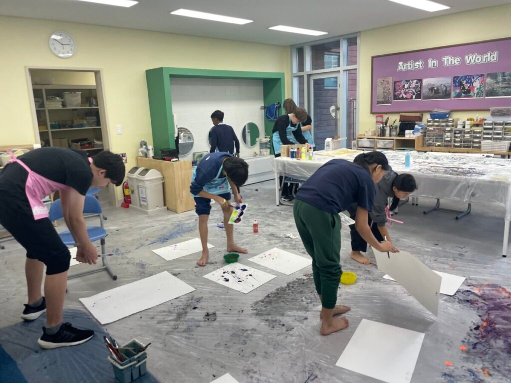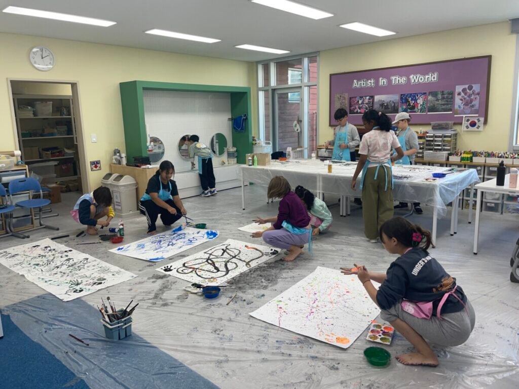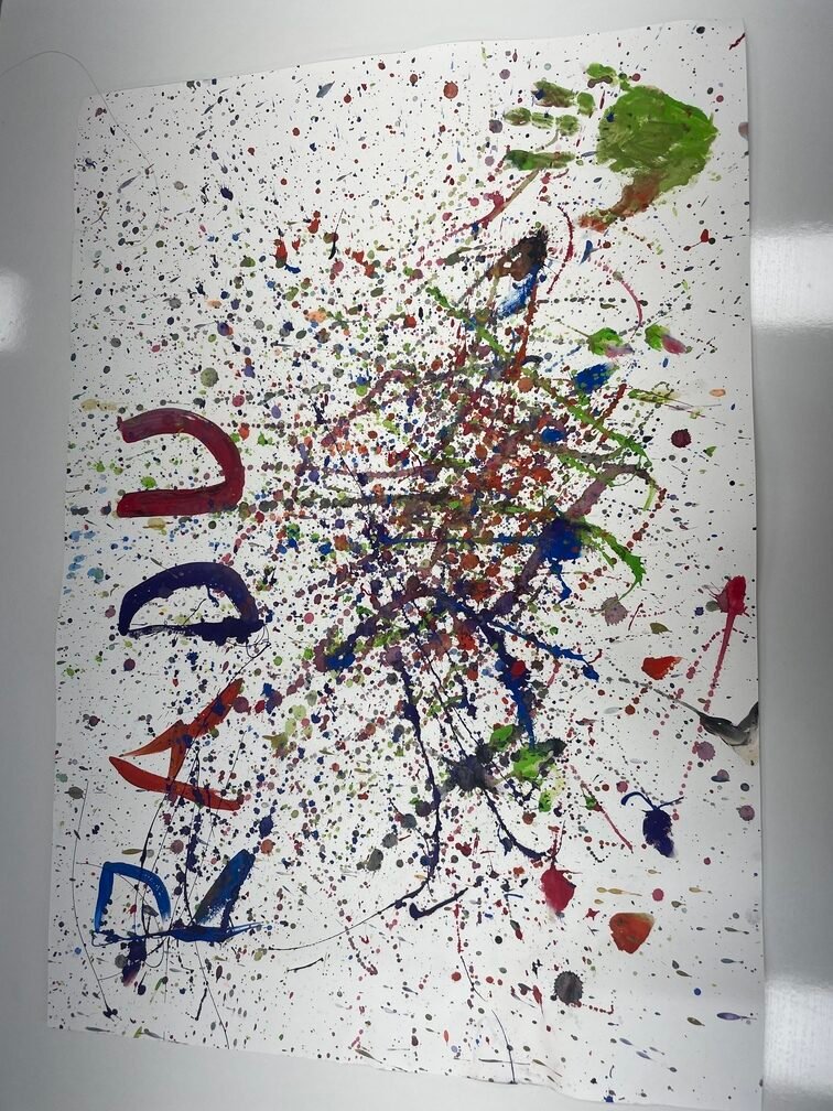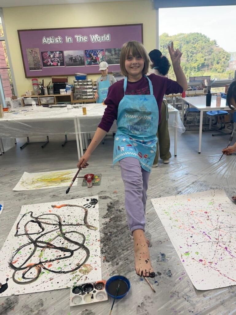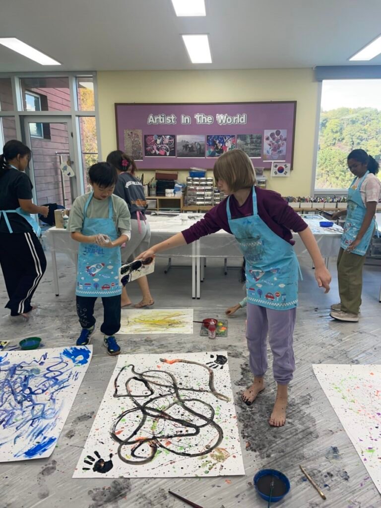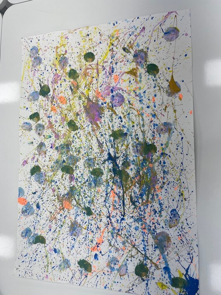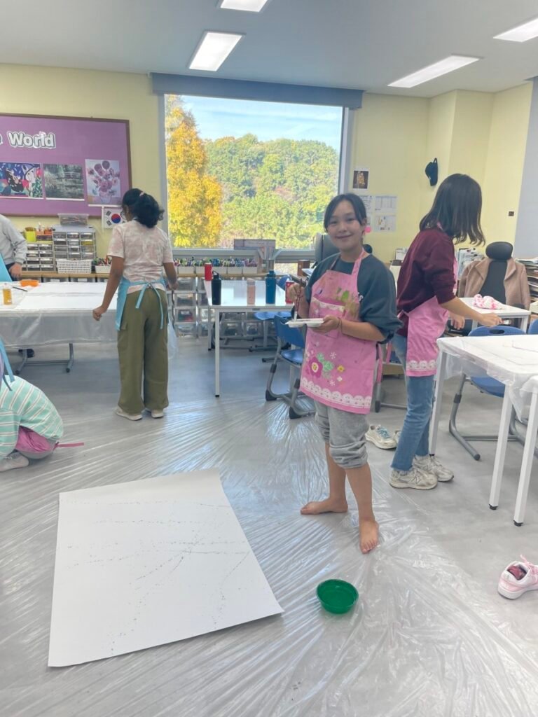 This week, we had our exciting ‘Action Painting’ activity! I set up coverings on the floor and desks to allow the children to paint freely, and a big thank you to Mr. Choi for helping me with the setup!