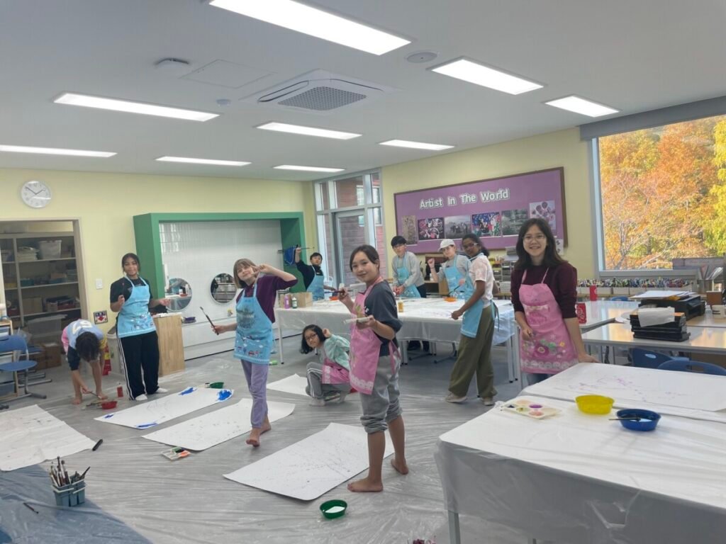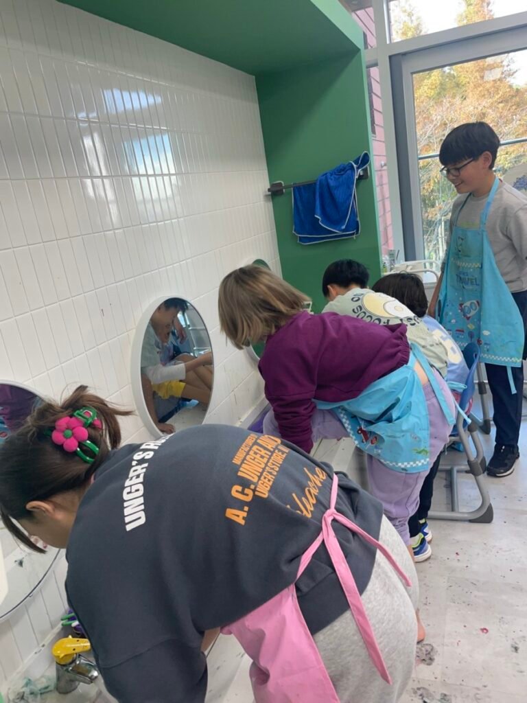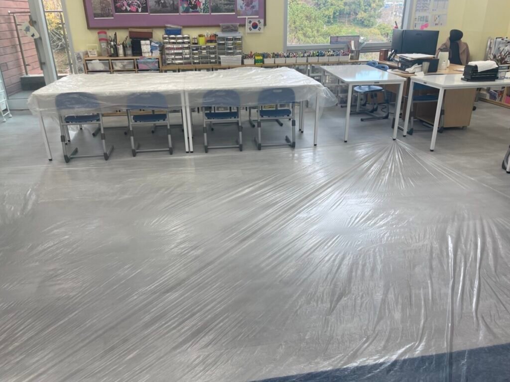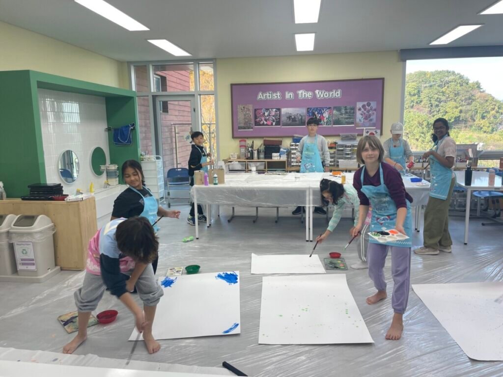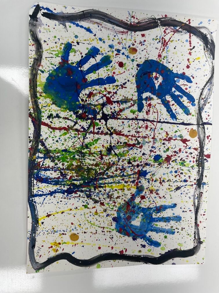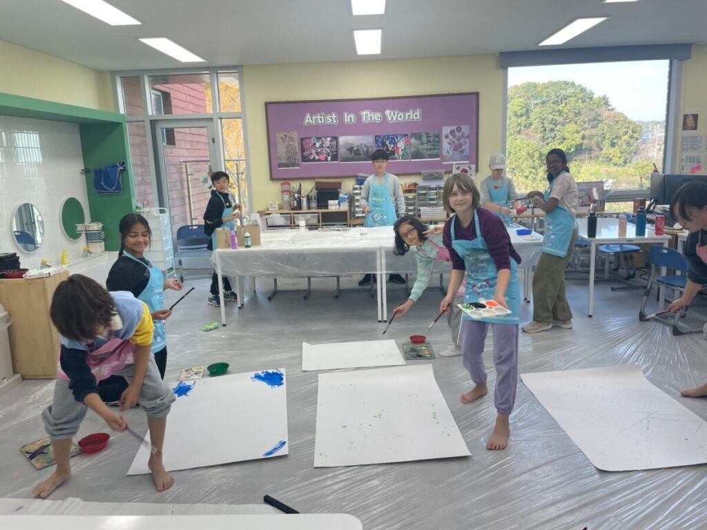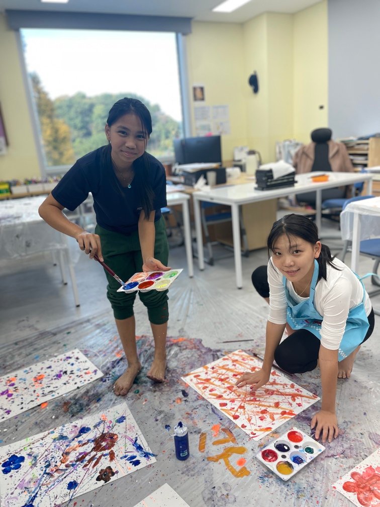 This week, we had our exciting ‘Action Painting’ activity! I set up coverings on the floor and desks to allow the children to paint freely, and a big thank you to Mr. Choi for helping me with the setup!