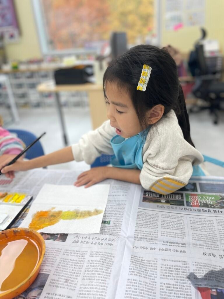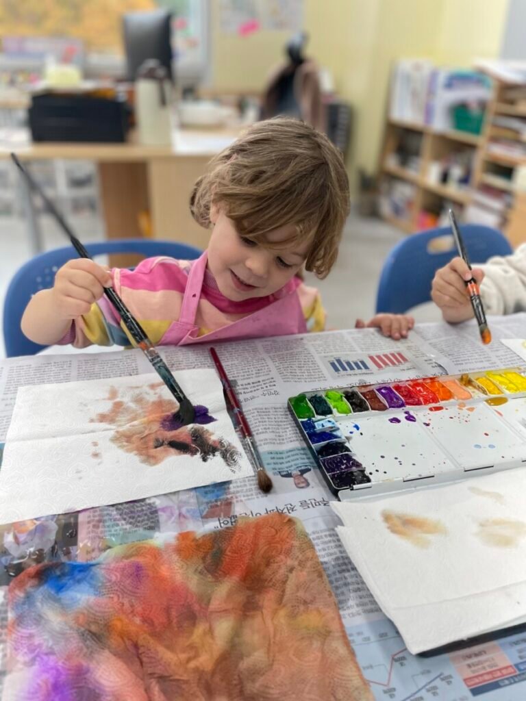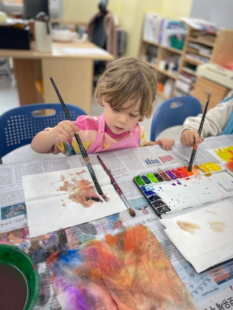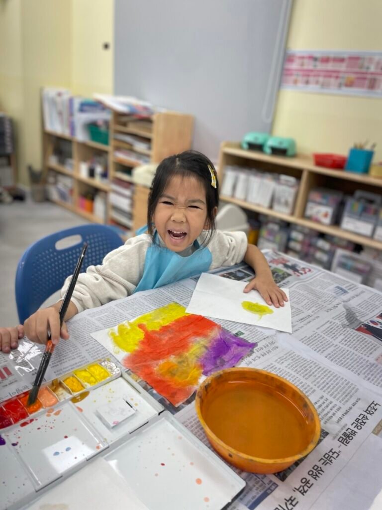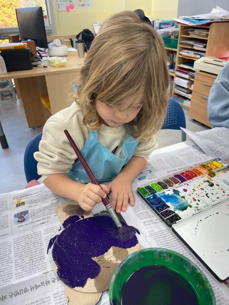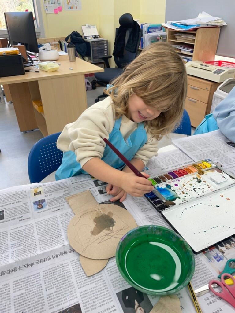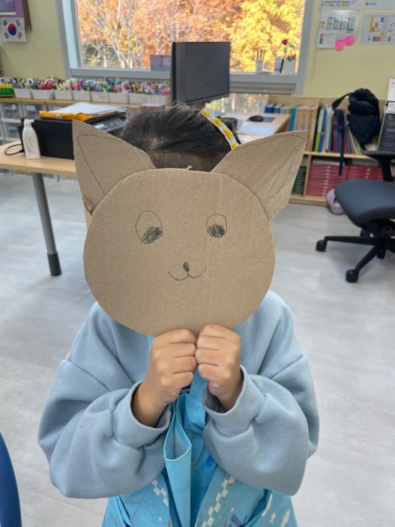 We also cut up a box to make cute cat masks. Additionally, the kids practiced how to hold a paintbrush properly, use watercolours, and tidy up afterward.