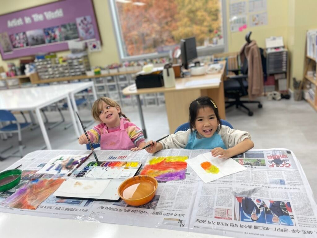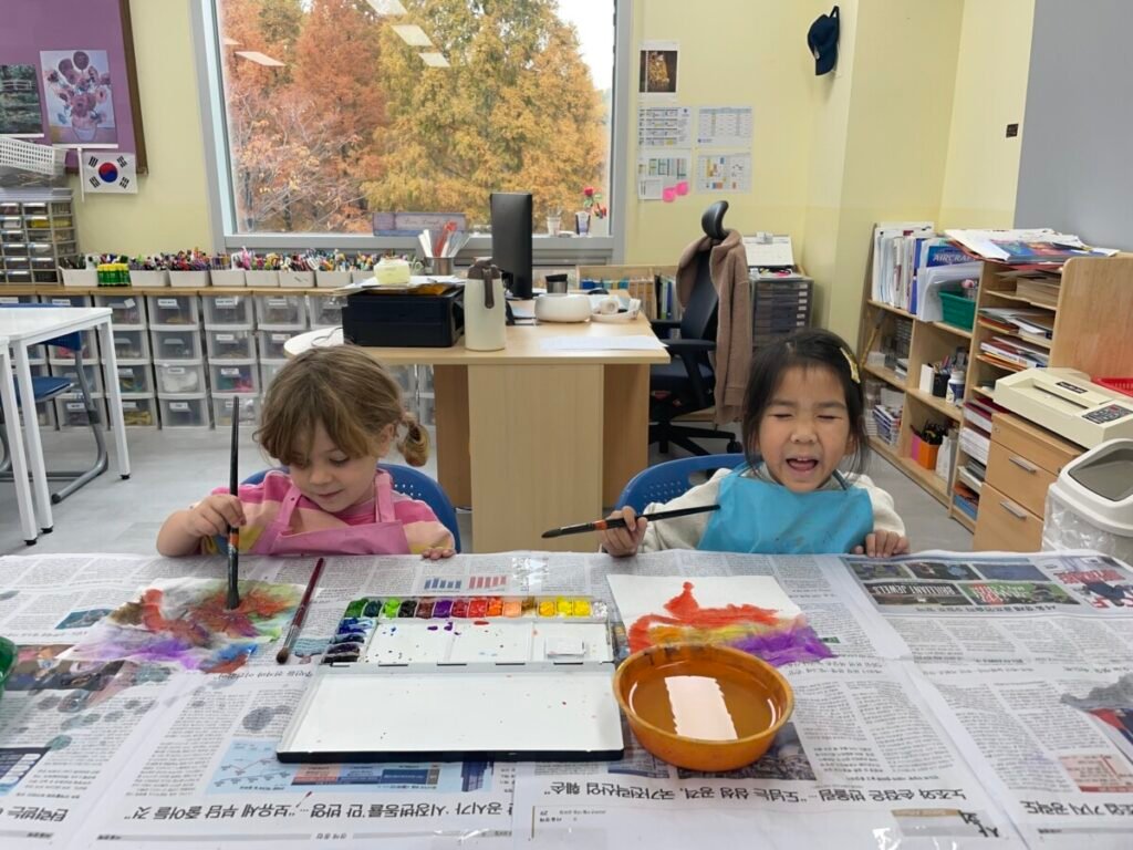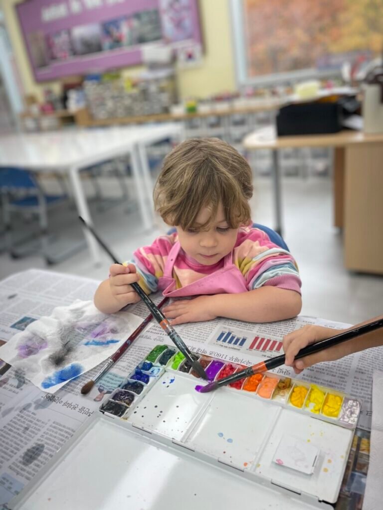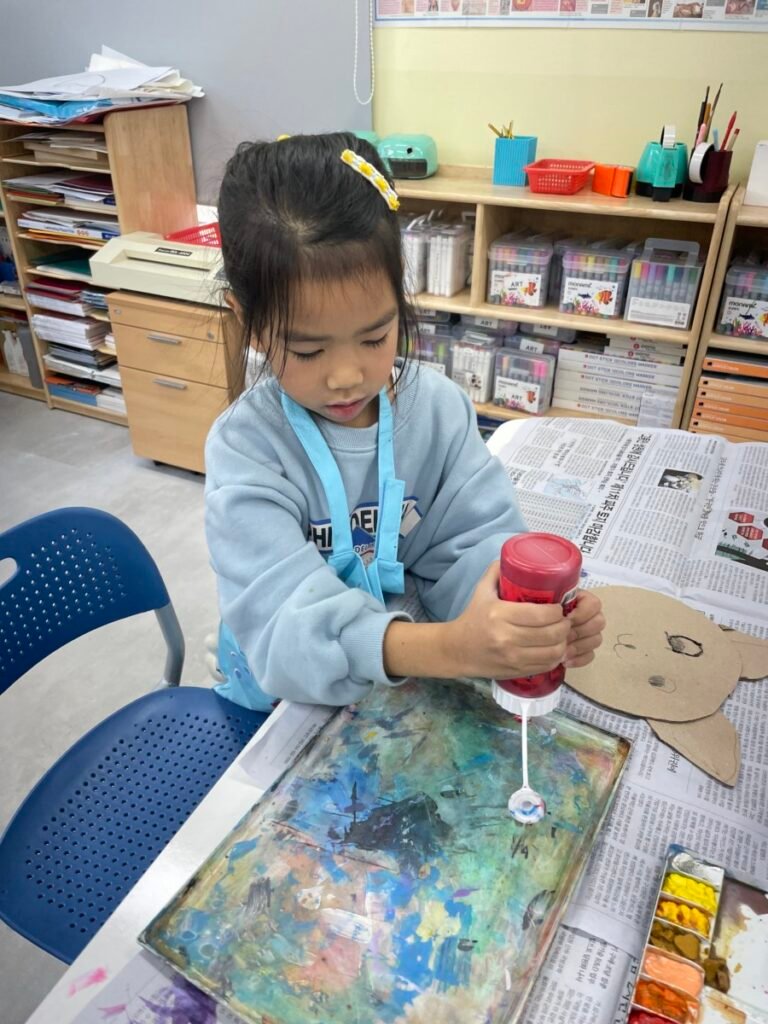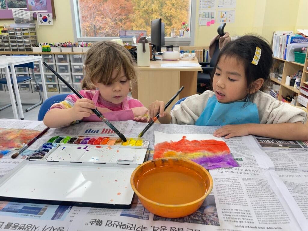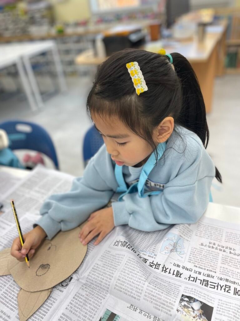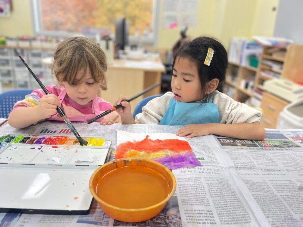 We also cut up a box to make cute cat masks. Additionally, the kids practiced how to hold a paintbrush properly, use watercolours, and tidy up afterward.