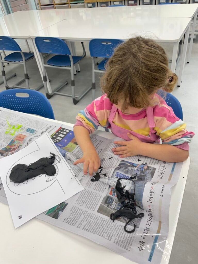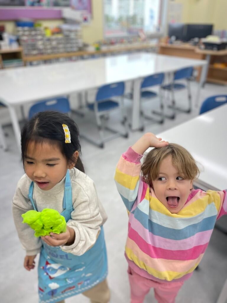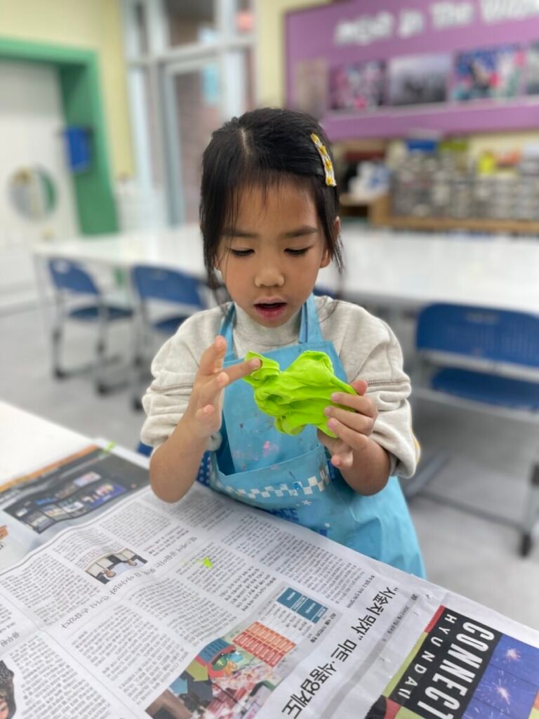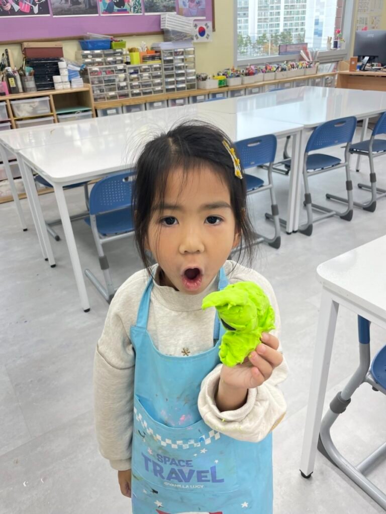 Yeseo and Maddison each chose their favorite colors of dough and shaped them into dinosaur figures, enjoying the soft and fun texture.