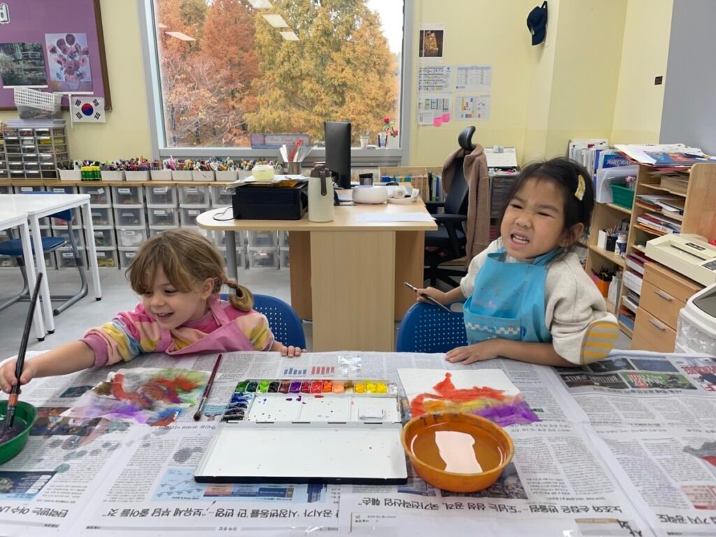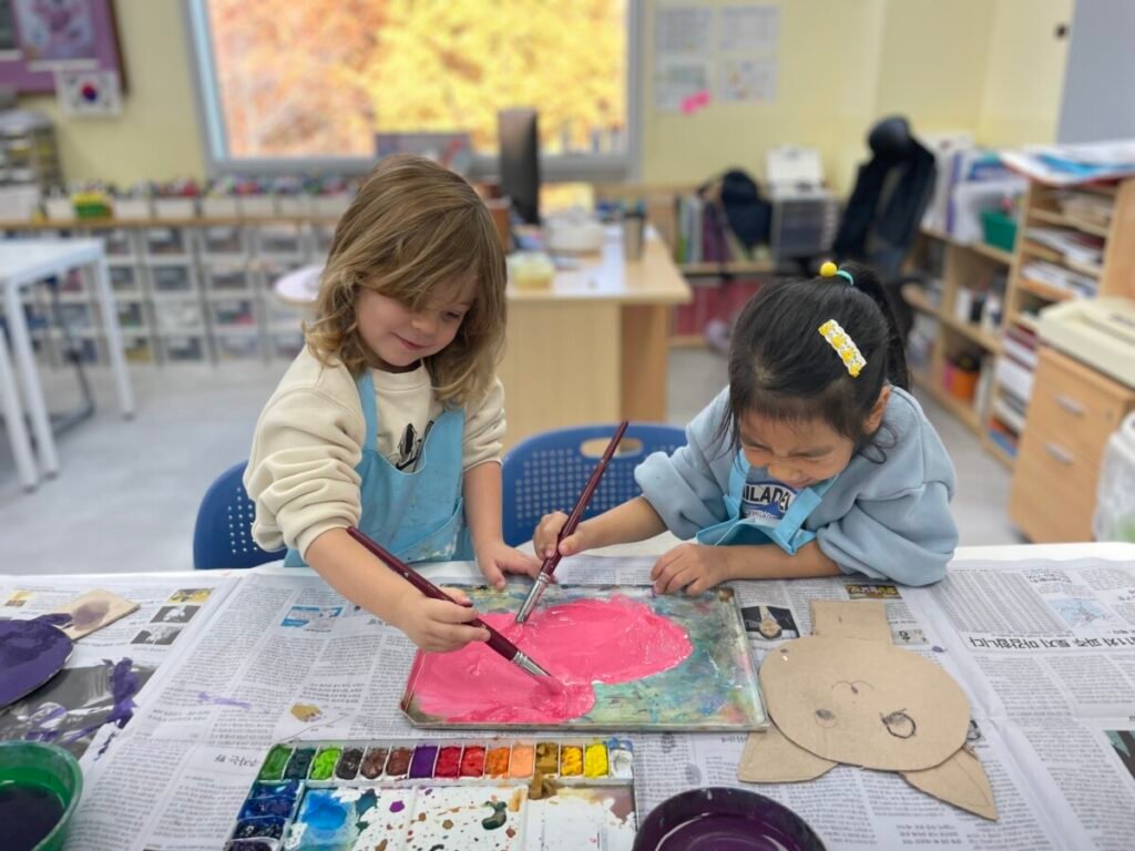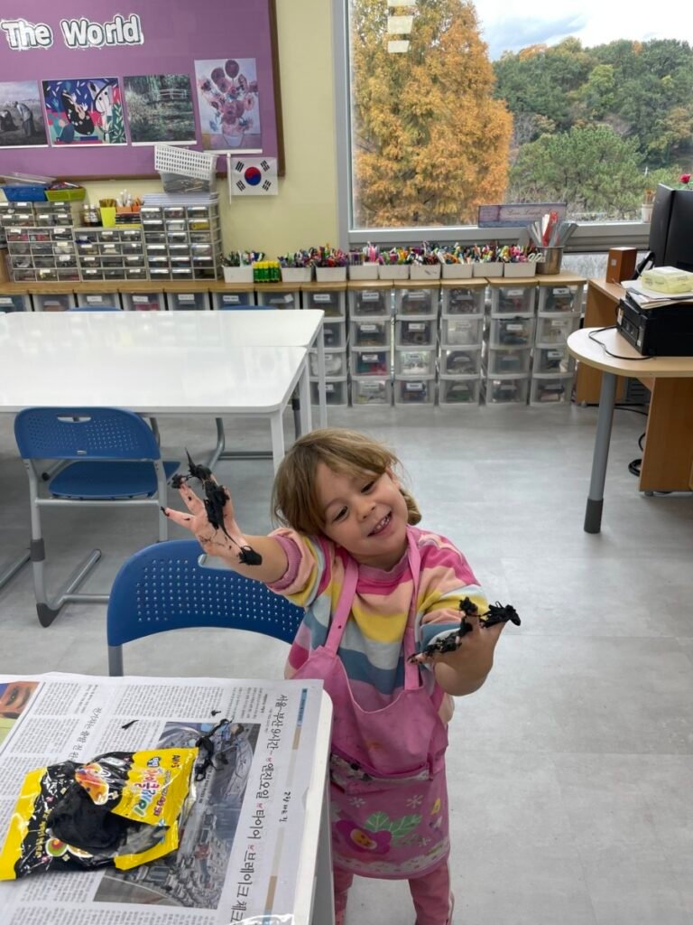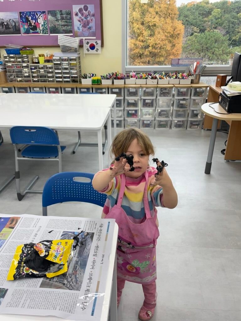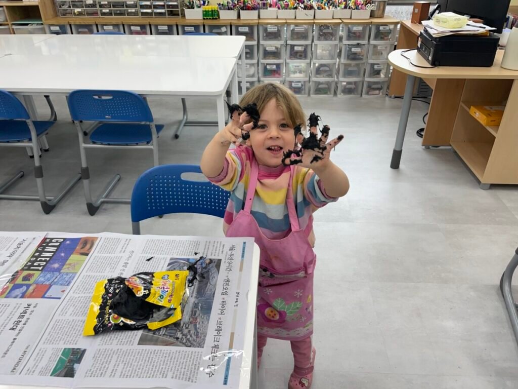 Yeseo and Maddison each chose their favorite colors of dough and shaped them into dinosaur figures, enjoying the soft and fun texture.