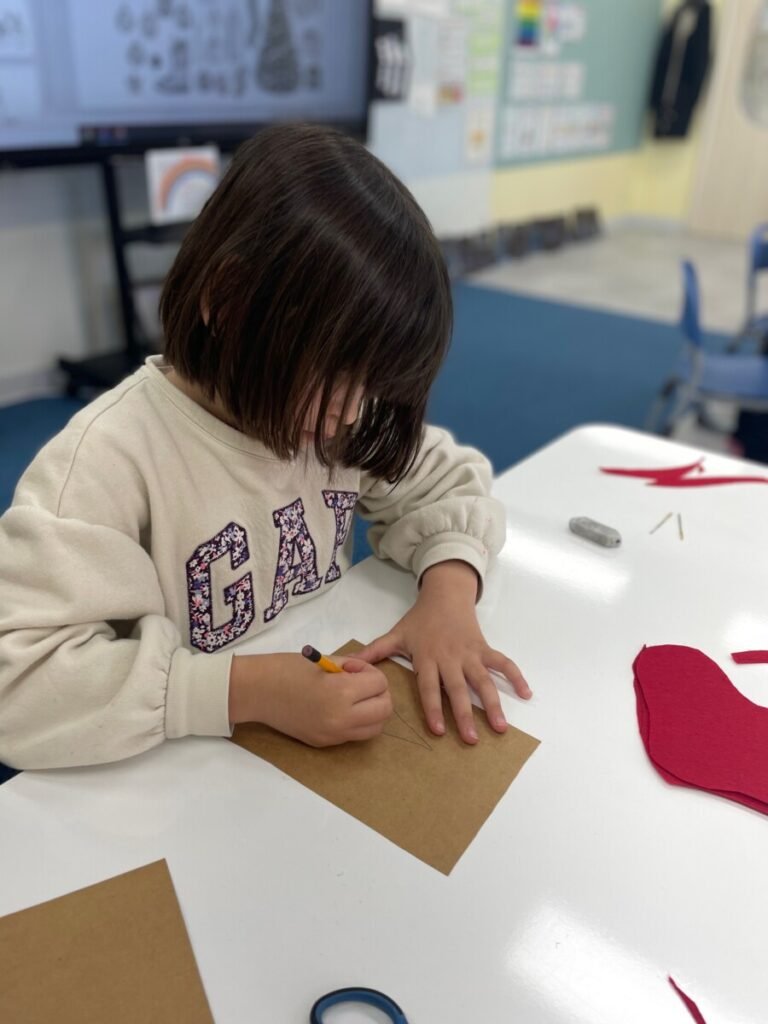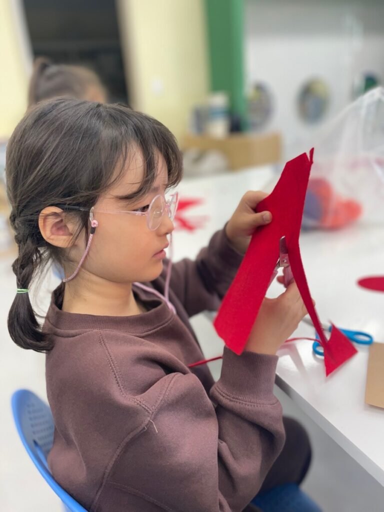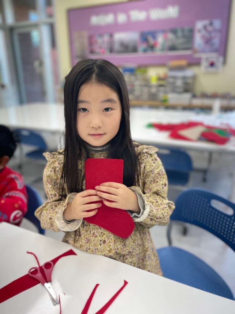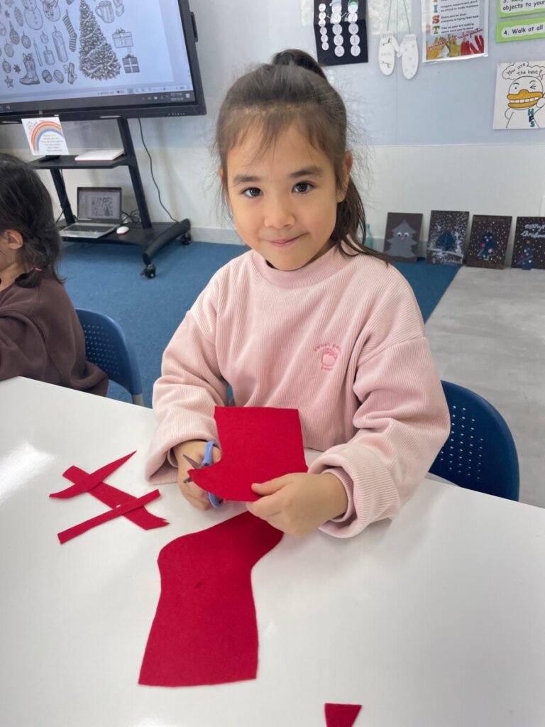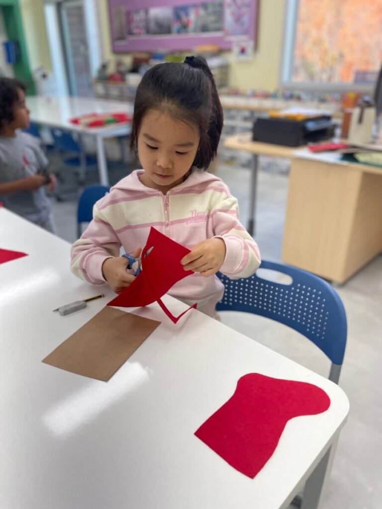 Additionally, we began making Christmas stockings using sewing skills. The students punched holes in the stockings, threaded thick, blunt needles with yarn, and started creating beautiful Christmas stockings. Next time, we’ll add more decorations to make the stockings even more festive and complete.