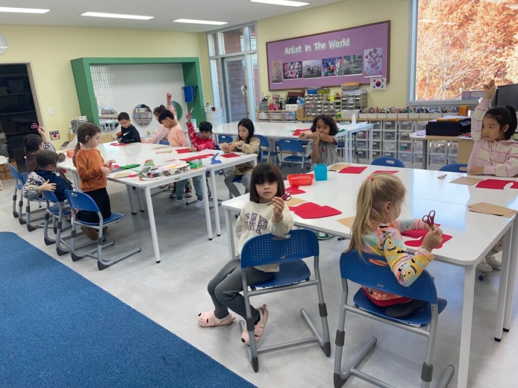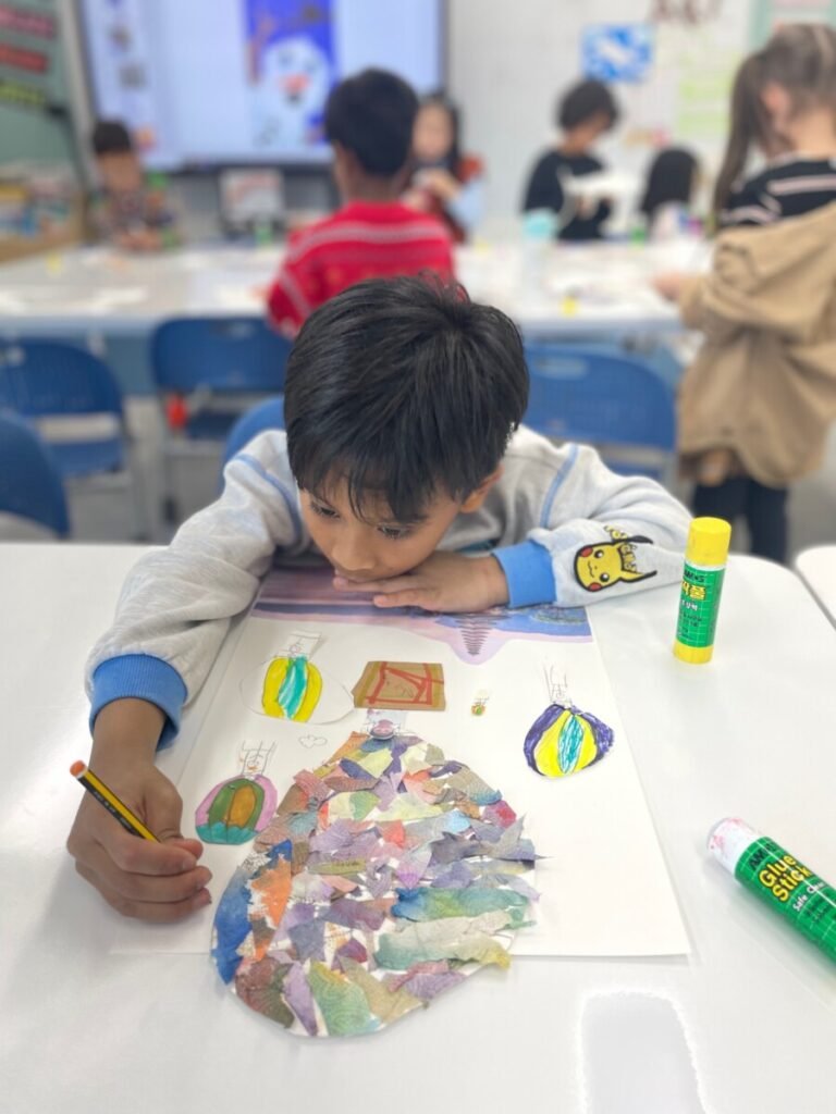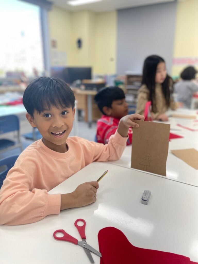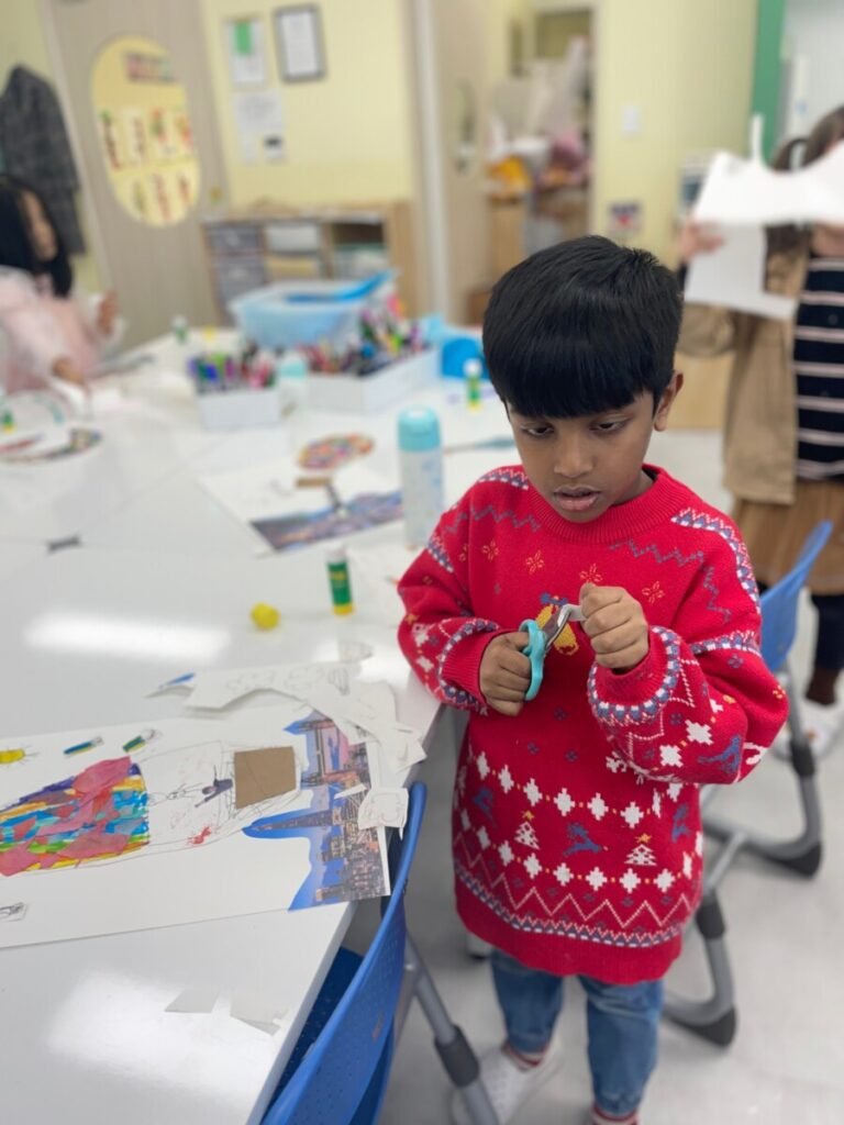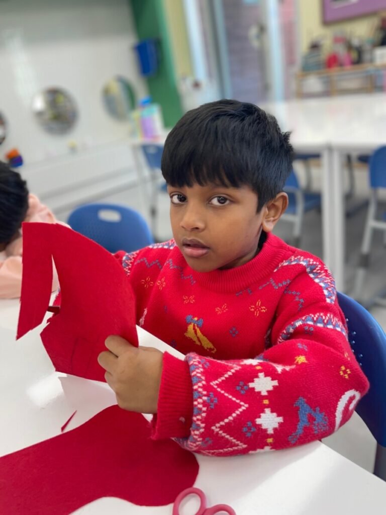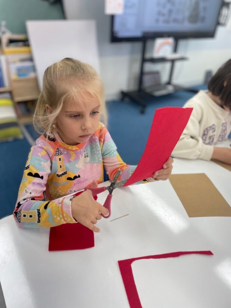Additionally, we began making Christmas stockings using sewing skills. The students punched holes in the stockings, threaded thick, blunt needles with yarn, and started creating beautiful Christmas stockings. Next time, we’ll add more decorations to make the stockings even more festive and complete.