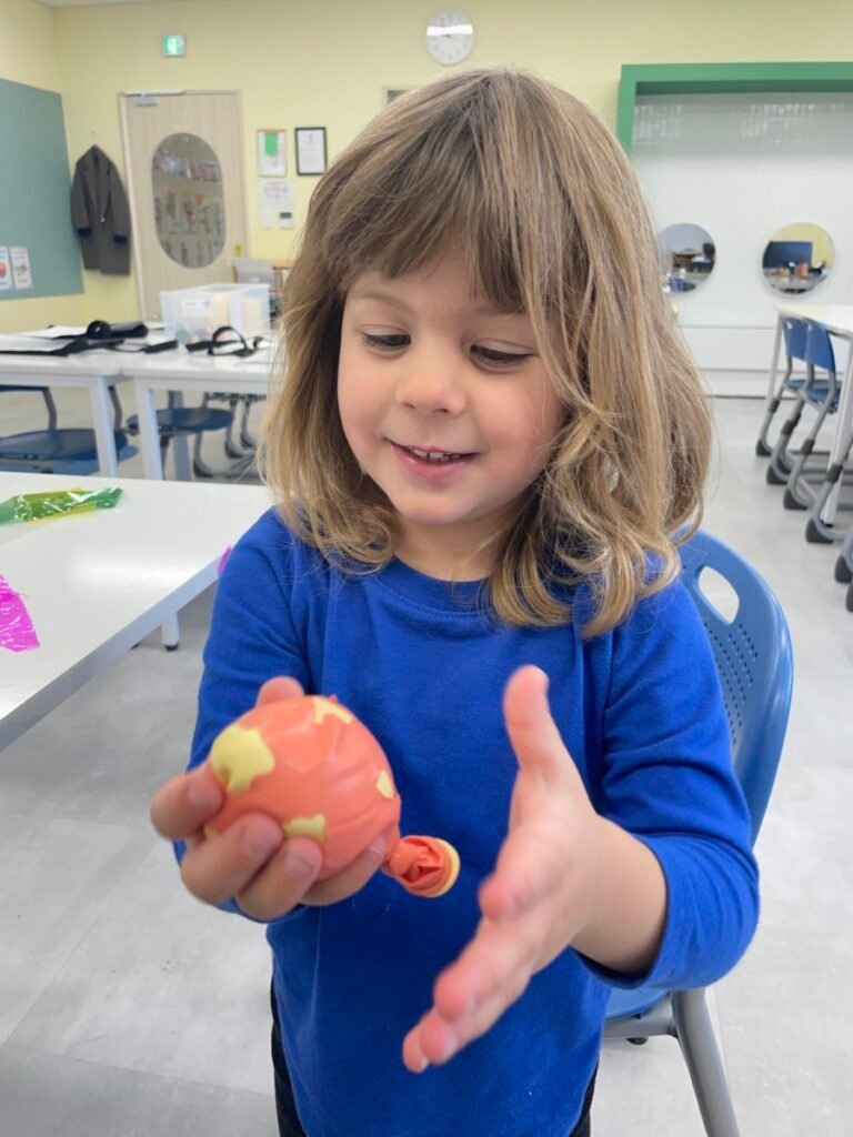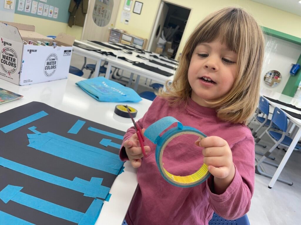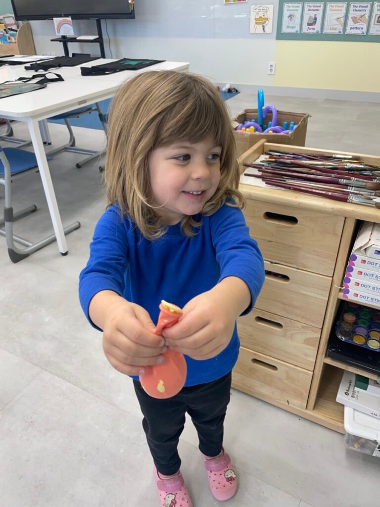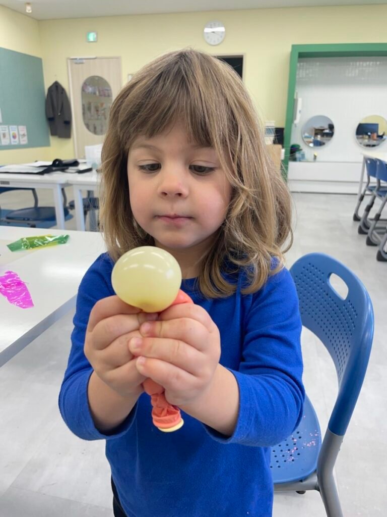 To start, we made buildings using masking tape, and then we stamped colourful patterns to create fireworks in the sky. Maddie was excited throughout the process. We also made a stress ball using balloons, which Maddie really enjoyed playing with. Unfortunately, it popped by the end of the session, but I promised her we’d make another one next week.