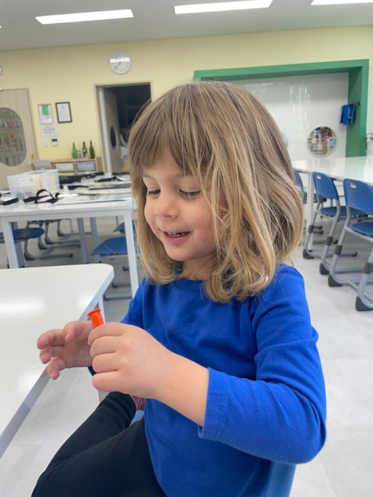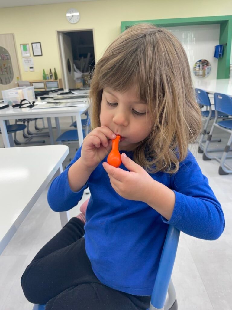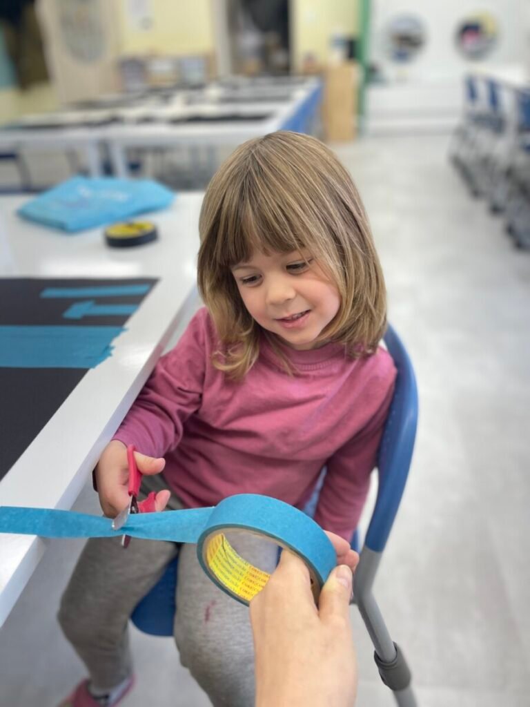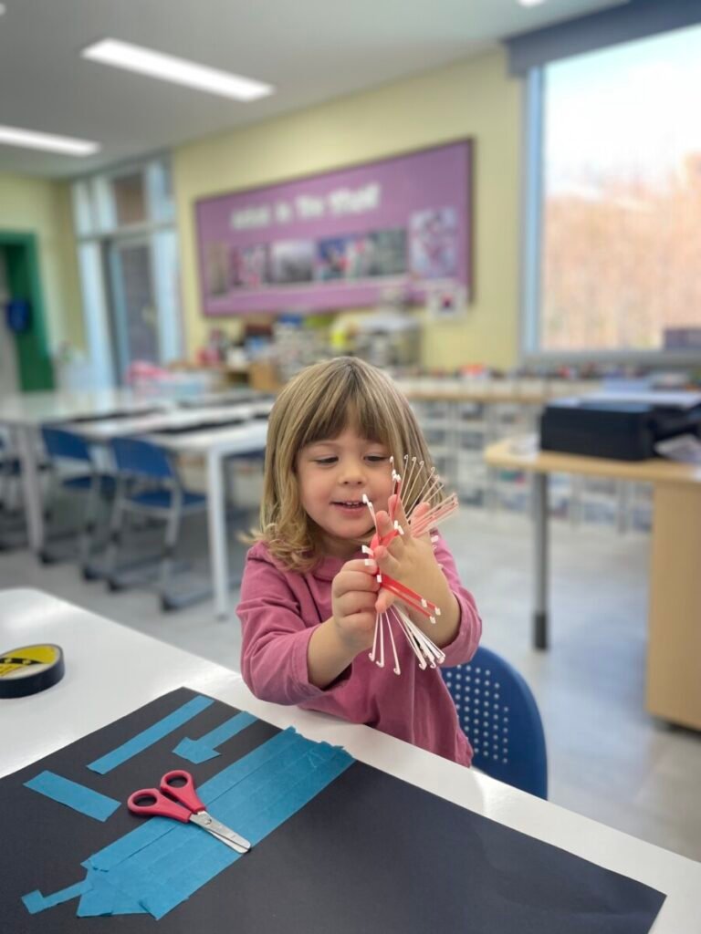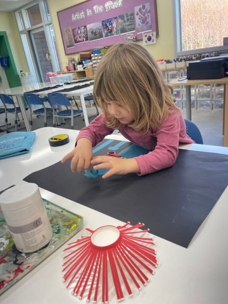 To start, we made buildings using masking tape, and then we stamped colourful patterns to create fireworks in the sky. Maddie was excited throughout the process. We also made a stress ball using balloons, which Maddie really enjoyed playing with. Unfortunately, it popped by the end of the session, but I promised her we’d make another one next week.