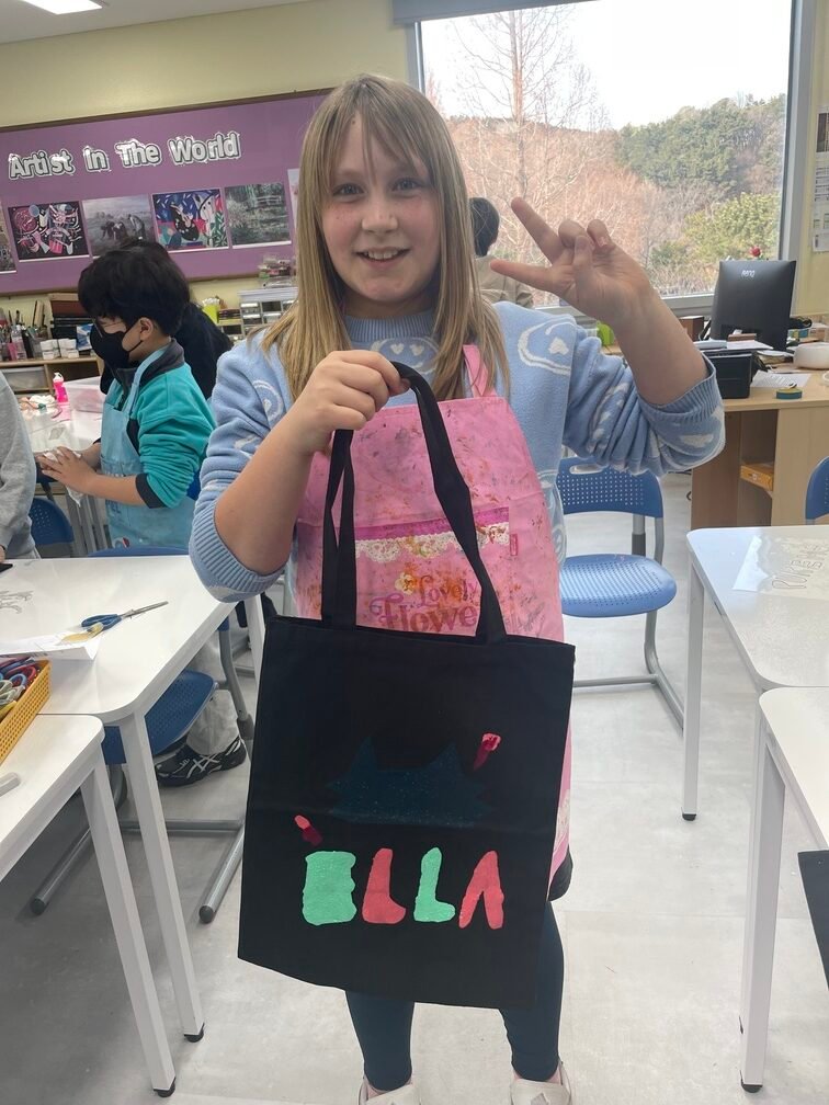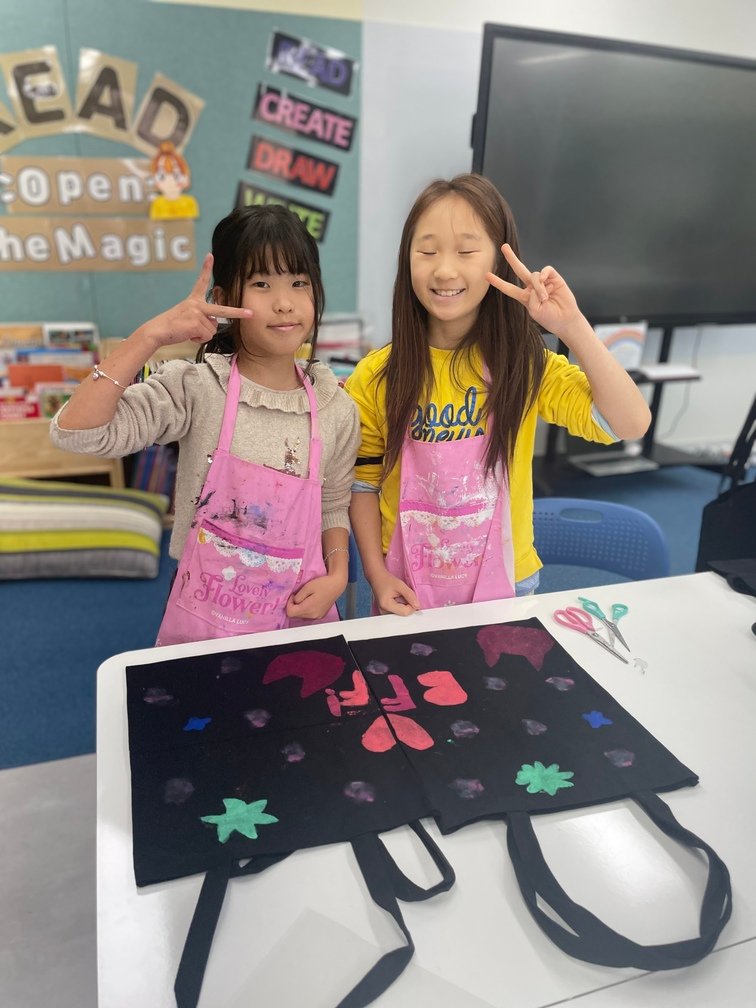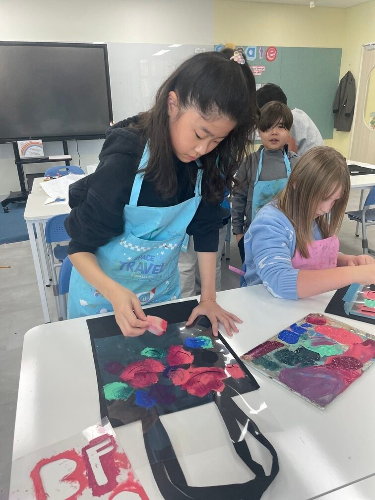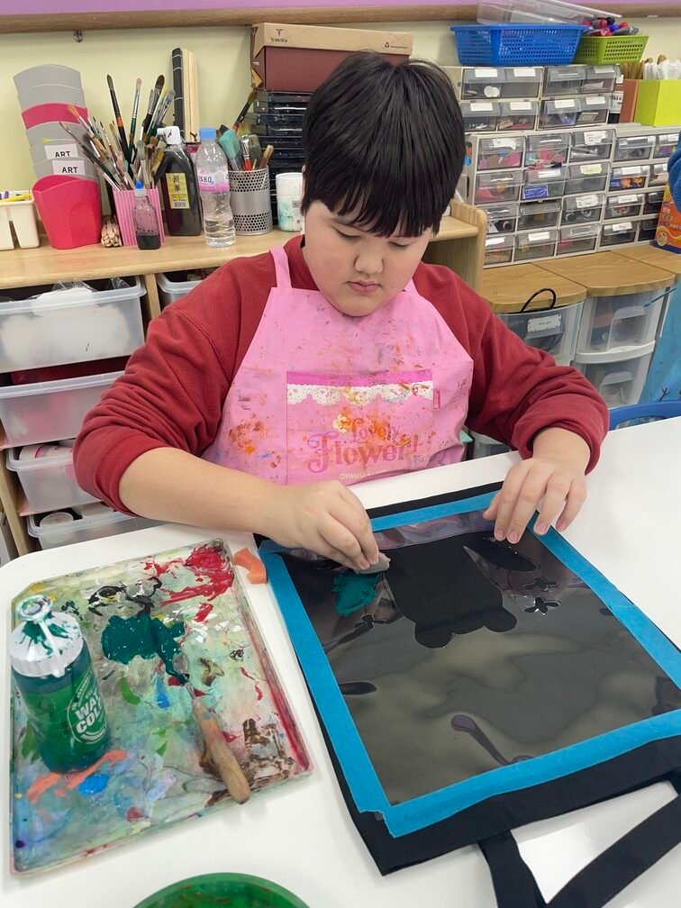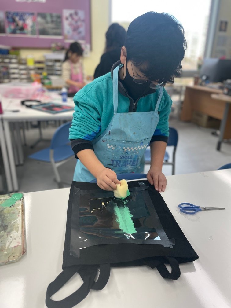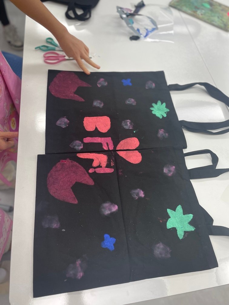 This week marked the beginning of the new term, and I planned a fun and creative activity for the Year 5-6 students. They created beautiful canvas bags using the stencil technique. First, the students designed their desired images on OHP film and carefully cut out the shapes to create stencils. Then, they used sponges to stamp paint through the stencils onto the bags, bringing their designs to life. It was an engaging and enjoyable project!