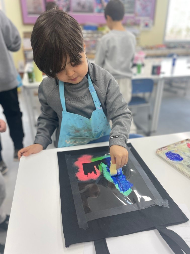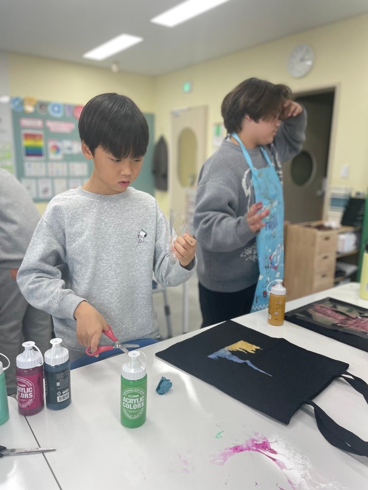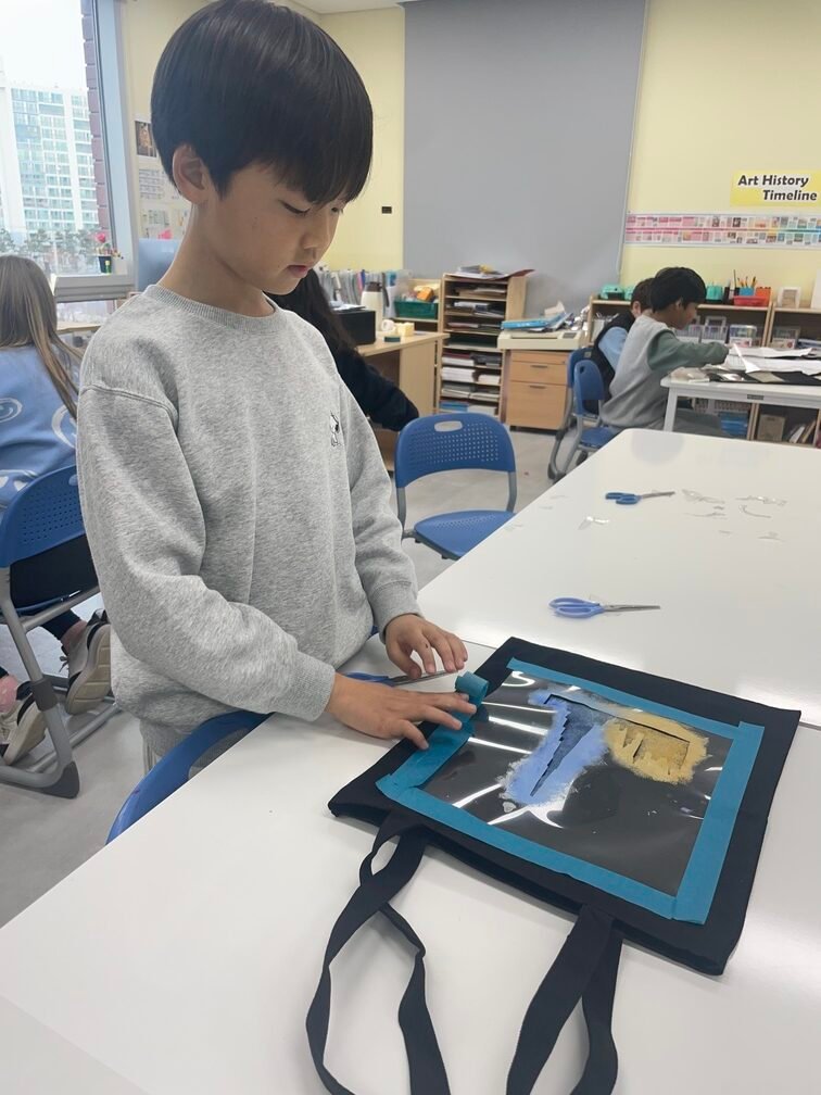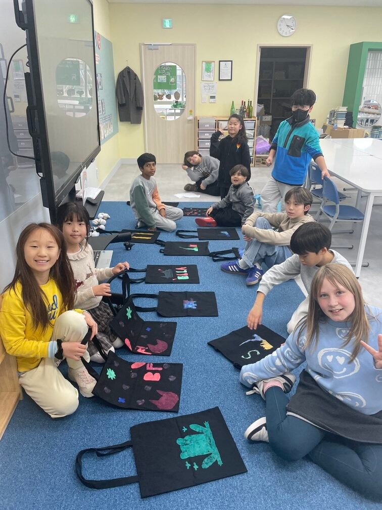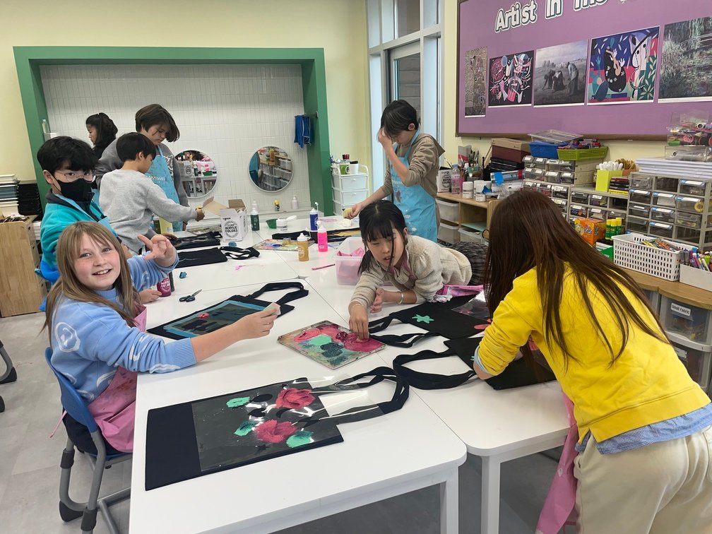 This week marked the beginning of the new term, and I planned a fun and creative activity for the Year 5-6 students. They created beautiful canvas bags using the stencil technique. First, the students designed their desired images on OHP film and carefully cut out the shapes to create stencils. Then, they used sponges to stamp paint through the stencils onto the bags, bringing their designs to life. It was an engaging and enjoyable project!