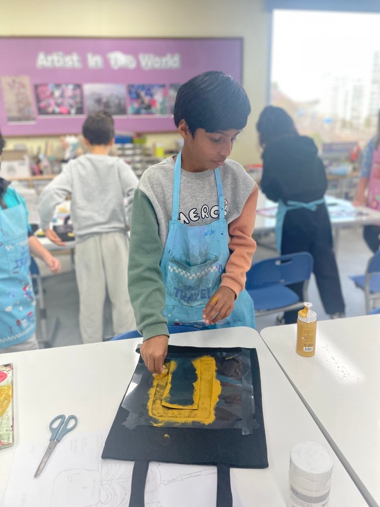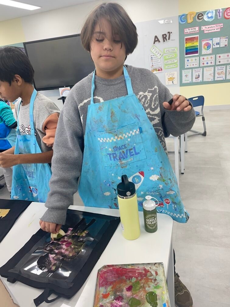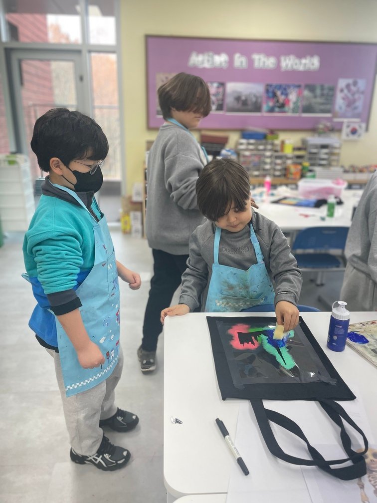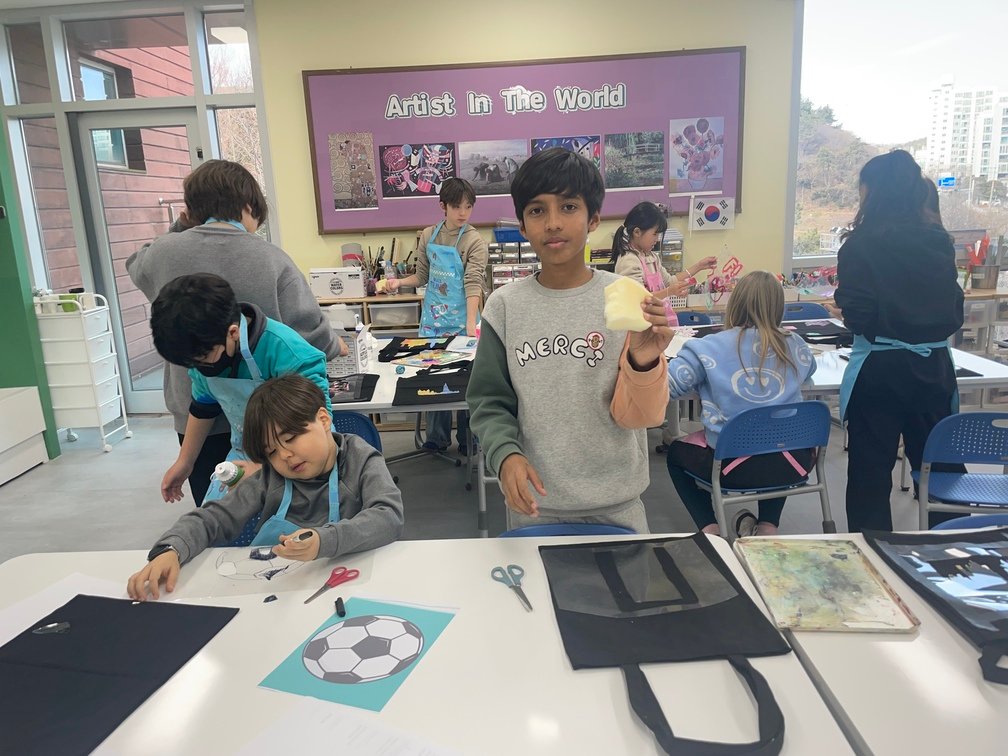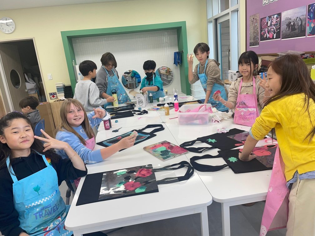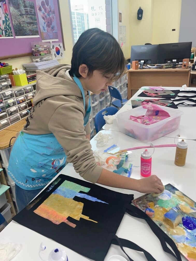 This week marked the beginning of the new term, and I planned a fun and creative activity for the Year 5-6 students. They created beautiful canvas bags using the stencil technique. First, the students designed their desired images on OHP film and carefully cut out the shapes to create stencils. Then, they used sponges to stamp paint through the stencils onto the bags, bringing their designs to life. It was an engaging and enjoyable project!