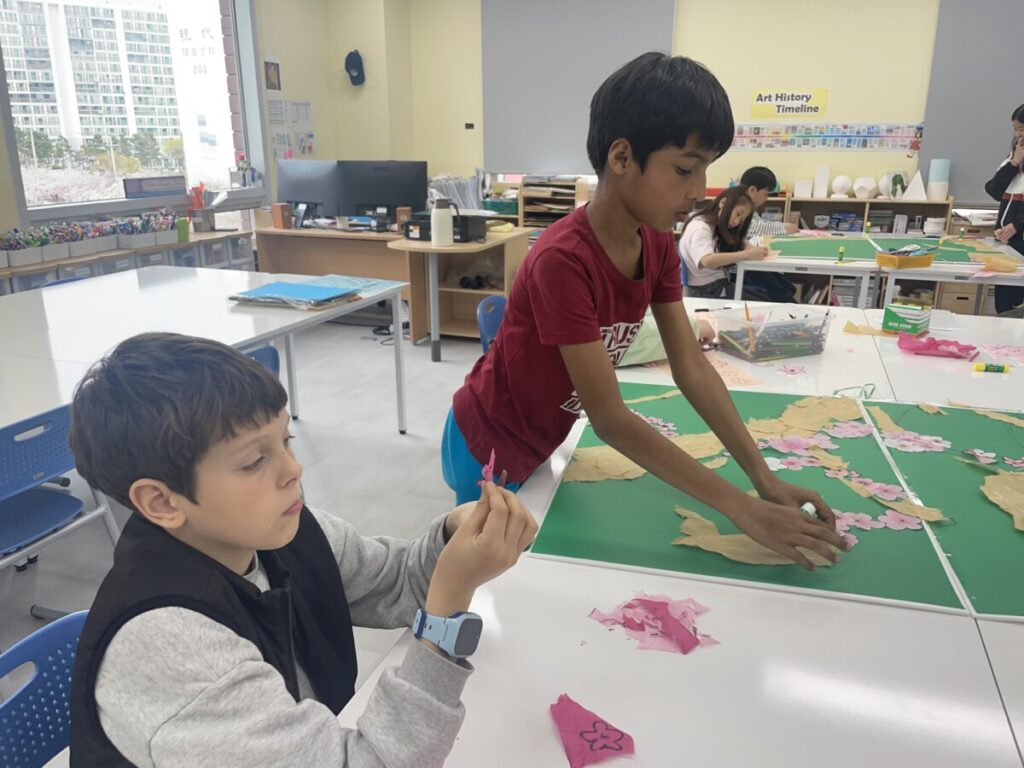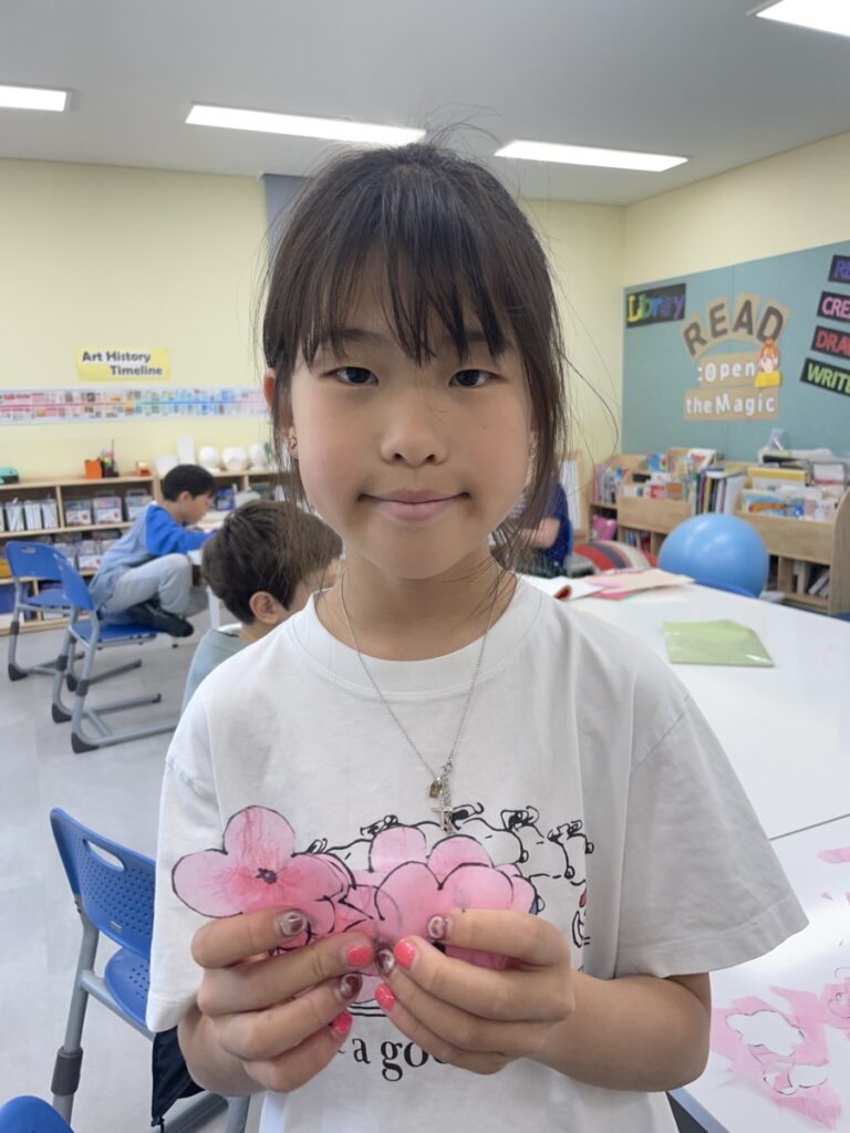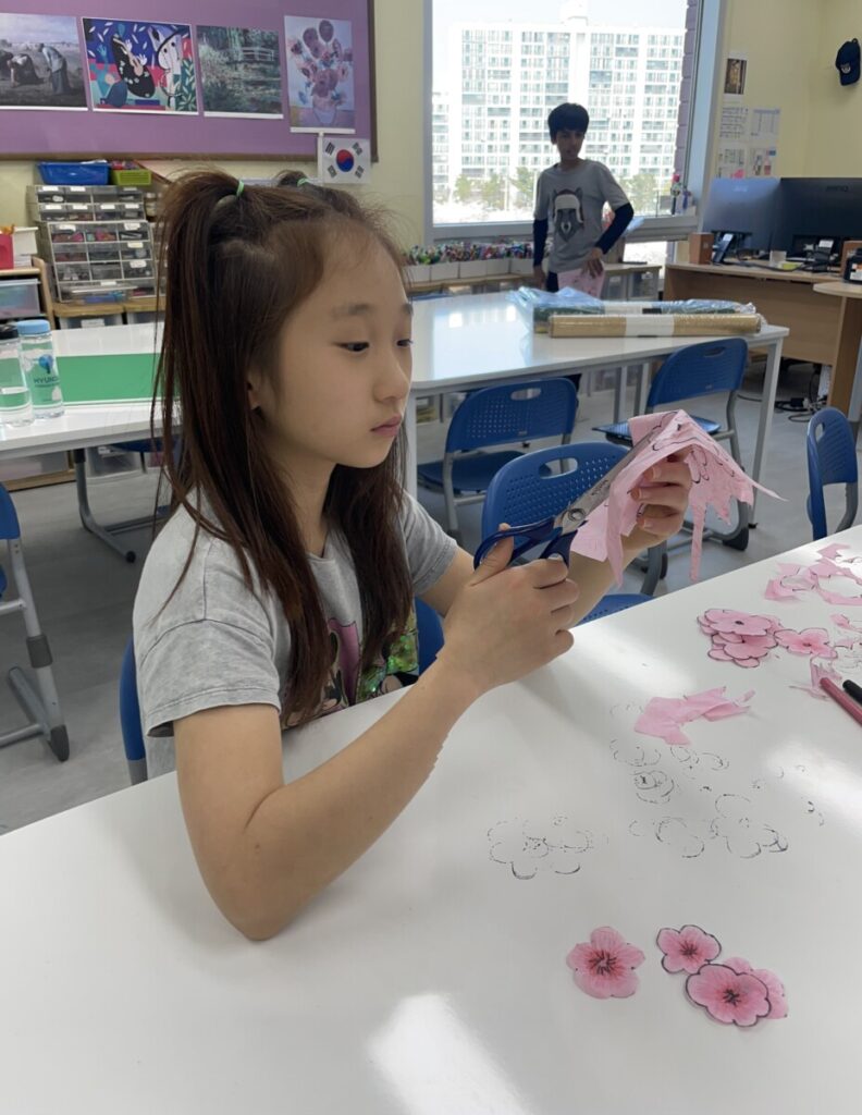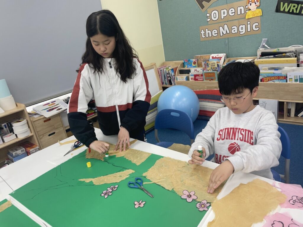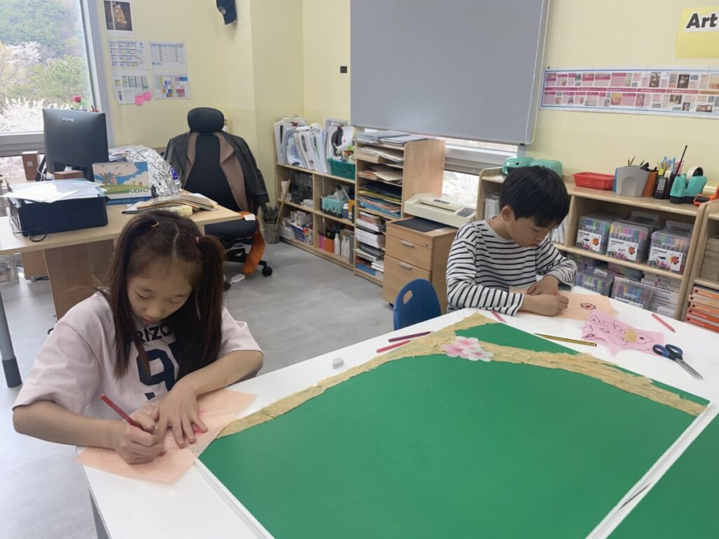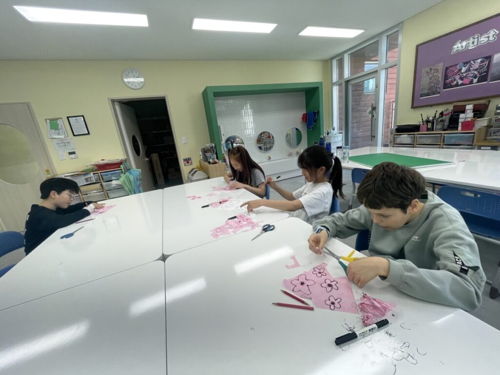 The year5-6 students began exploring and expressing traditional Korean art through collage techniques using hanji (traditional Korean paper). They learned about five symbolic plants often found in Korean art — plum blossom (maehwa), orchid (nan), chrysanthemum (gukhwa), bamboo (juk), and lotus (yeonkkot) — and began creating artworks inspired by these elements.