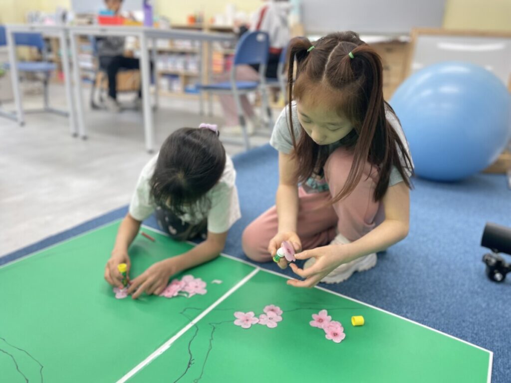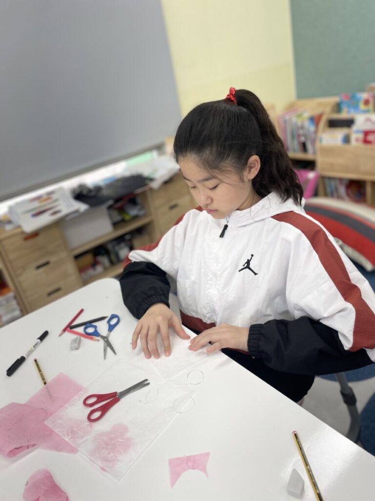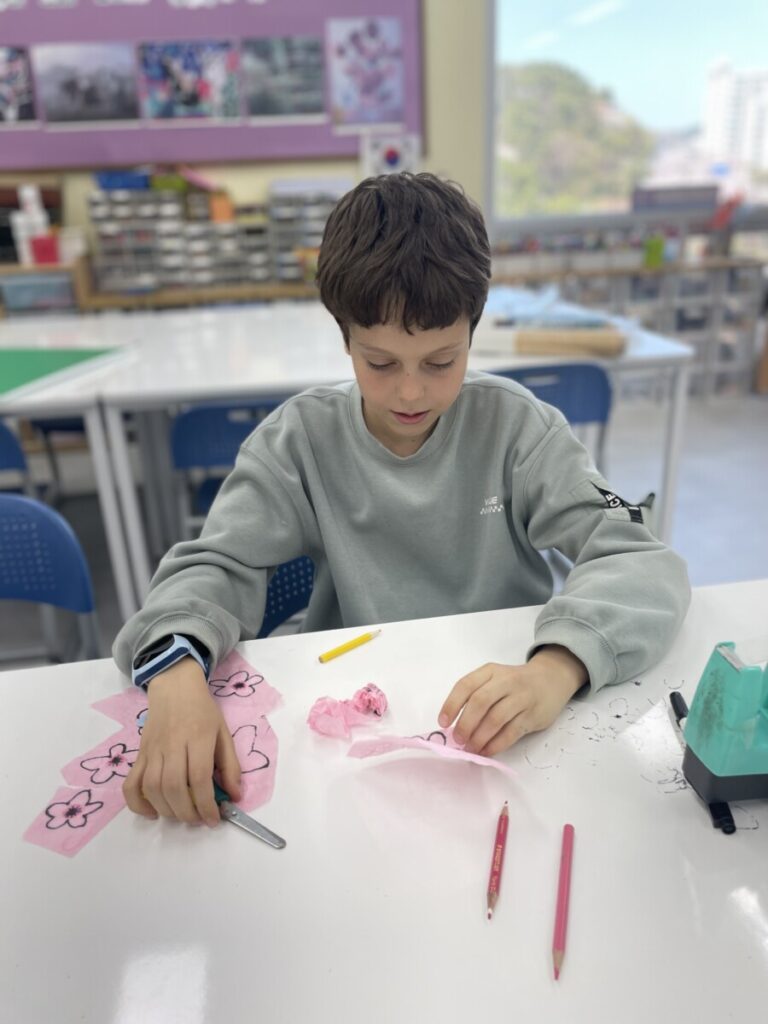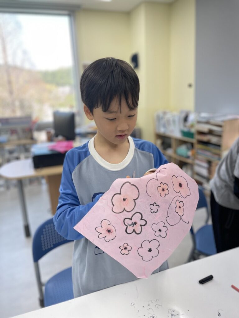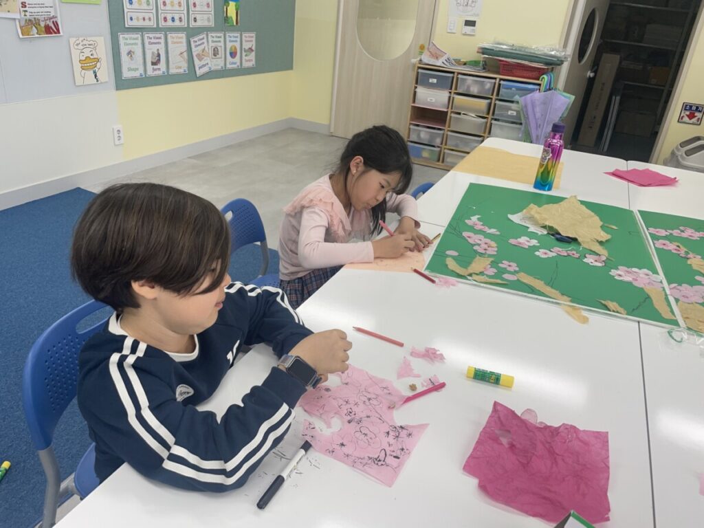 The Year 5–6 students worked in groups to design beautiful plum blossom pieces. They stayed focused and thoughtfully created unique flower patterns in their own styles. To form the tree trunks, they carefully tore pieces of hanji, which added a natural and textured look to their work.
