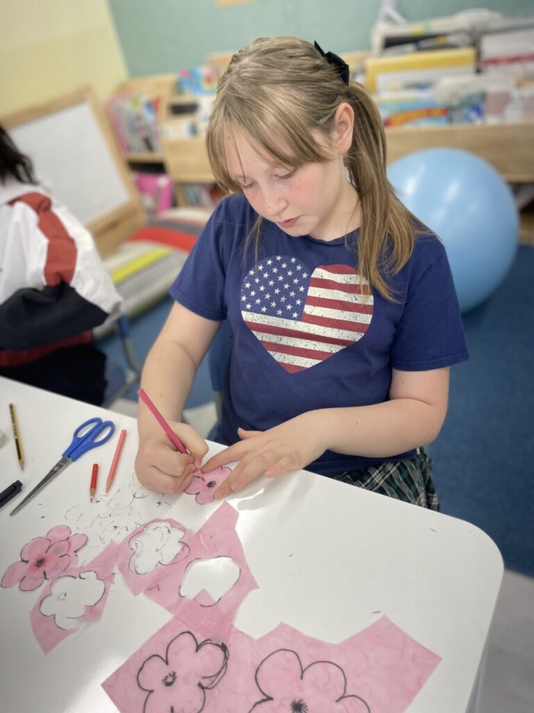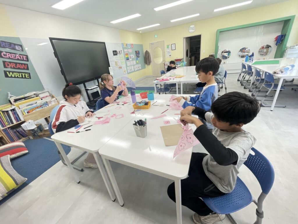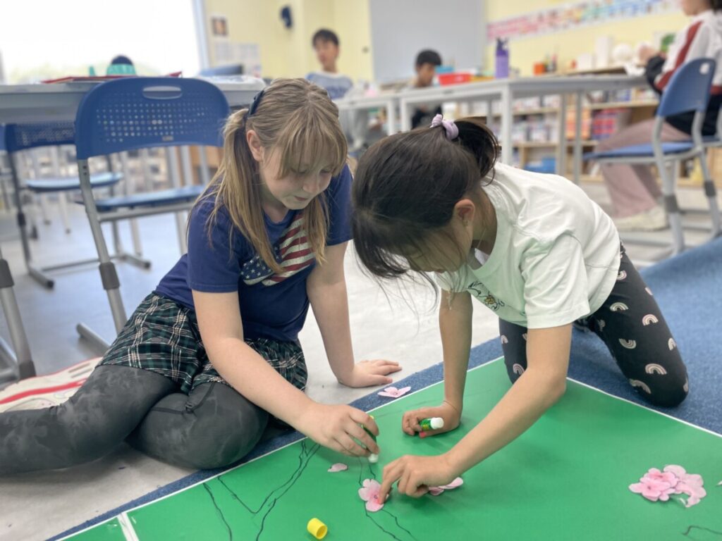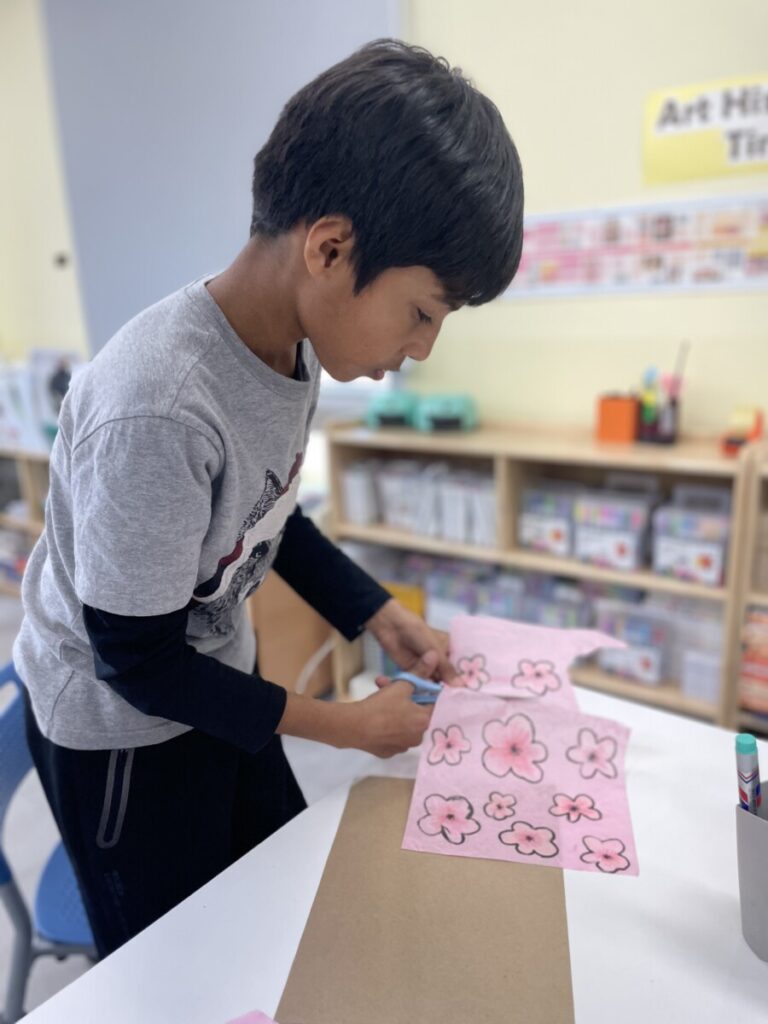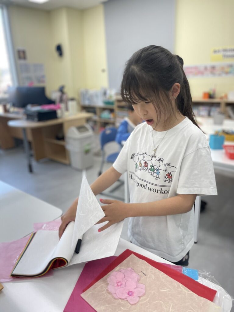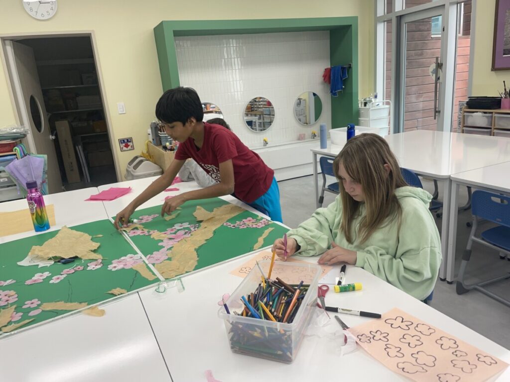 The Year 5–6 students worked in groups to design beautiful plum blossom pieces. They stayed focused and thoughtfully created unique flower patterns in their own styles. To form the tree trunks, they carefully tore pieces of hanji, which added a natural and textured look to their work.