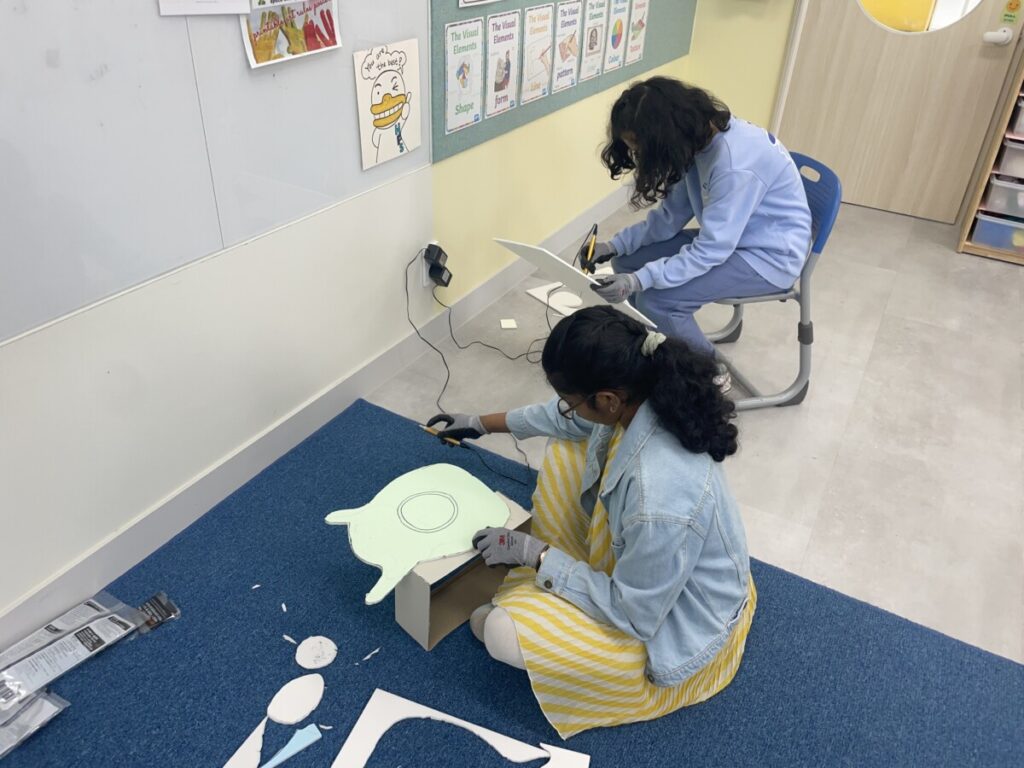 After finalizing their designs, they carefully cut out the guitar shapes using an electric cutter.