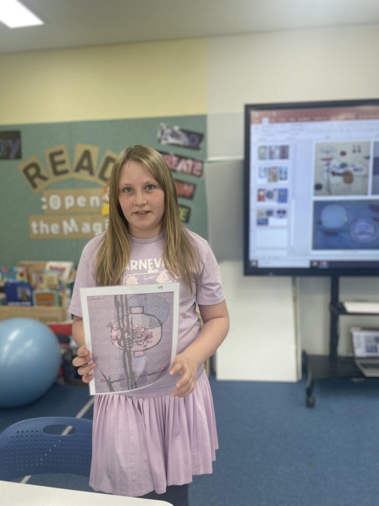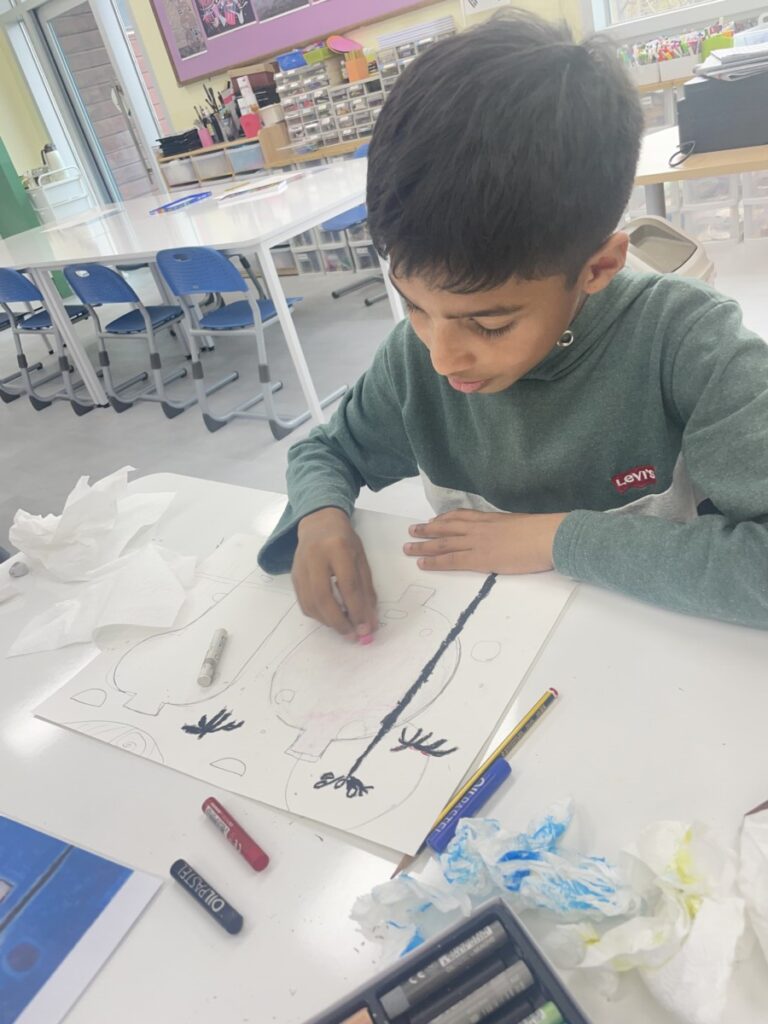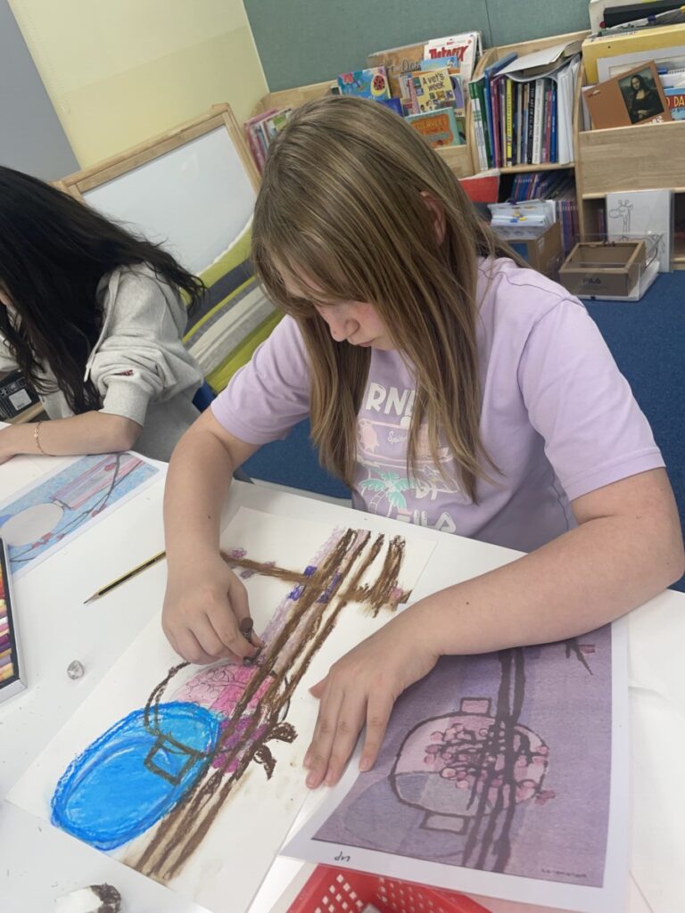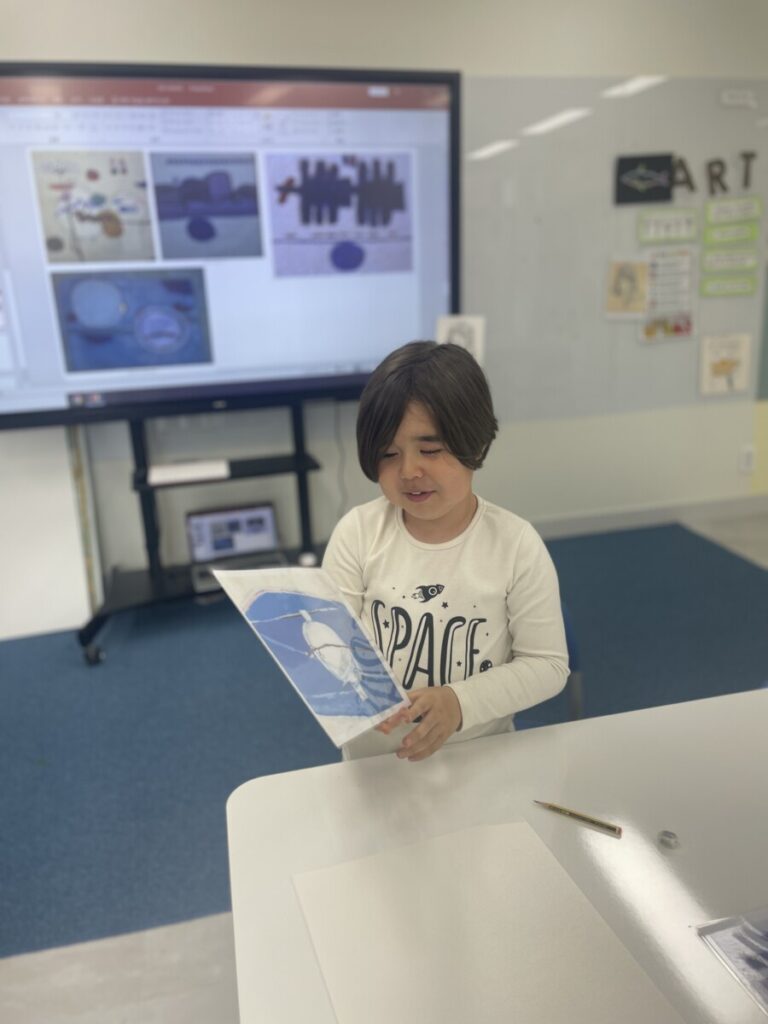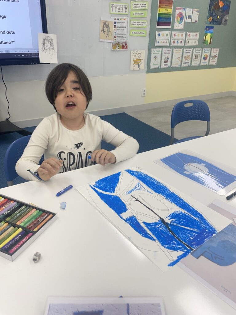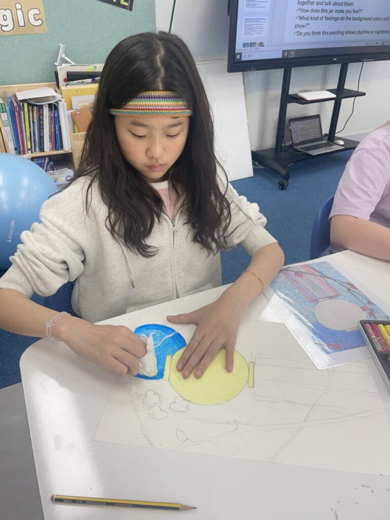 The students explored how he used soft colours, dots, and lines to express the feelings of the sky, the moon, stars, and nature in his paintings.