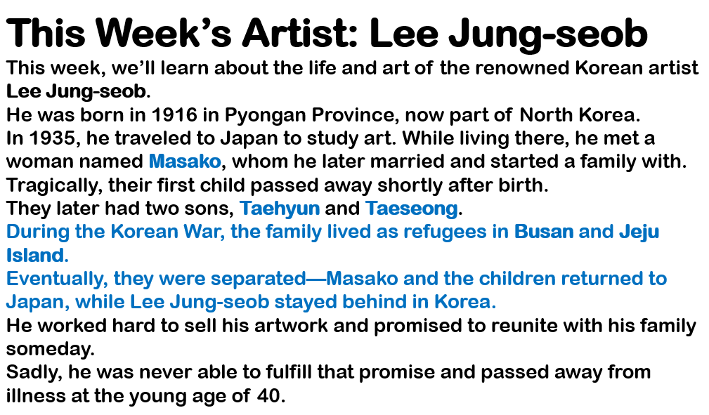 This week, Yeseo learned about the renowned Korean artist Lee Jung-seob.