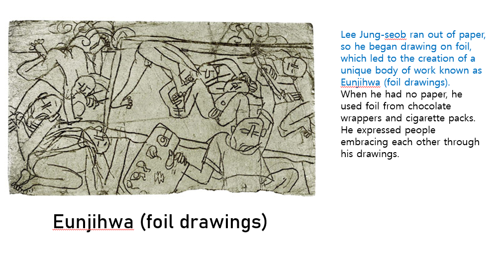 We also discovered that during difficult times, when he couldn’t afford proper materials, Lee Jung-seob created art using silver foil from cigarette packs and chocolate wrappers.