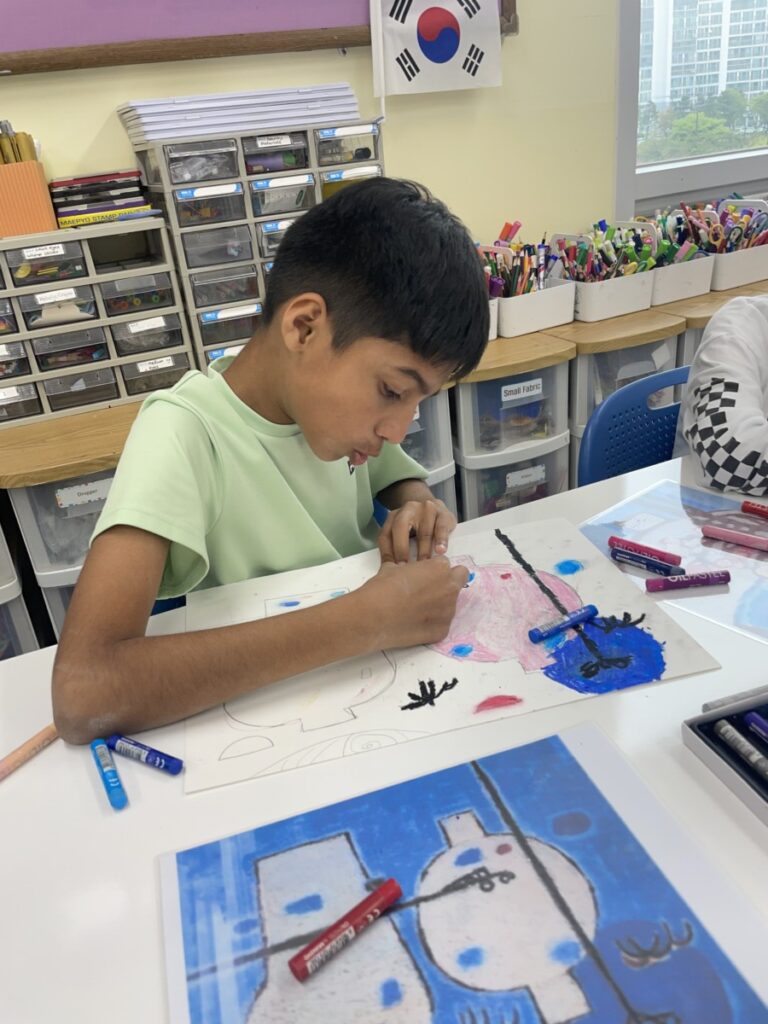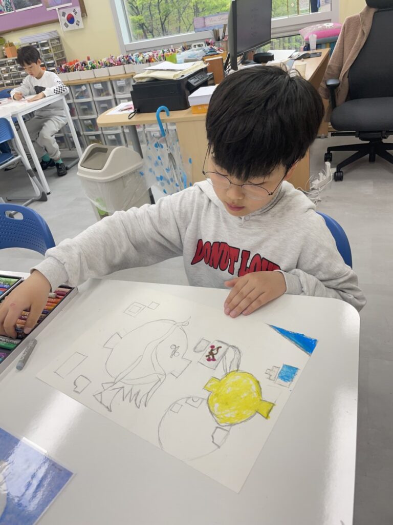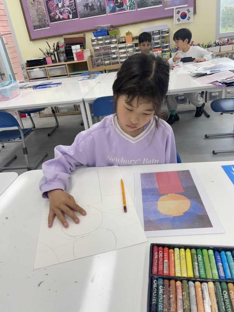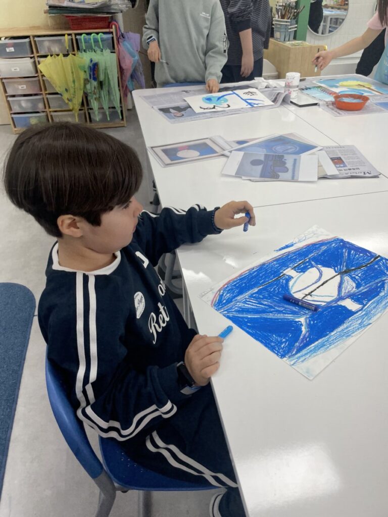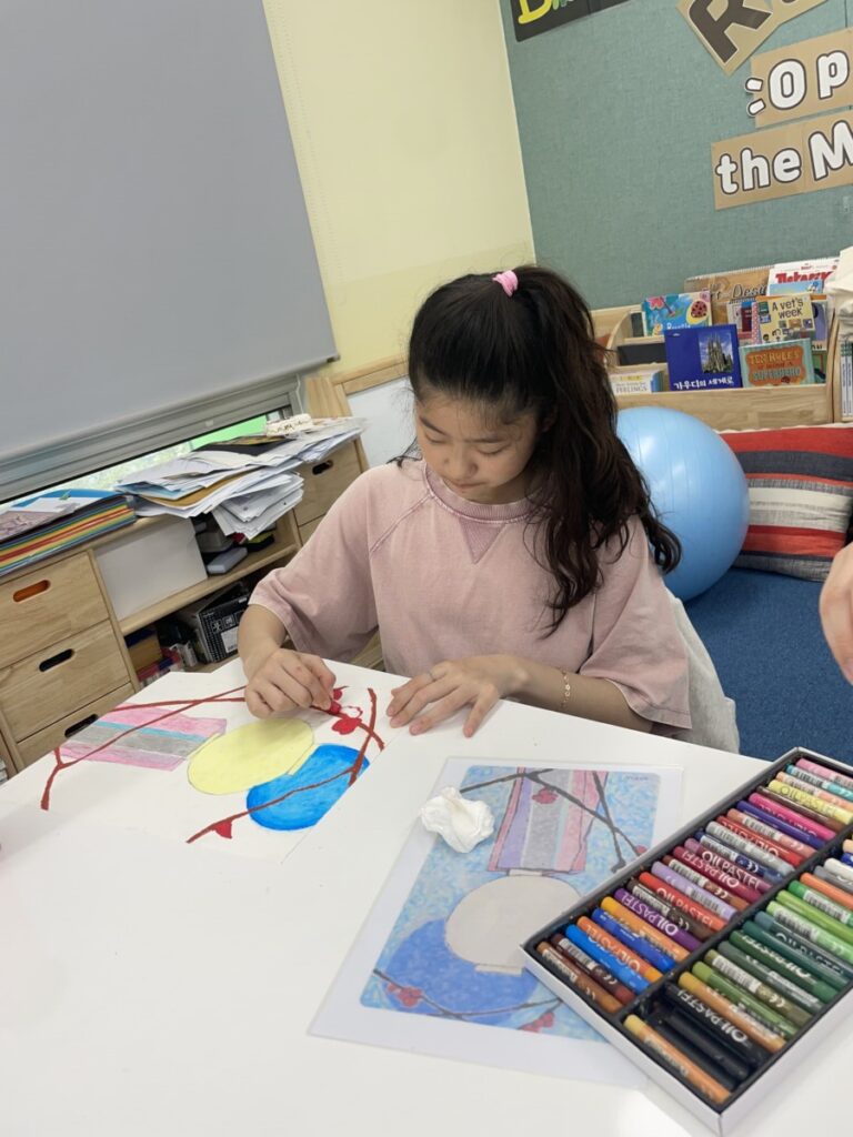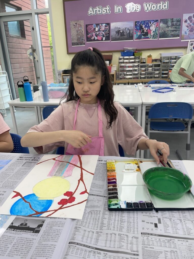Building on last week’s lesson, the children added colour and detail to their own interpretations of Kim Whanki’s paintings, inspired by the masterpiece they had chosen. They carefully painted the remaining parts, thoughtfully using soft colours, dots, and lines just like the artist did.