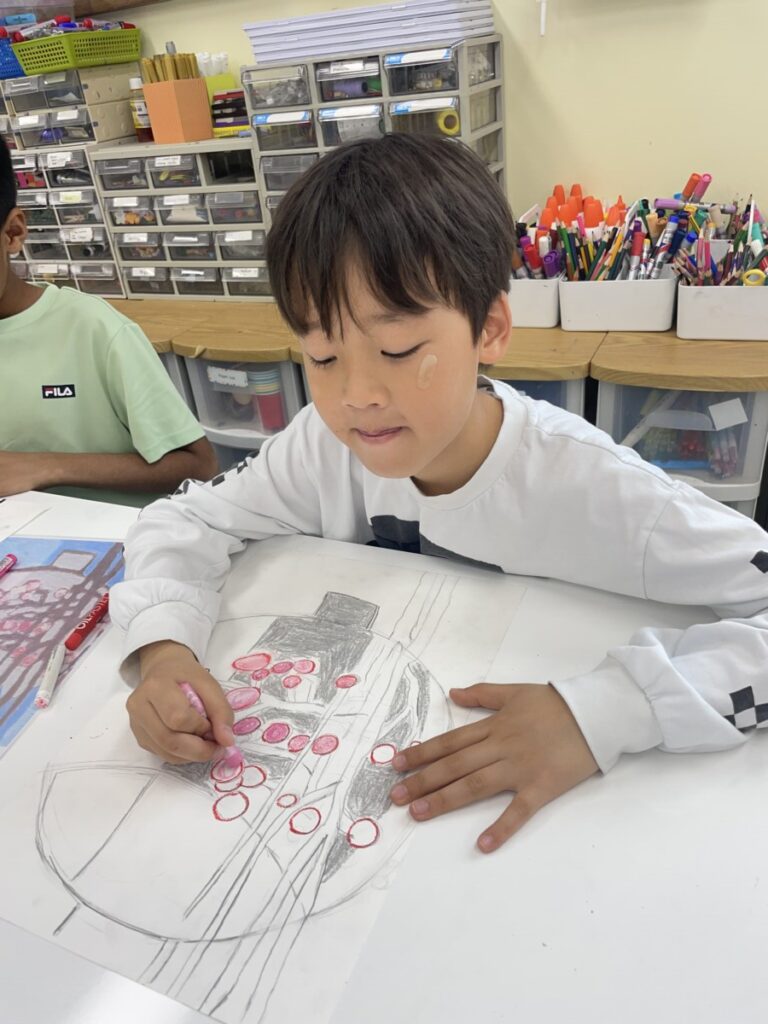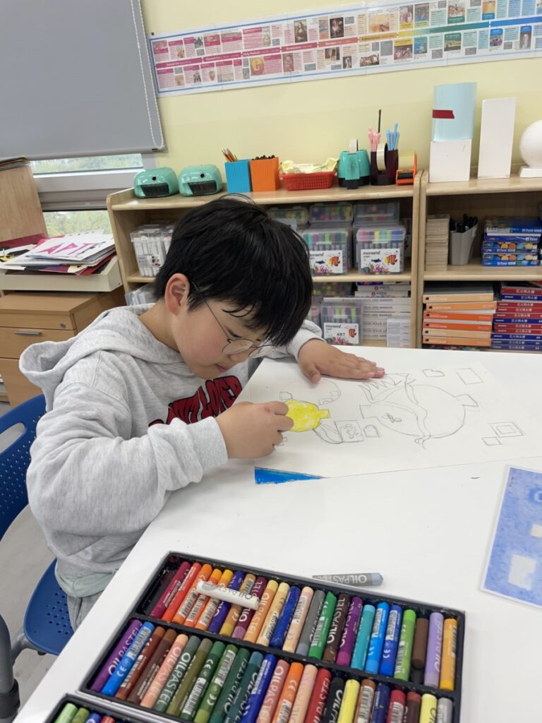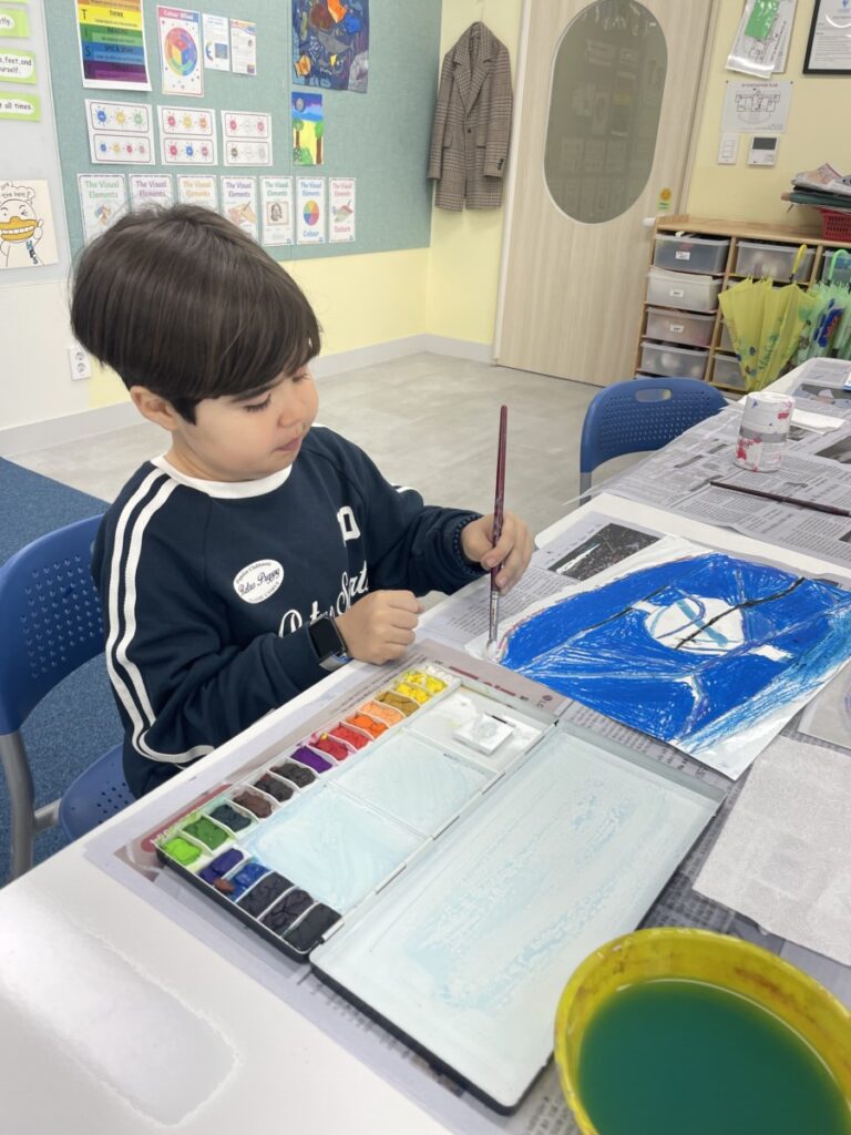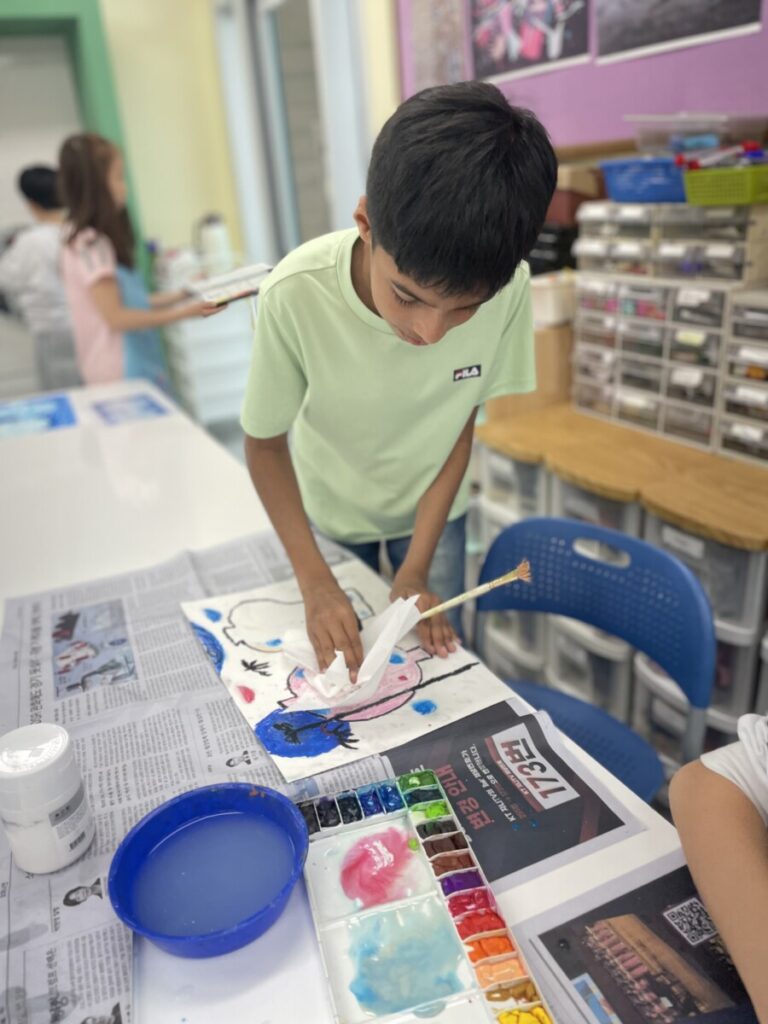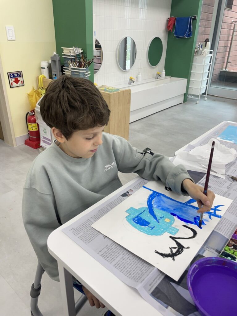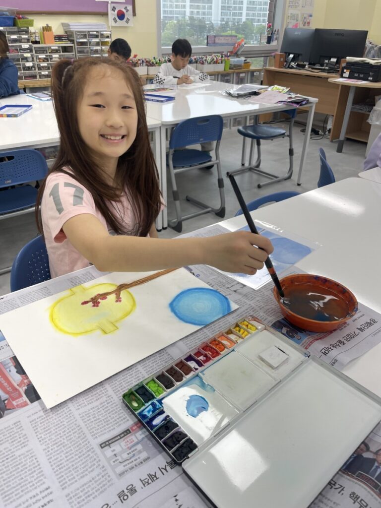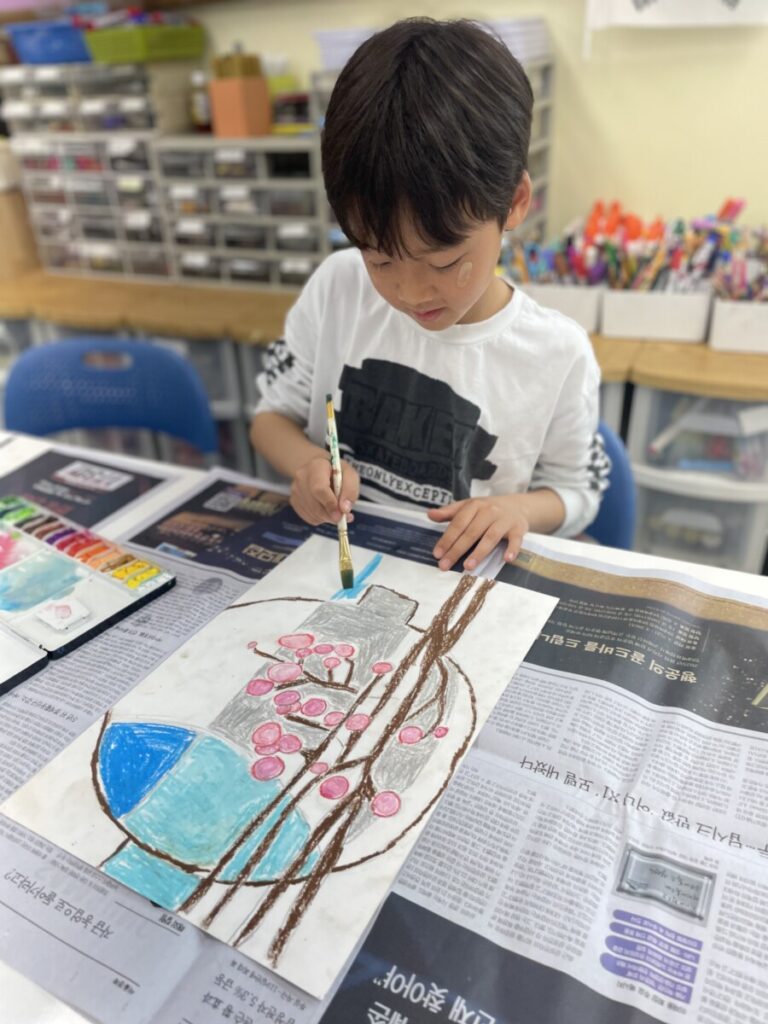 Building on last week’s lesson, the children added colour and detail to their own interpretations of Kim Whanki’s paintings, inspired by the masterpiece they had chosen. They carefully painted the remaining parts, thoughtfully using soft colours, dots, and lines just like the artist did.