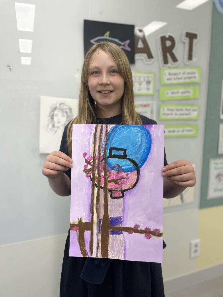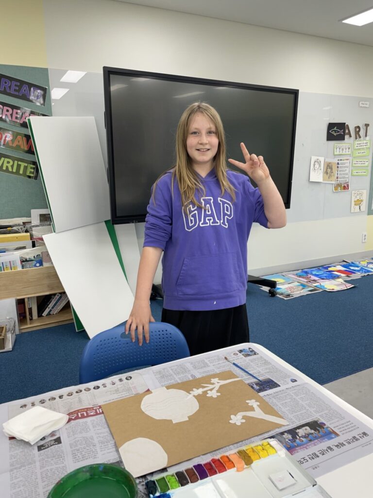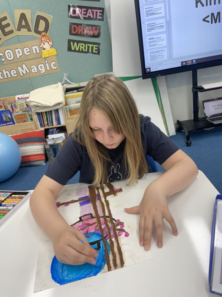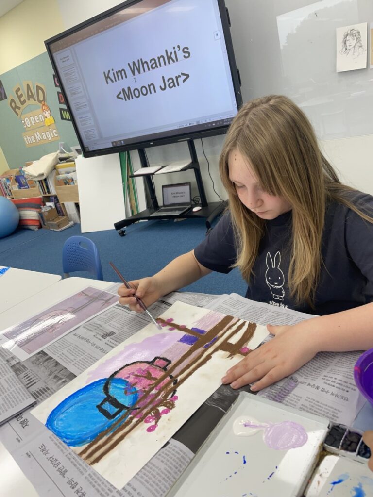 This week in art class, the Year 5–6 students continued their exploration of Kim Whanki’s beautiful artwork.