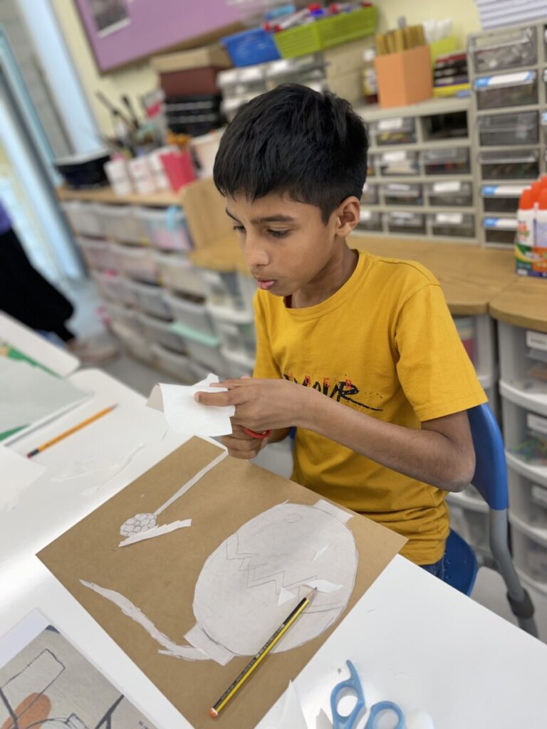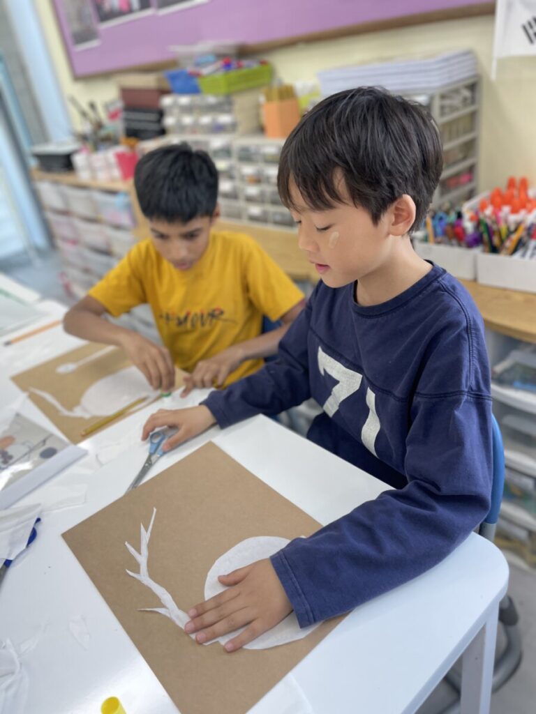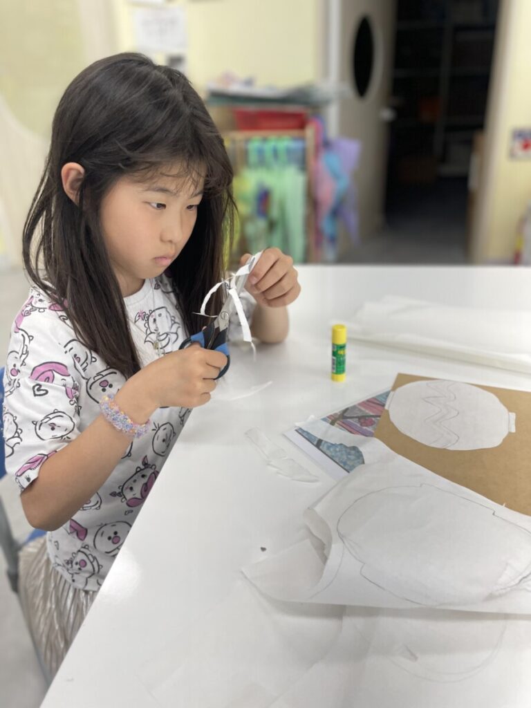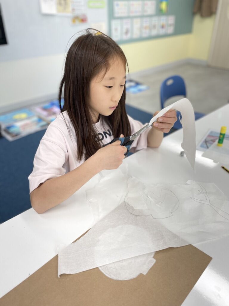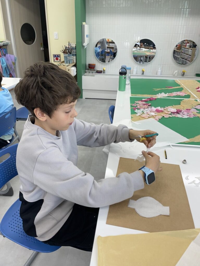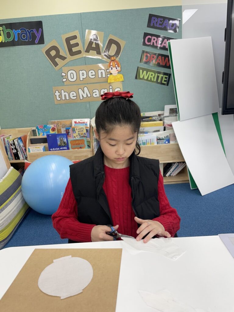 In addition to finishing their paintings, we began a new activity inspired by Kim Whanki’s famous Moon Jar series. Using a Korean traditional paper, the students cut and arranged pieces to create their own white moon jars. This collage project allowed them to express the gentle shapes and peaceful feeling of the moon jar in a tactile, hands-on way.