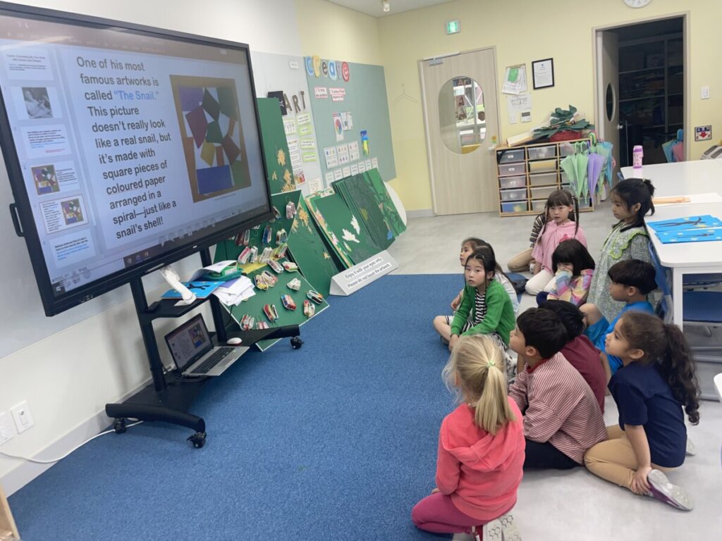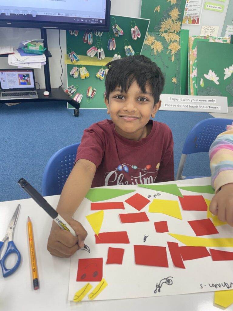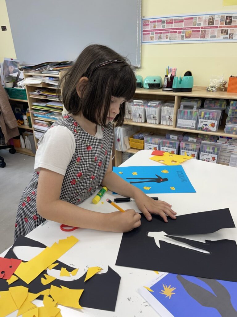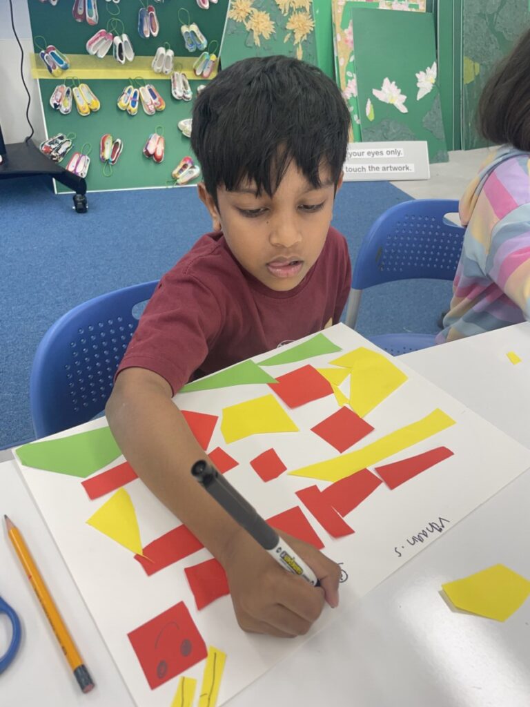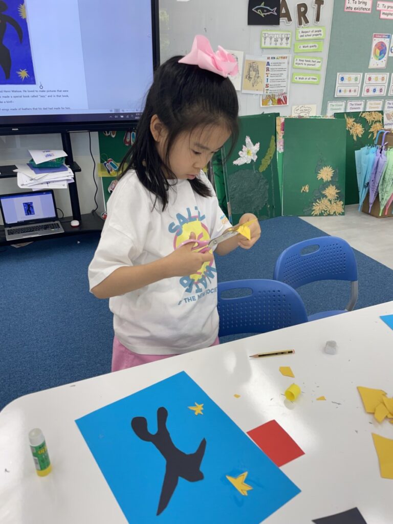 They cut out bold shapes to make figures like Icarus flying in the sky or colourful snails using squares and curves. Through this fun activity, they practiced creativity, shape recognition, and composition—just like Matisse did!