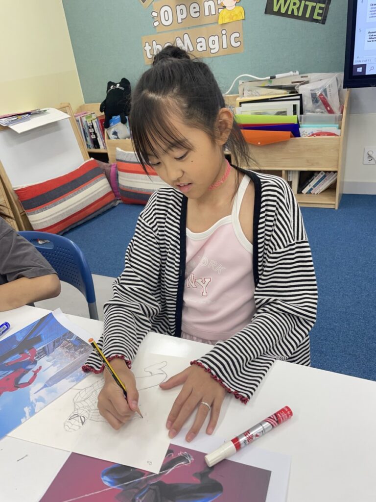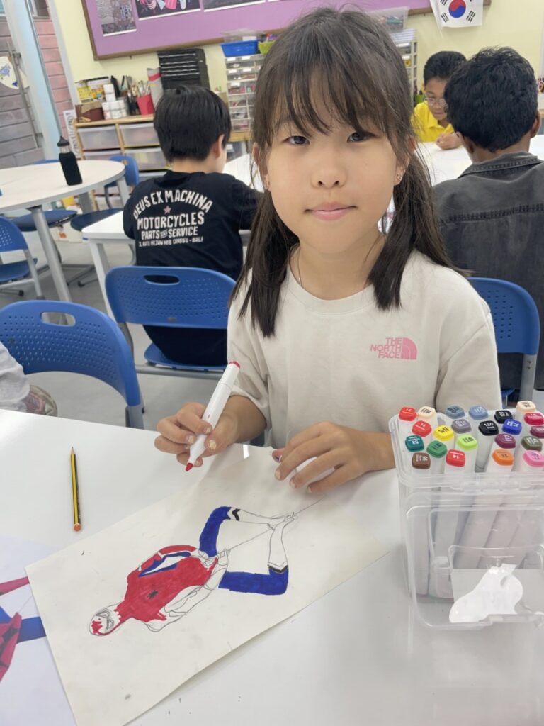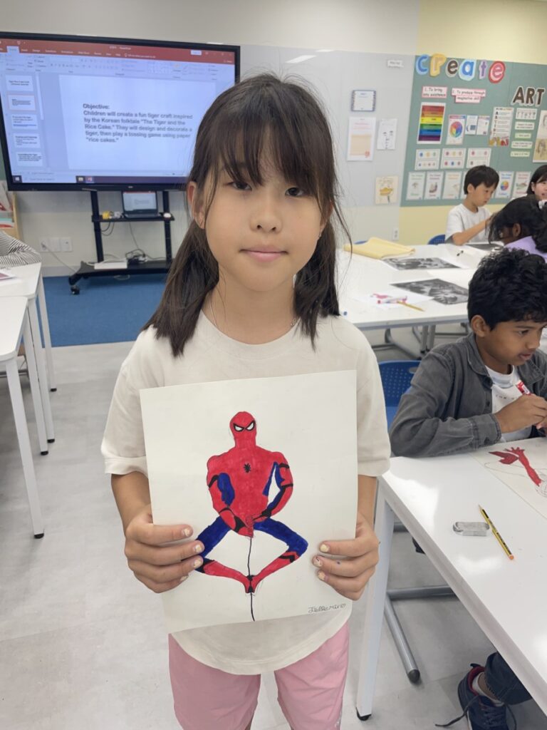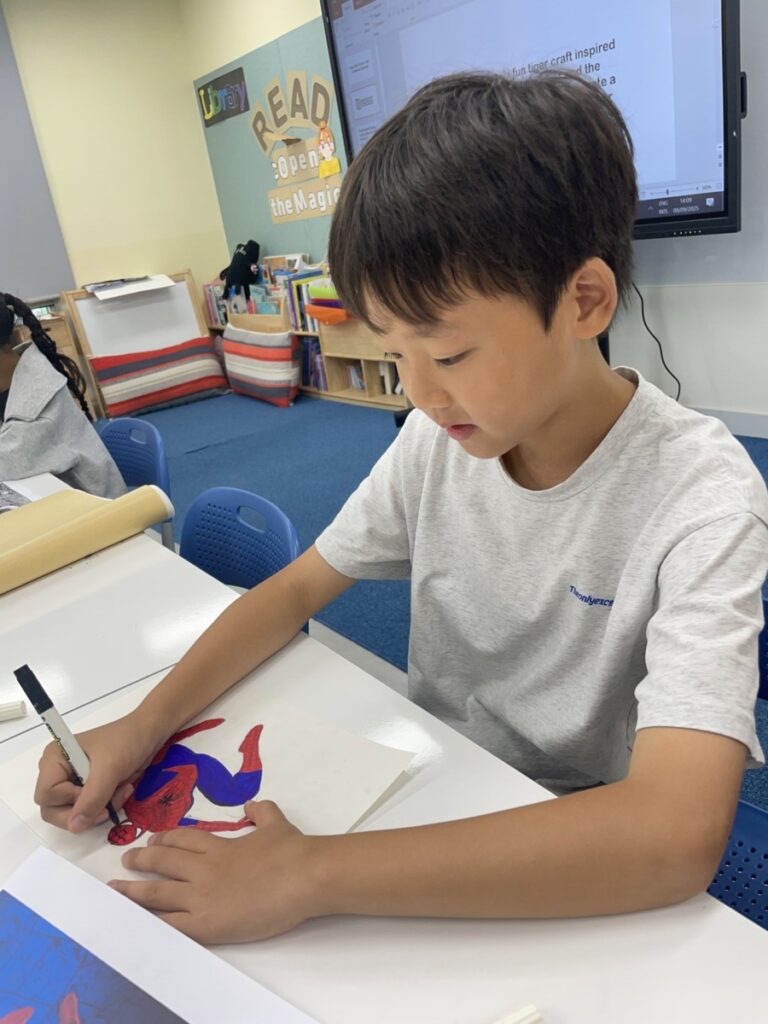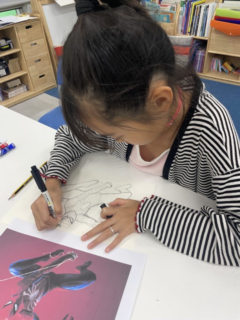 This week, our Year 5–6 students continued exploring the theme of “Spider-Man in Action.” They practised drawing Spider-Man in a variety of dynamic poses and, after completing their drawings, selected different background images to place their characters against. This created powerful, movie-like scenes of Spider-Man swinging and clinging to the city.