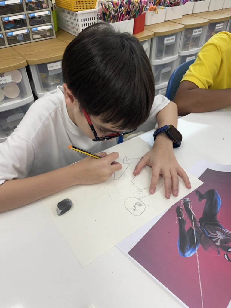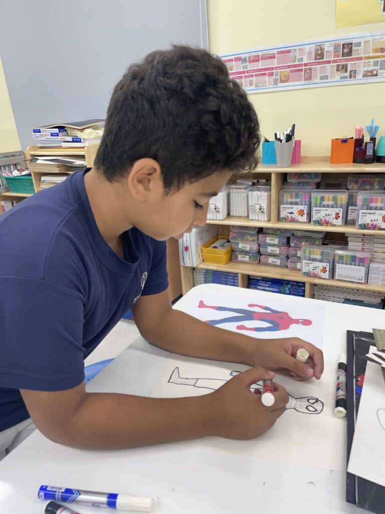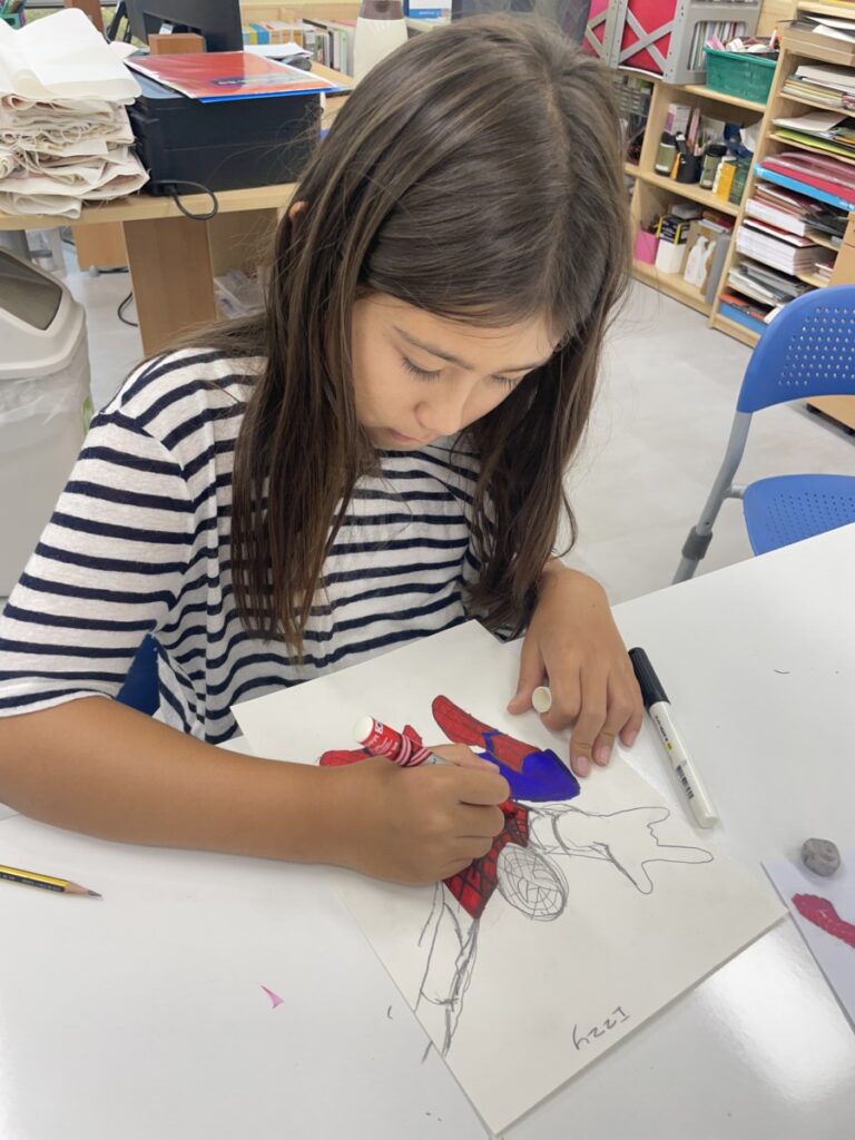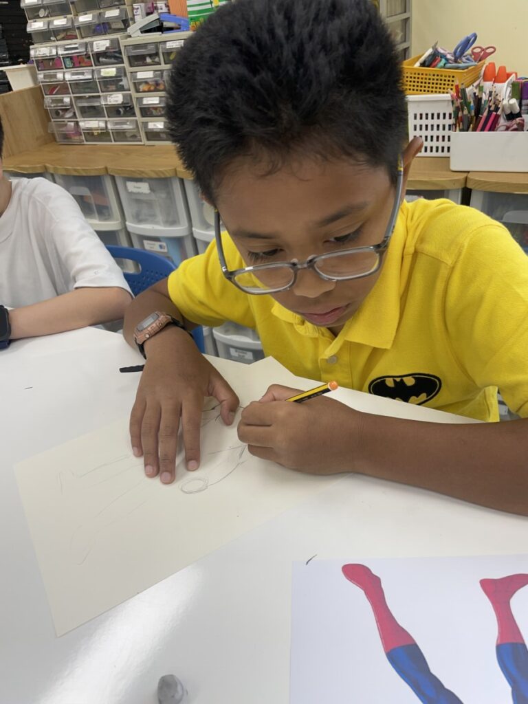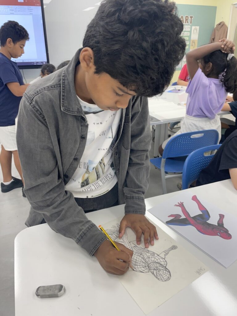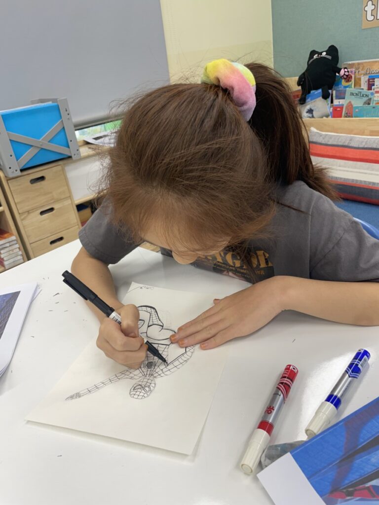 This week, our Year 5–6 students continued exploring the theme of “Spider-Man in Action.” They practised drawing Spider-Man in a variety of dynamic poses and, after completing their drawings, selected different background images to place their characters against. This created powerful, movie-like scenes of Spider-Man swinging and clinging to the city.