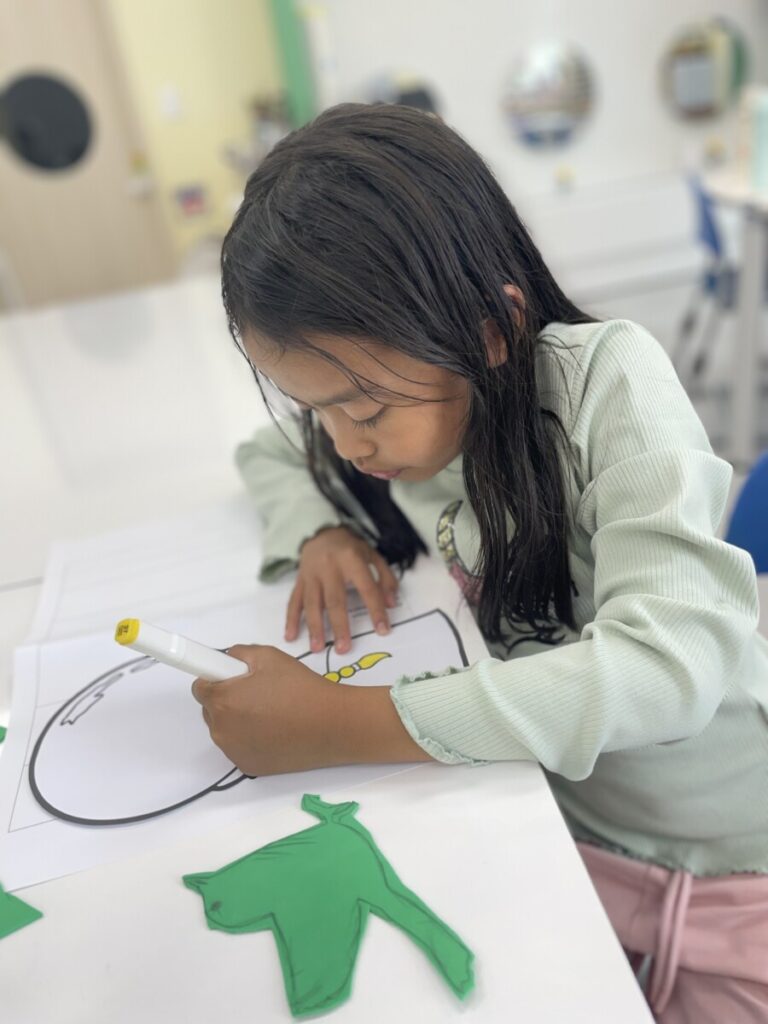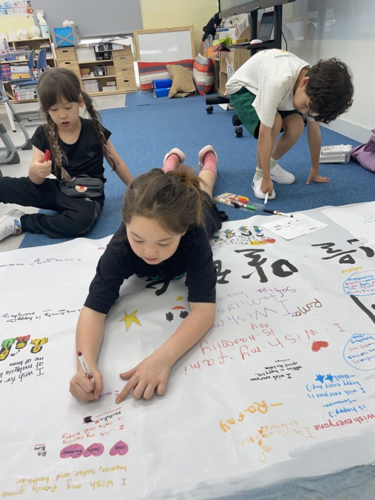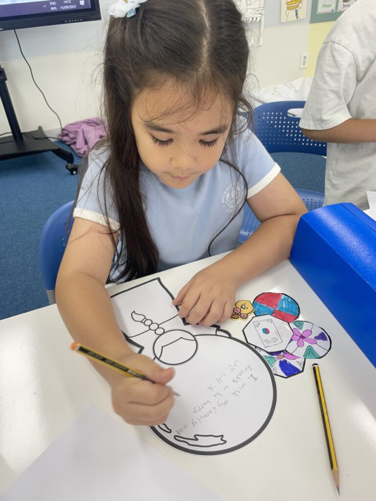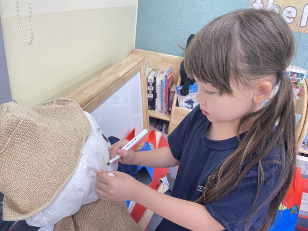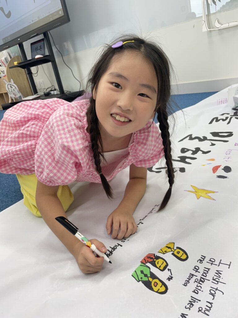 In celebration of Chuseok, the children took part in a special cultural art activity. They began by writing their wishes to the full moon, expressing their hopes in both words and drawings. Together, they decorated a scarecrow by adding facial features such as eyes, a nose, and a mouth, as well as designing colourful buttons. To complete the character, the scarecrow was dressed with gloves and a hat.