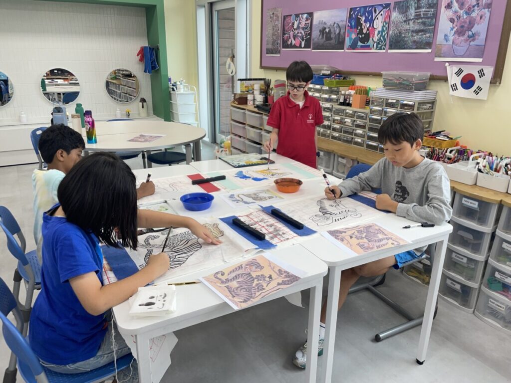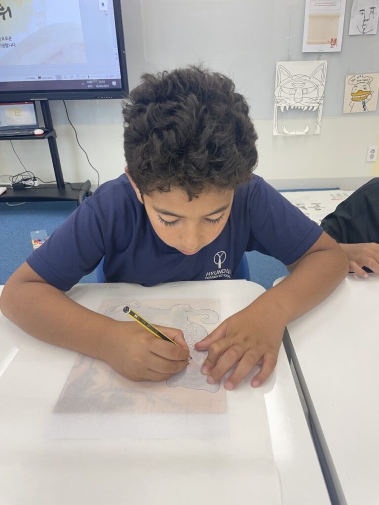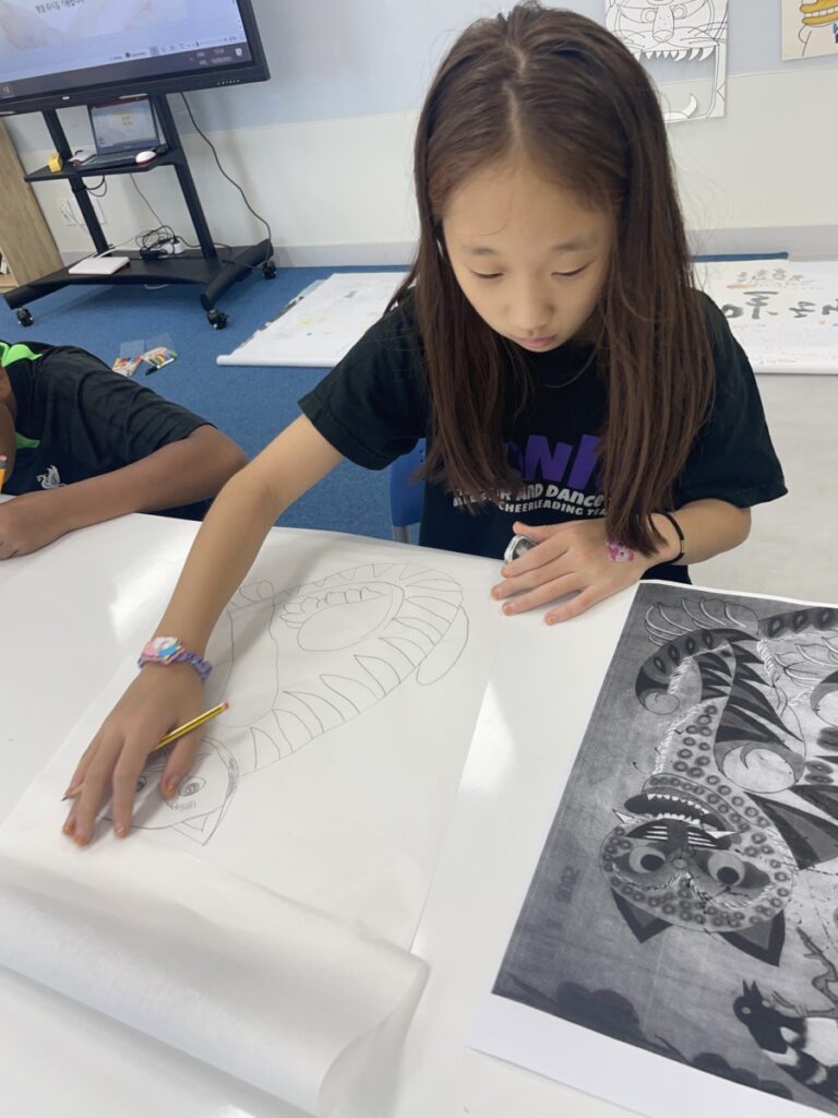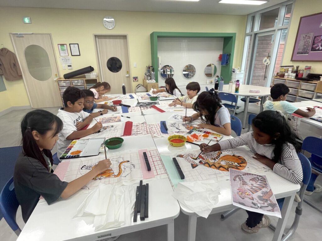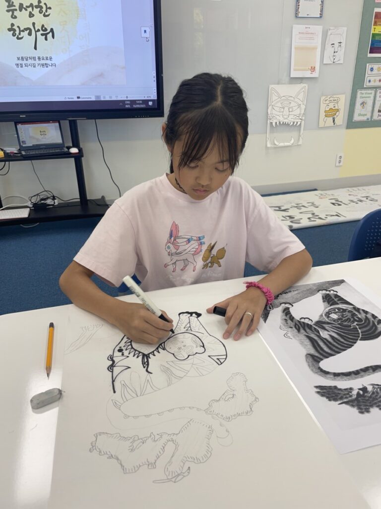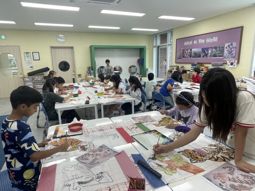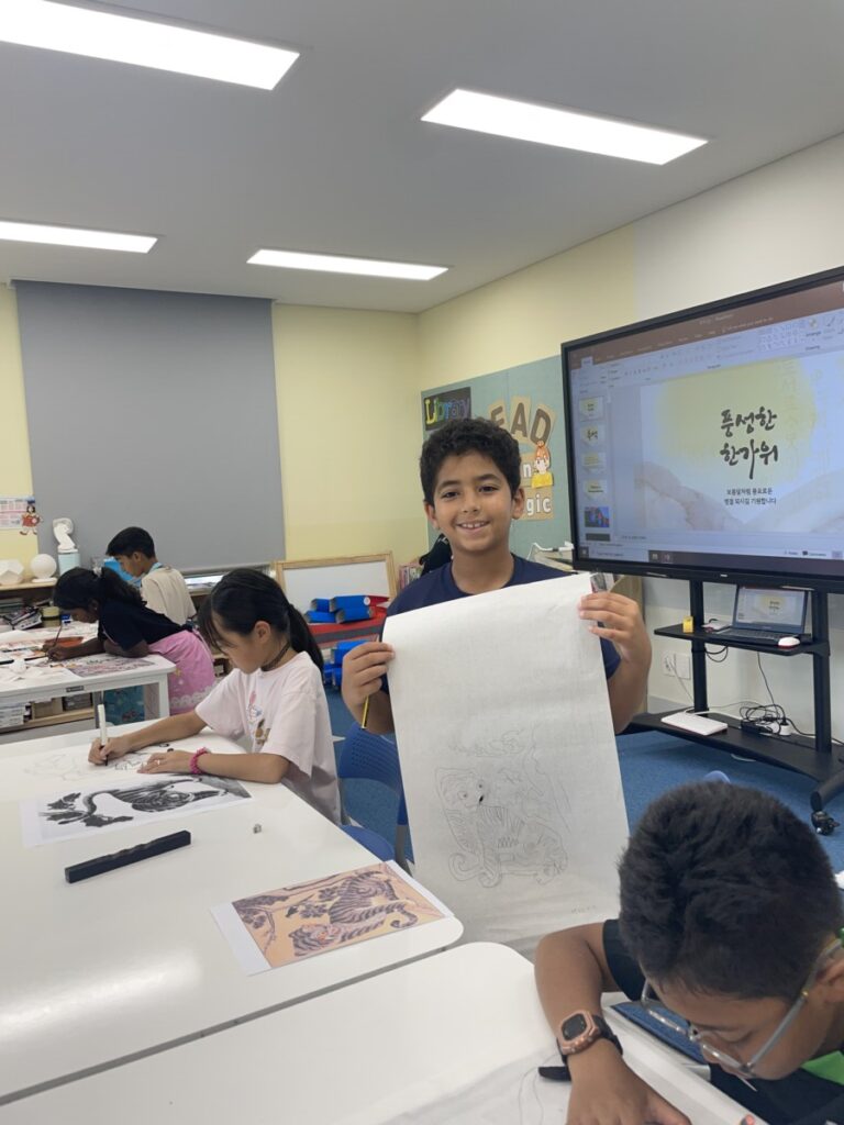 To celebrate Chuseok, the Year 5–6 students created their own versions of the traditional Korean folk painting “Magpie and Tiger.” Using traditional materials such as Korean rice paper (hanji) and black ink with brushes, they expressed their unique feelings and creativity through their artworks.