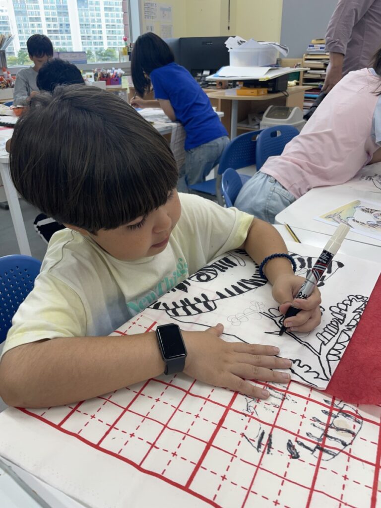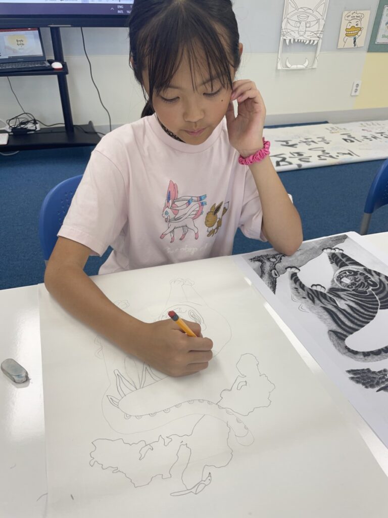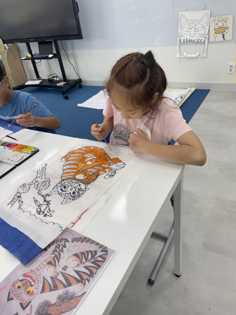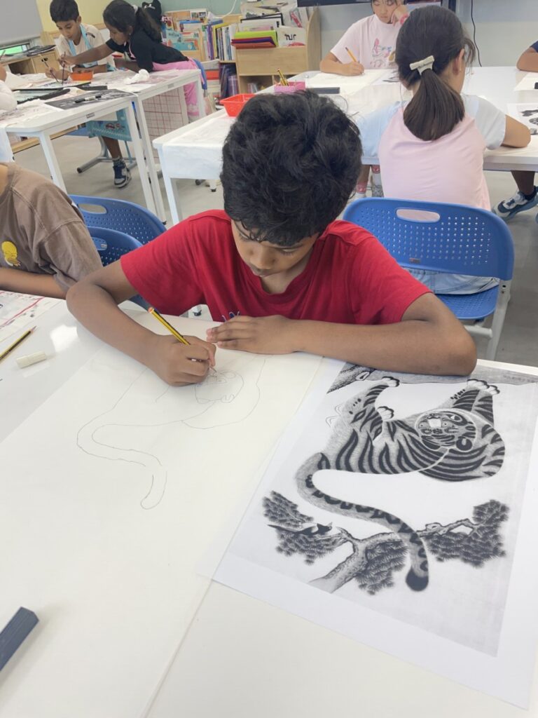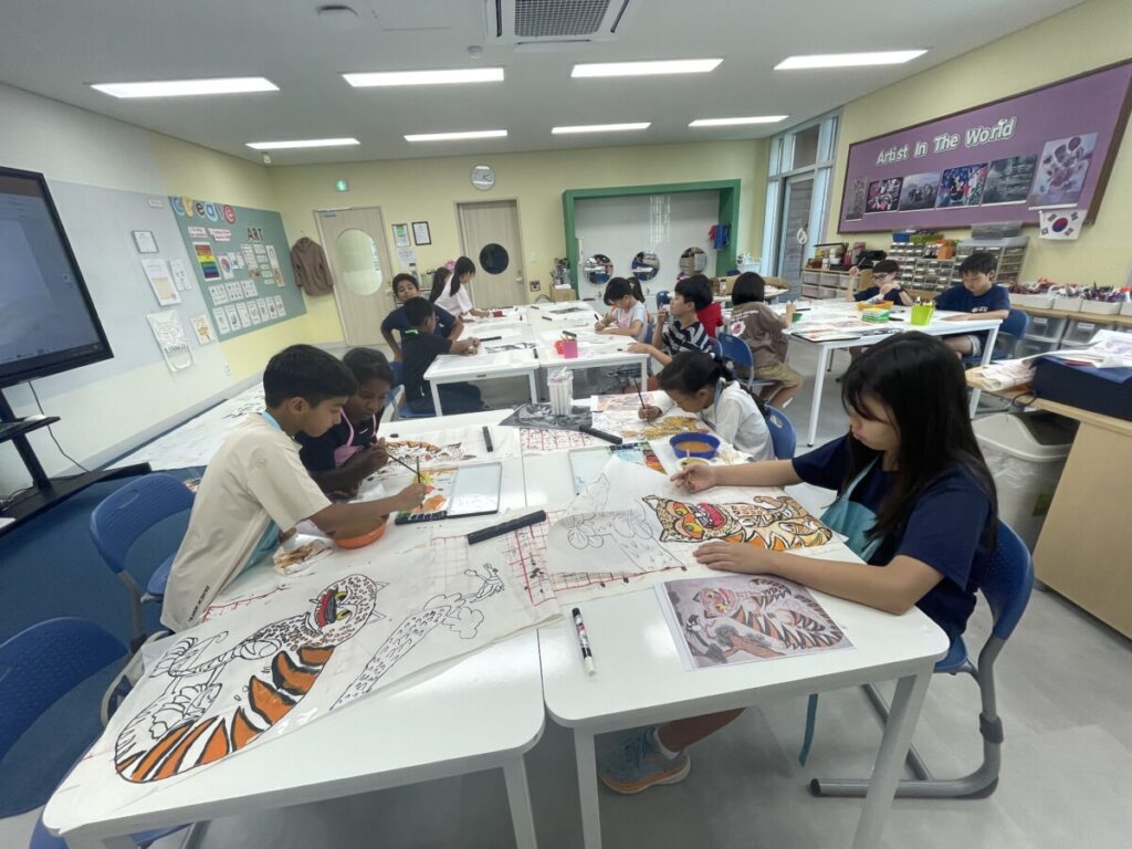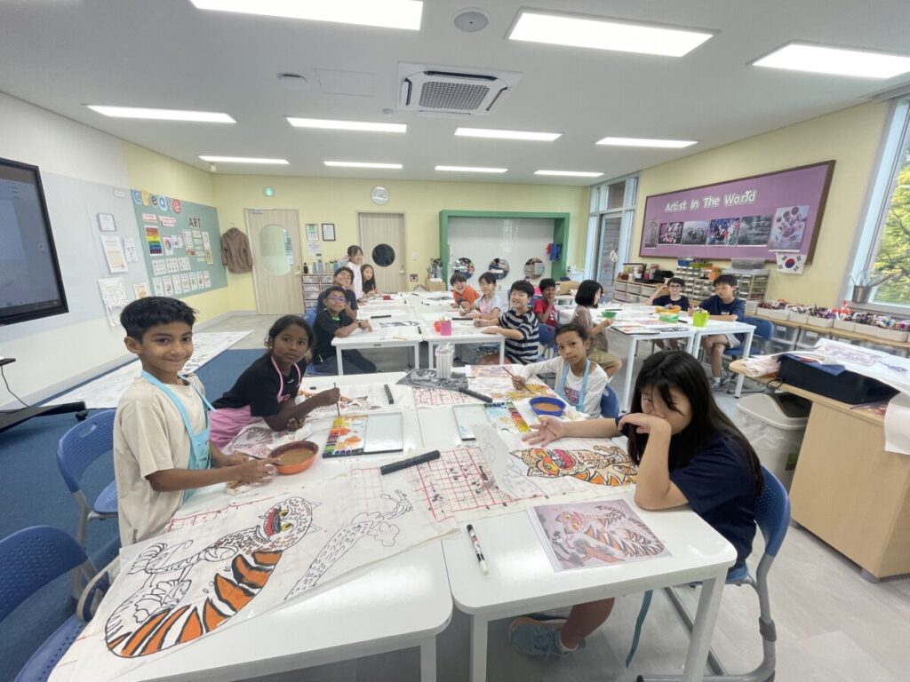 To celebrate Chuseok, the Year 5–6 students created their own versions of the traditional Korean folk painting “Magpie and Tiger.” Using traditional materials such as Korean rice paper (hanji) and black ink with brushes, they expressed their unique feelings and creativity through their artworks.