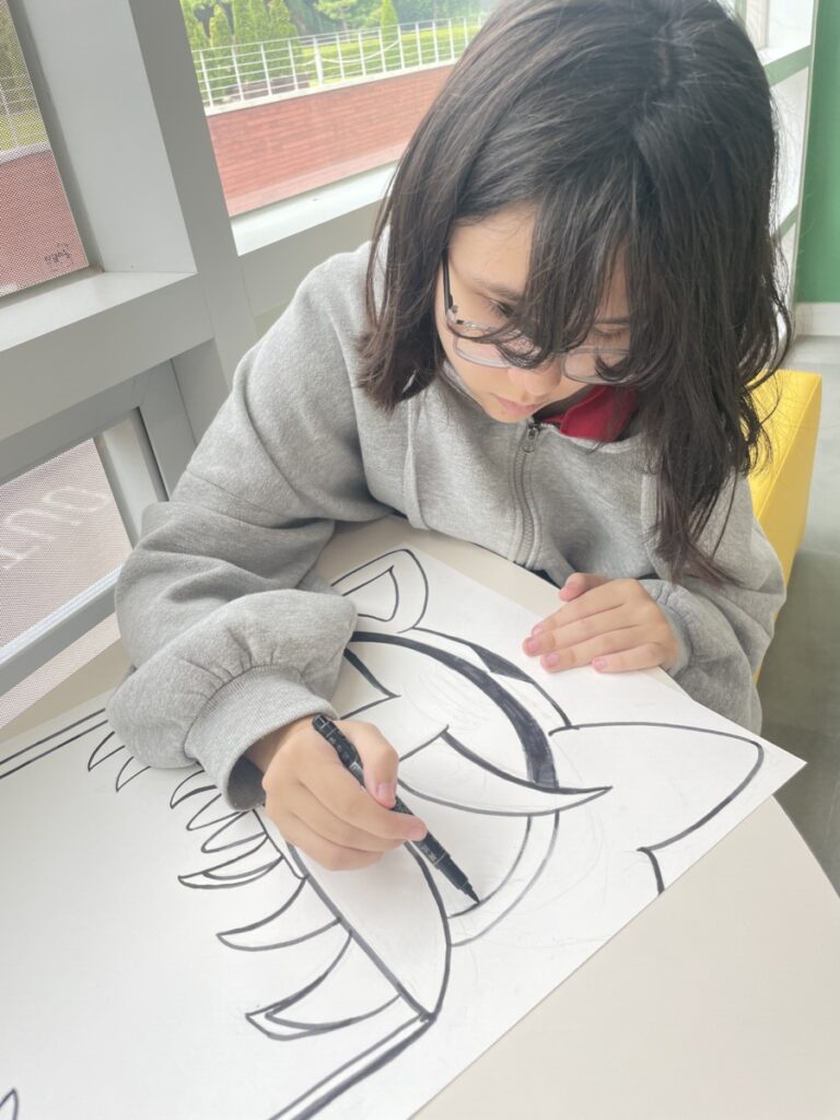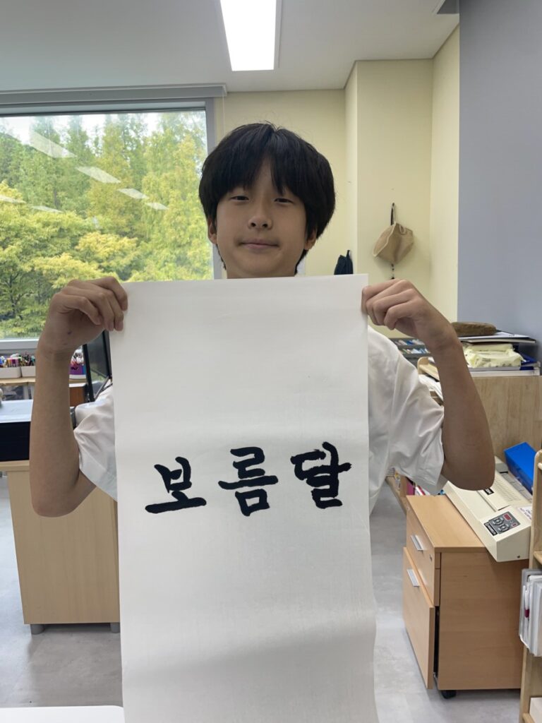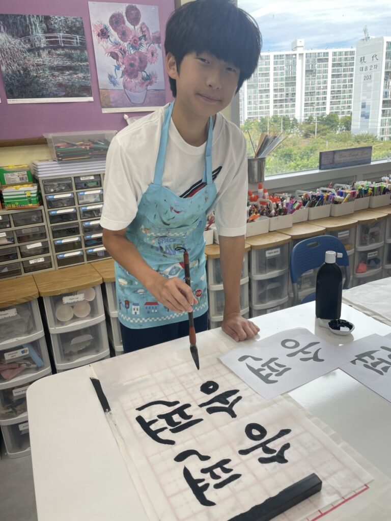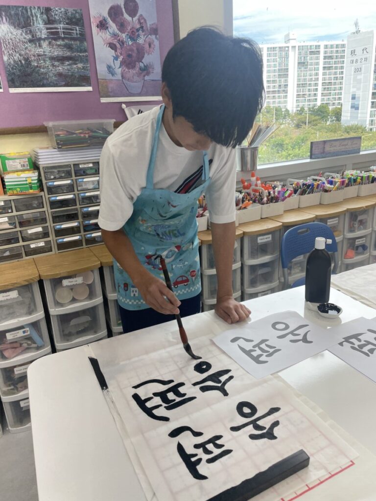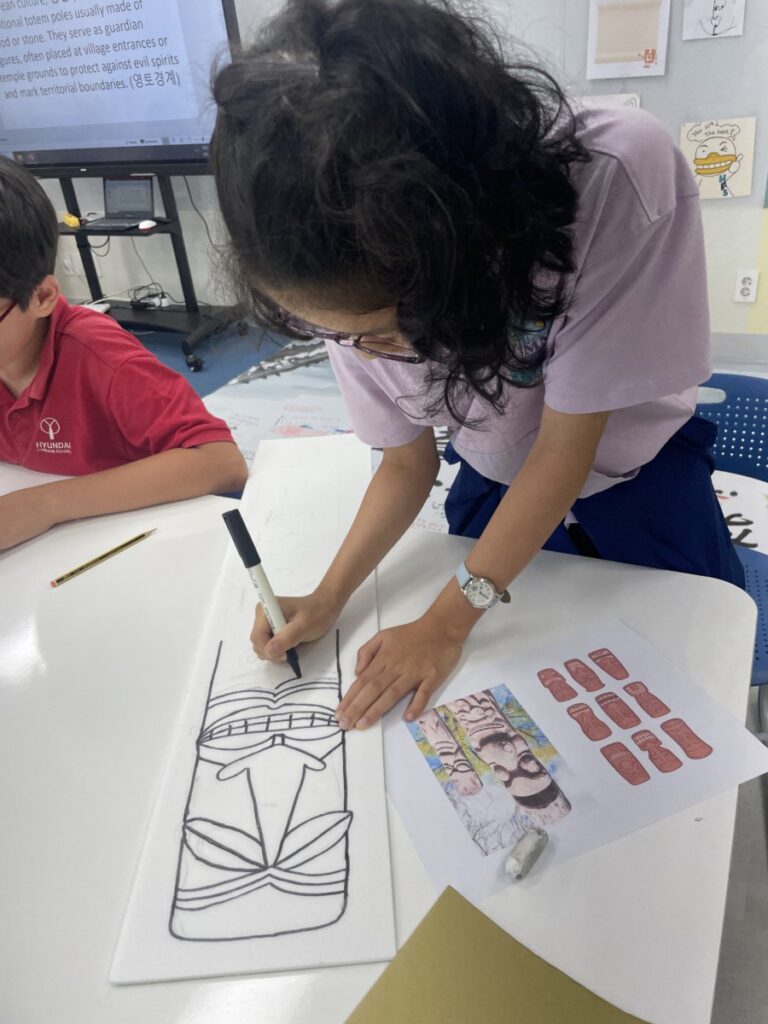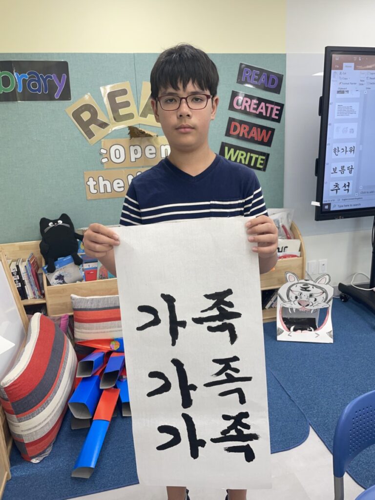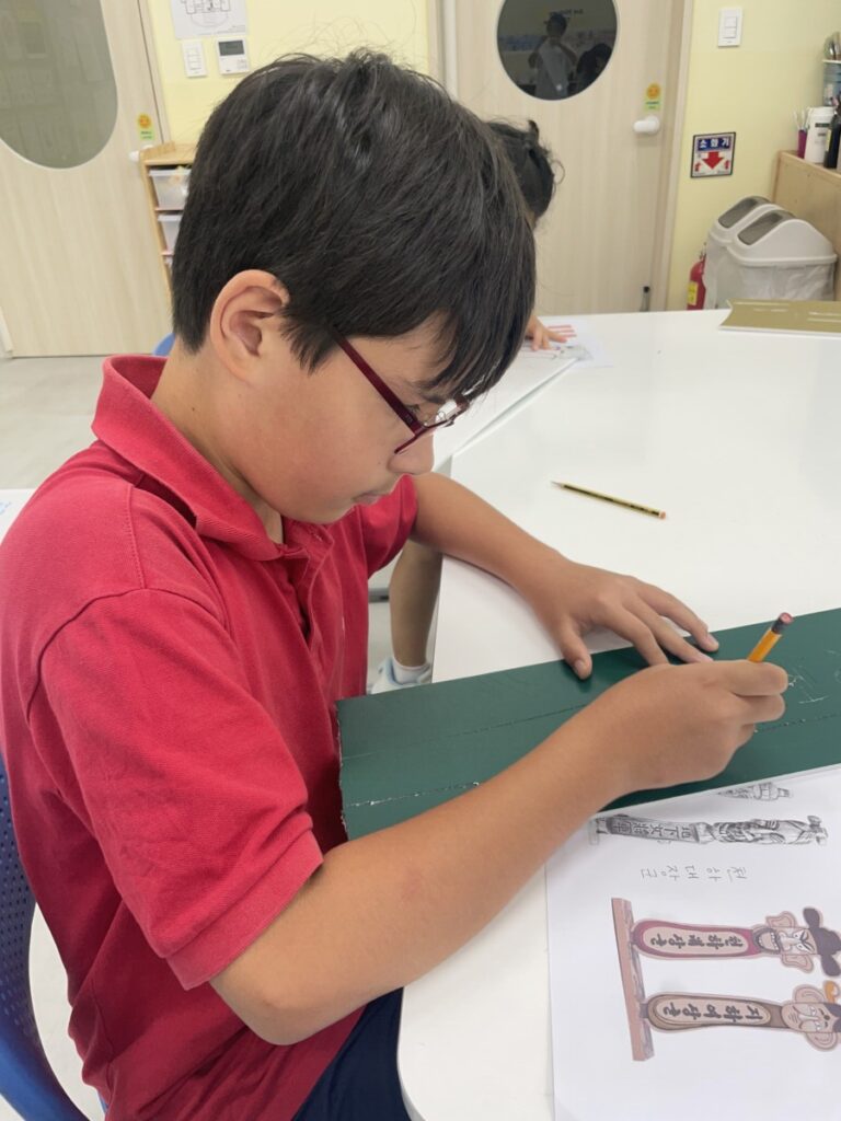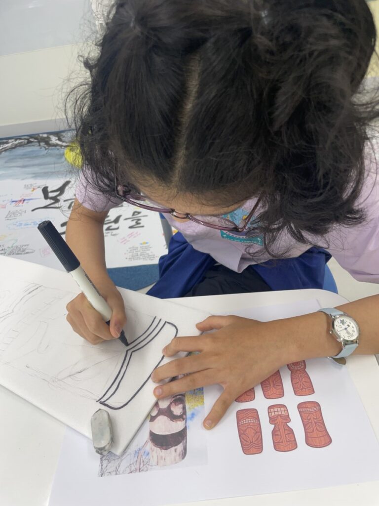 To celebrate Chuseok, we learned words related to the holiday such as Chuseok, family, full moon, wish, and Hangawi. The children practiced writing these words with a traditional Korean brush, gaining a deeper understanding of Korean culture. We also explored the meaning of Jangseung (traditional totem poles) and each student expressed their own interpretation by creating character drawings of Jangseung. I hope this time helped the children build a stronger appreciation and understanding of Korean culture.