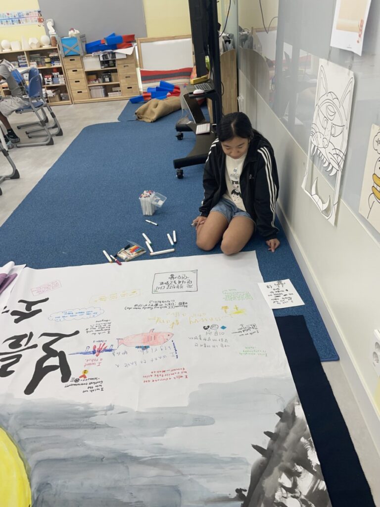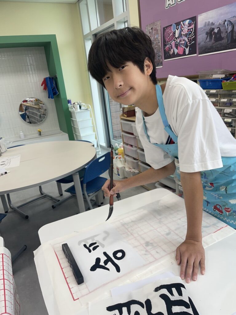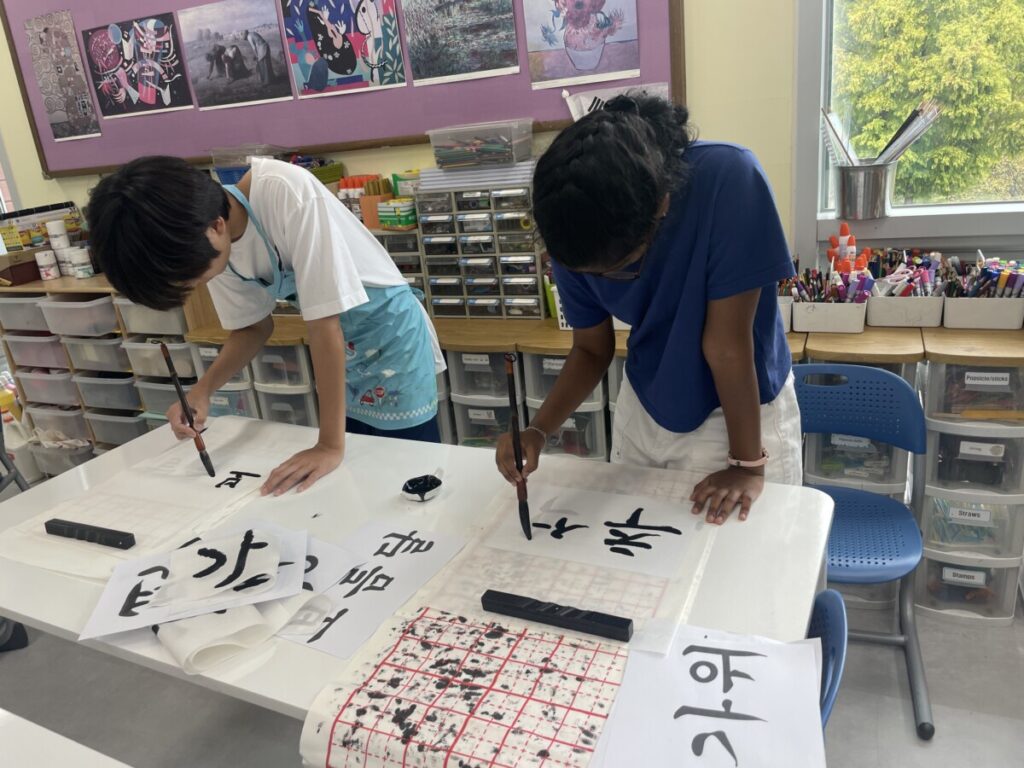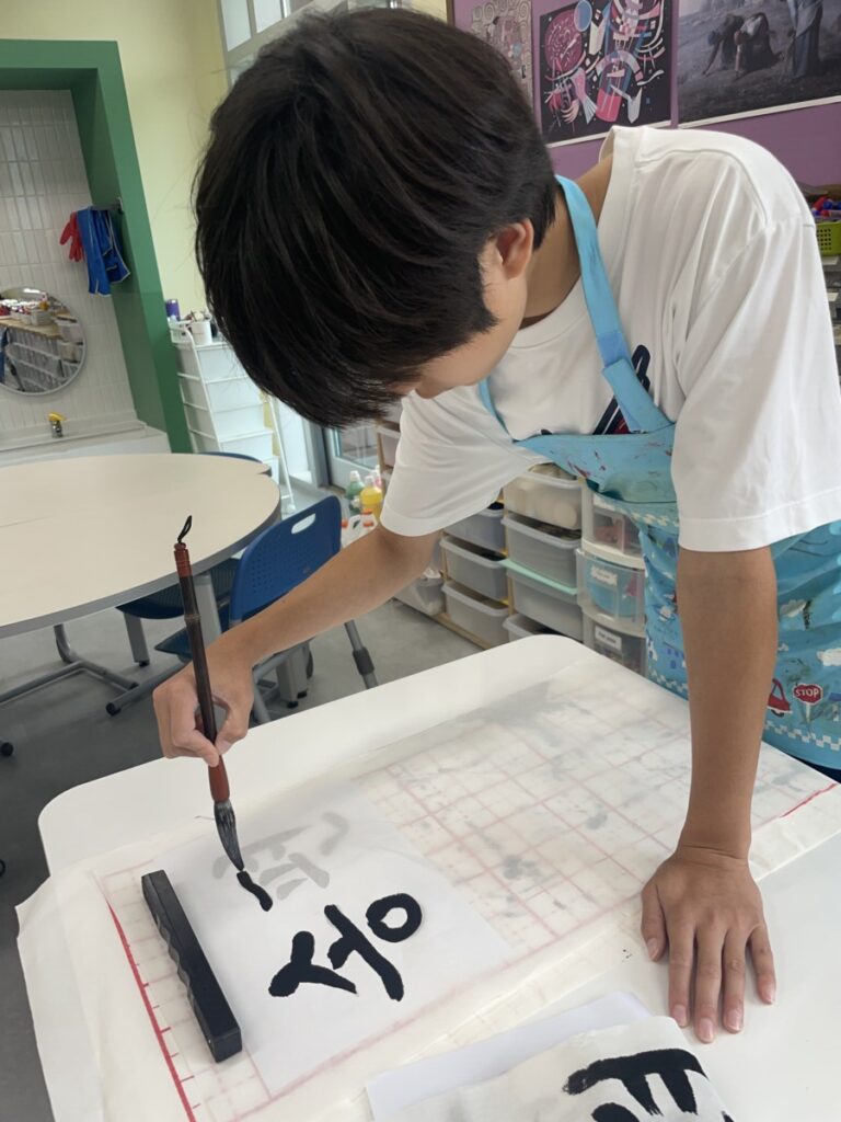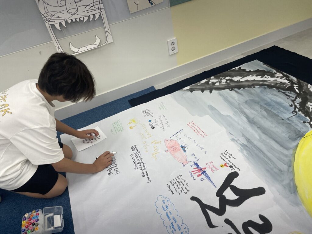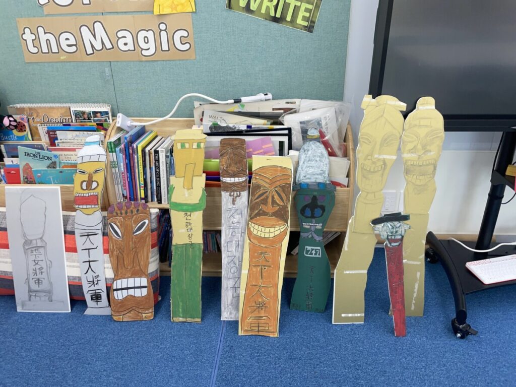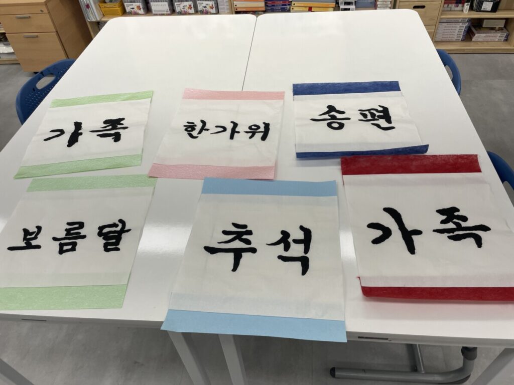 To celebrate Chuseok, we learned words related to the holiday such as Chuseok, family, full moon, wish, and Hangawi. The children practiced writing these words with a traditional Korean brush, gaining a deeper understanding of Korean culture. We also explored the meaning of Jangseung (traditional totem poles) and each student expressed their own interpretation by creating character drawings of Jangseung. I hope this time helped the children build a stronger appreciation and understanding of Korean culture.