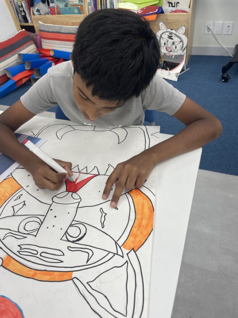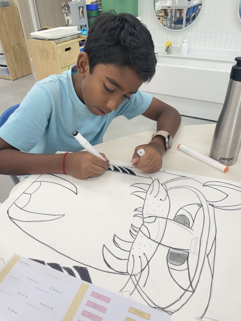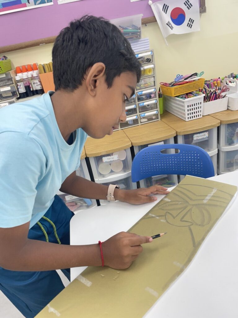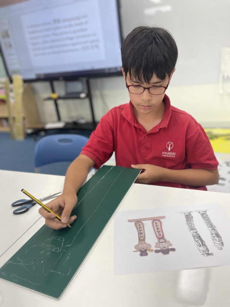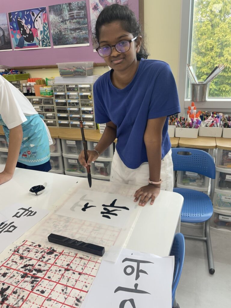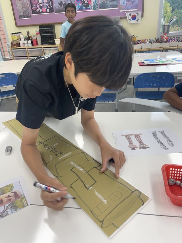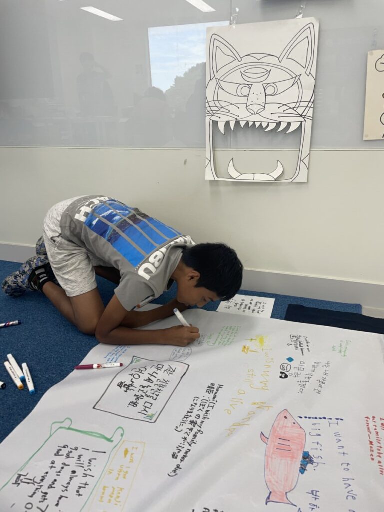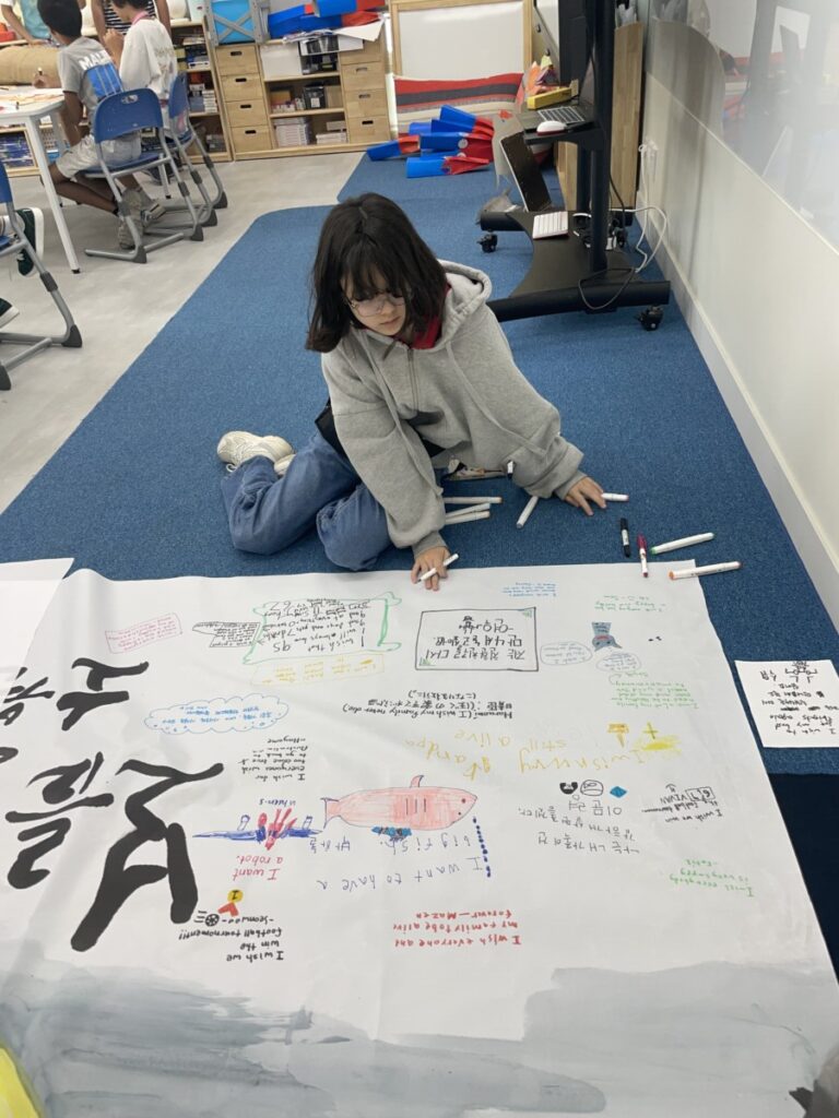 To celebrate Chuseok, we learned words related to the holiday such as Chuseok, family, full moon, wish, and Hangawi. The children practiced writing these words with a traditional Korean brush, gaining a deeper understanding of Korean culture. We also explored the meaning of Jangseung (traditional totem poles) and each student expressed their own interpretation by creating character drawings of Jangseung. I hope this time helped the children build a stronger appreciation and understanding of Korean culture.
